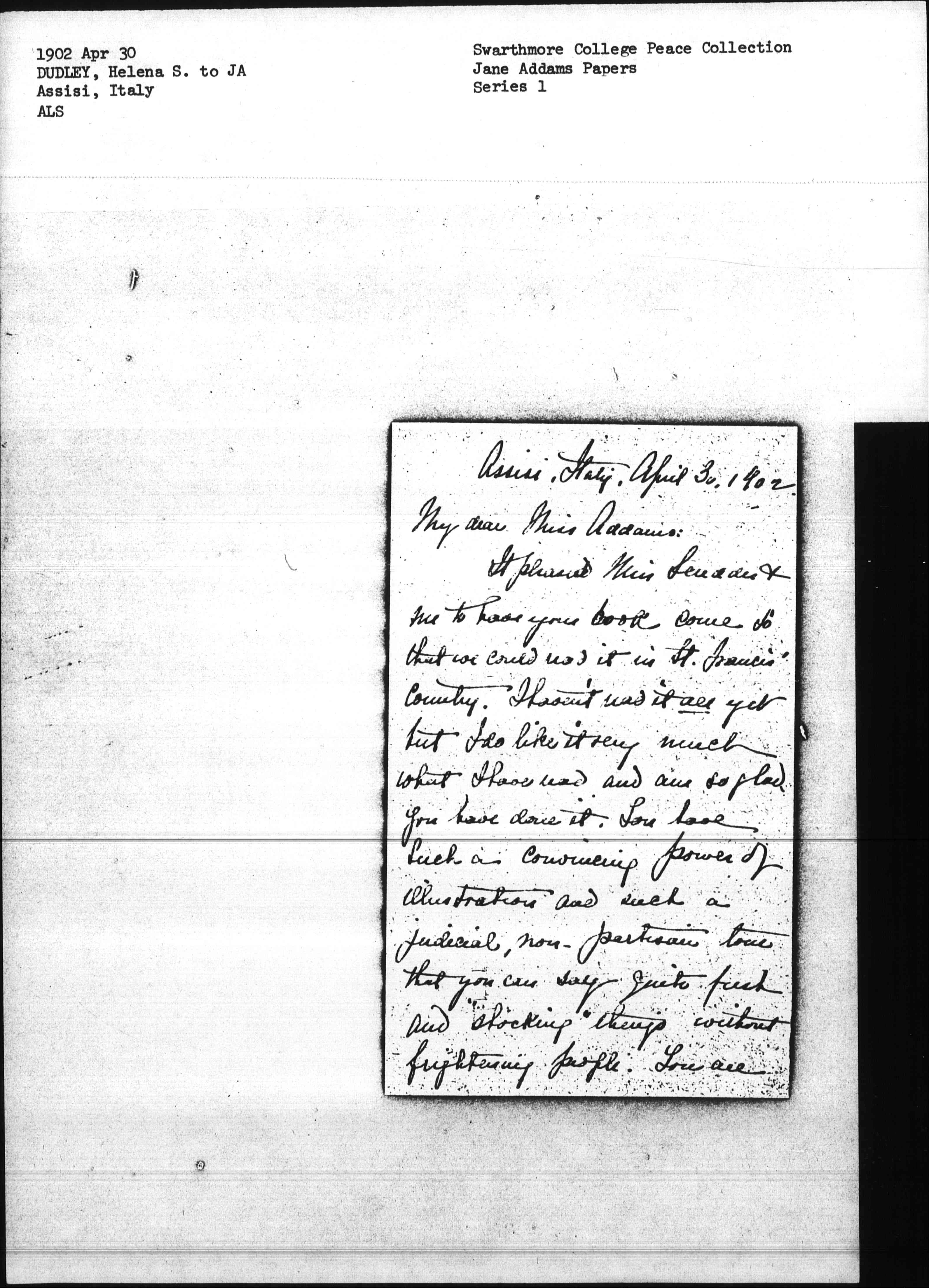 It pleased Miss Scudder & me to have your book come & that we could read it in St. Francis' country. I haven't read it all yet but I do like it very much what I have read and am so glad you have done it. You have such a convincing power of illustration and such a judicial, non-partisan tone that you can say quite fresh and "shocking" things without frightening people. You are [page 2] certainly a most persuasive lady! I am sure even the agents of the [Associated] Charities will feel the truth of all you say about our methods of Charity. Oh, it is so true and we are in such false relations often [even] at the Settlement with our poor neighbors. I am a good deal of a coward and when I can't give the material help that I see is needed I have a way of staying away [page 3] altogether, for friendly counsel seems a good deal of a mockery!