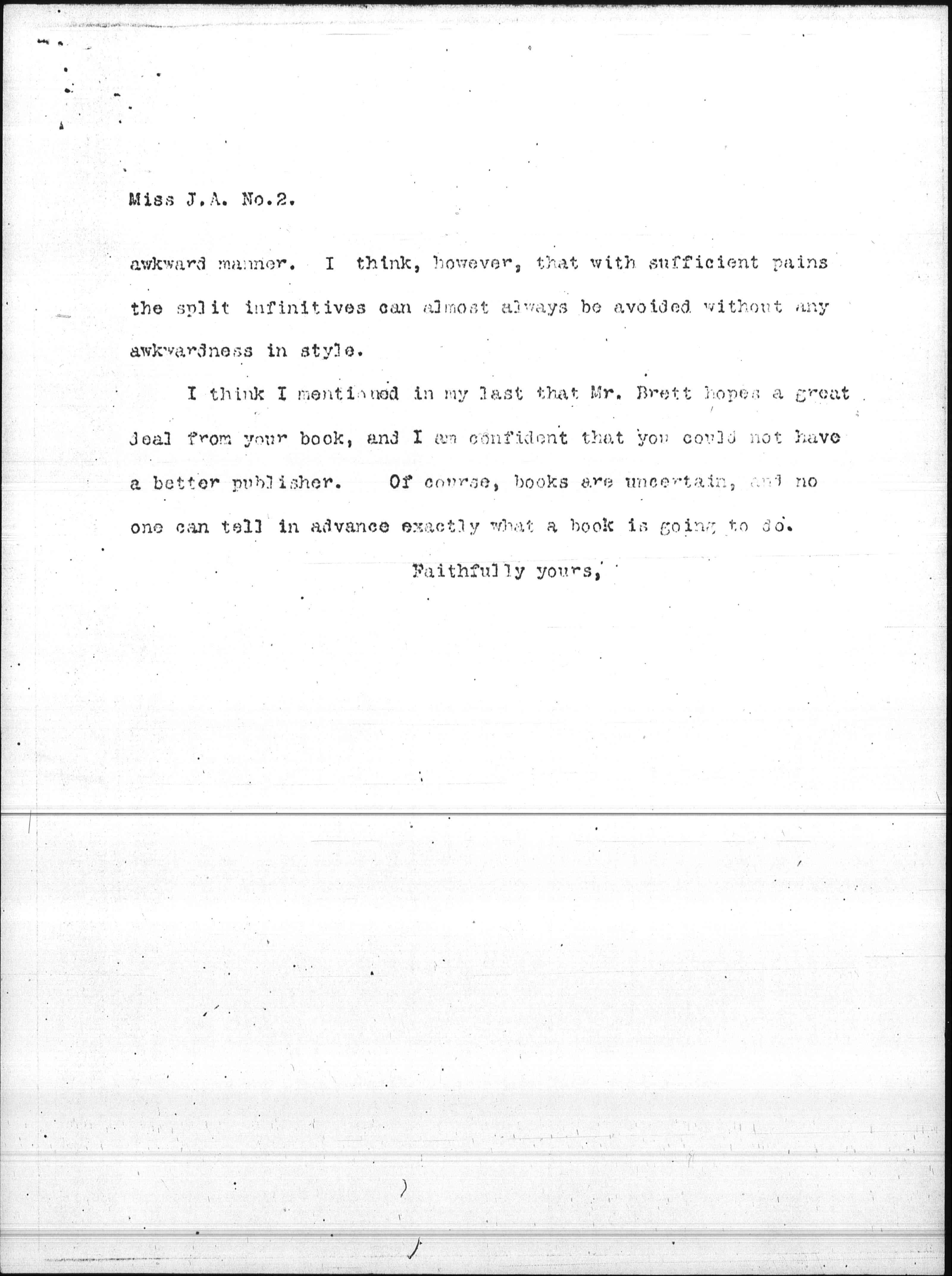I think I mentioned it in my last that Mr. Brett hopes a great deal from your book, and I am confident that you could not have a better publisher. Of course, books are uncertain, and no one can tell in advance exactly what a book is going to do.