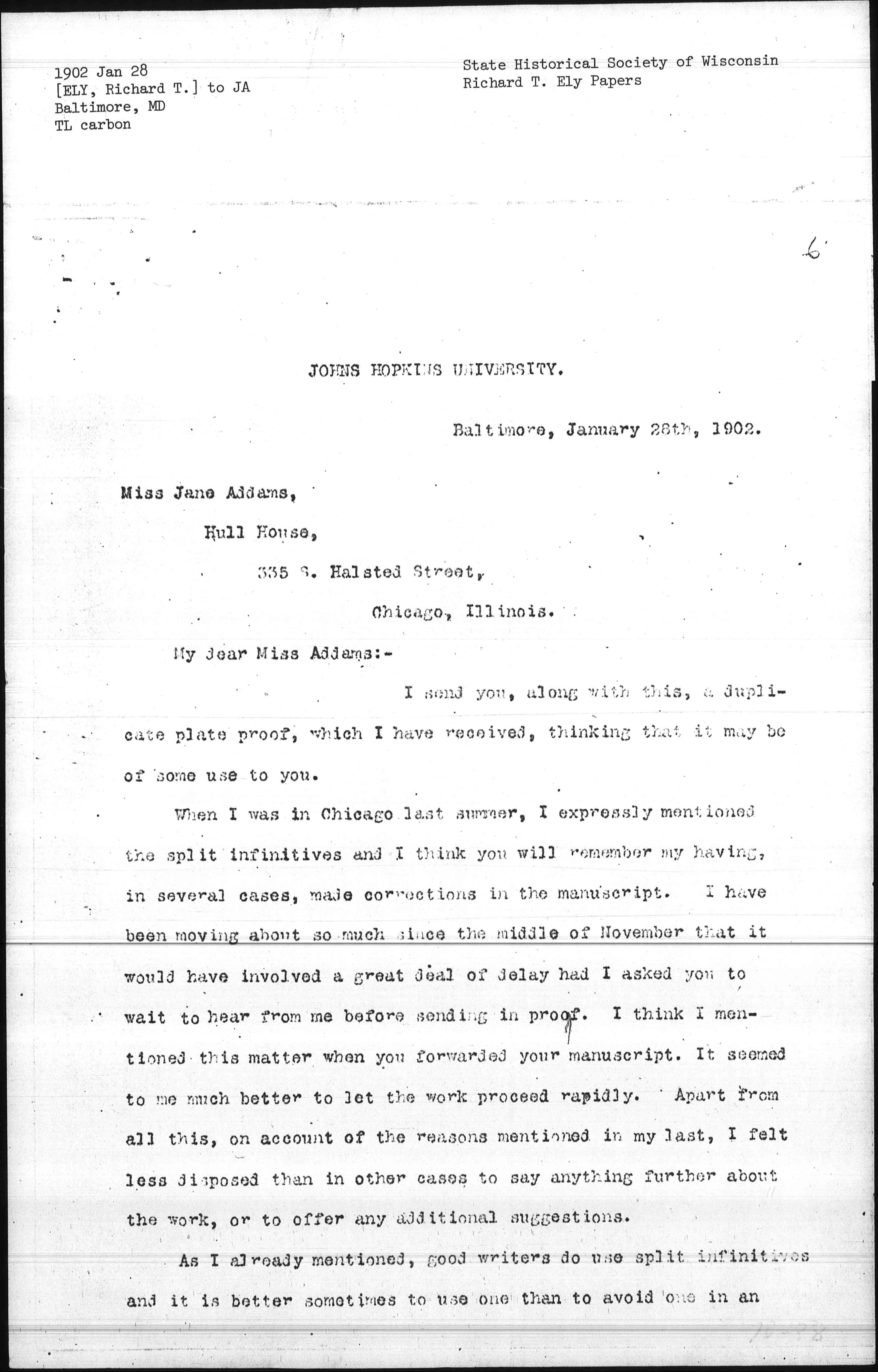When I was in Chicago last summer, I expressly mentioned the split infinitives and I think you will remember my having, in several cases, made corrections in the manuscript. I have been moving about so much since the middle of November that it would have involved a great deal of delay had I asked you to wait to hear from me before sending in proof. I think I mentioned this matter when you forwarded your manuscript. It seemed to be much better to let the work proceed rapidly. Apart from all this, on account of the reasons mentioned in my last, I felt less disposed than in other cases to say anything further about the work, or to offer any additional suggestions.