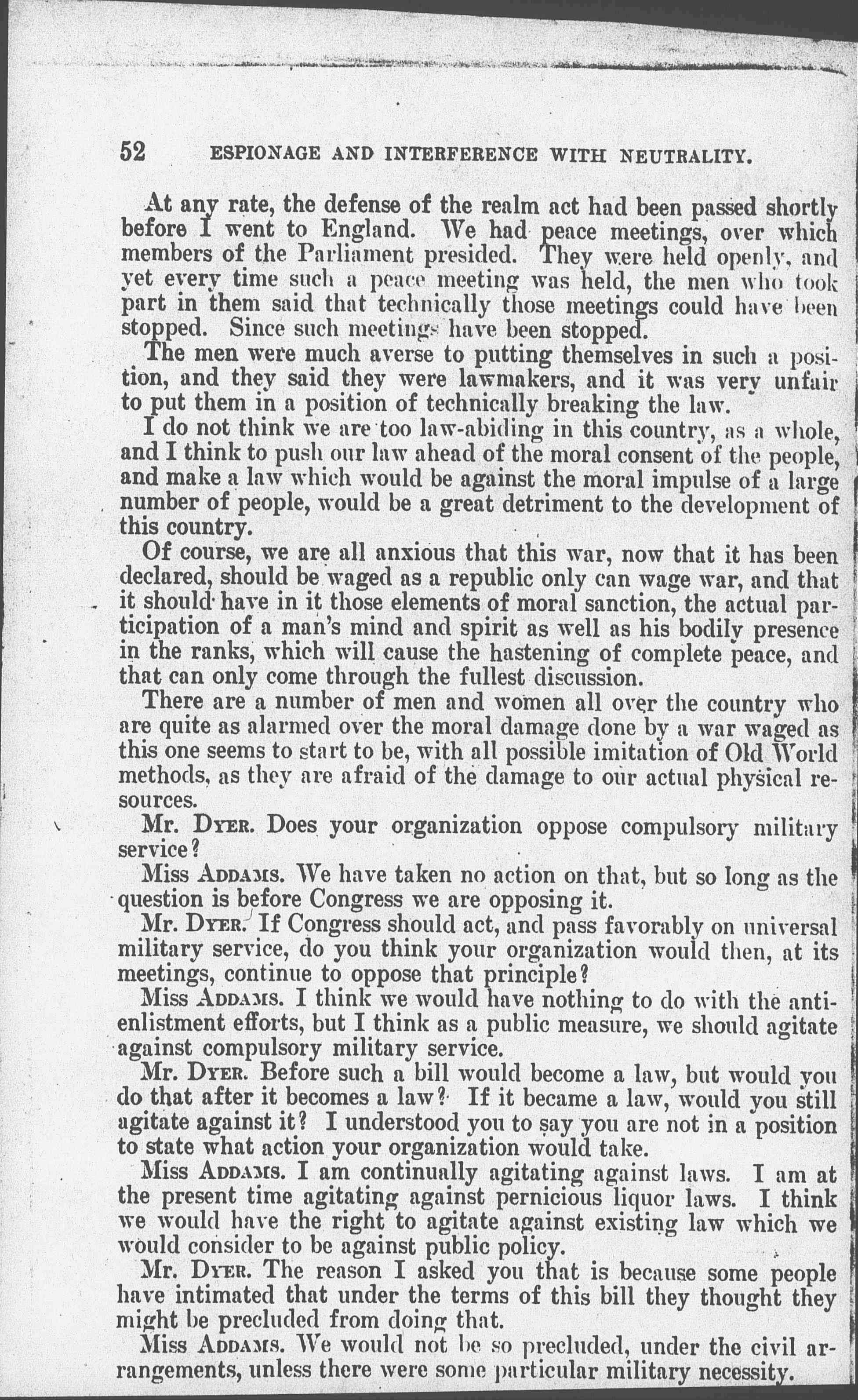 At any rate, the defense of the realm act had been passed shortly before I went to England. We had peace meetings, over which members of the Parliament presided. They were held openly, and yet every time such a peace meeting was held, the men who took part in them said that technically those meetings could have been stopped. Since such meetings have been stopped.