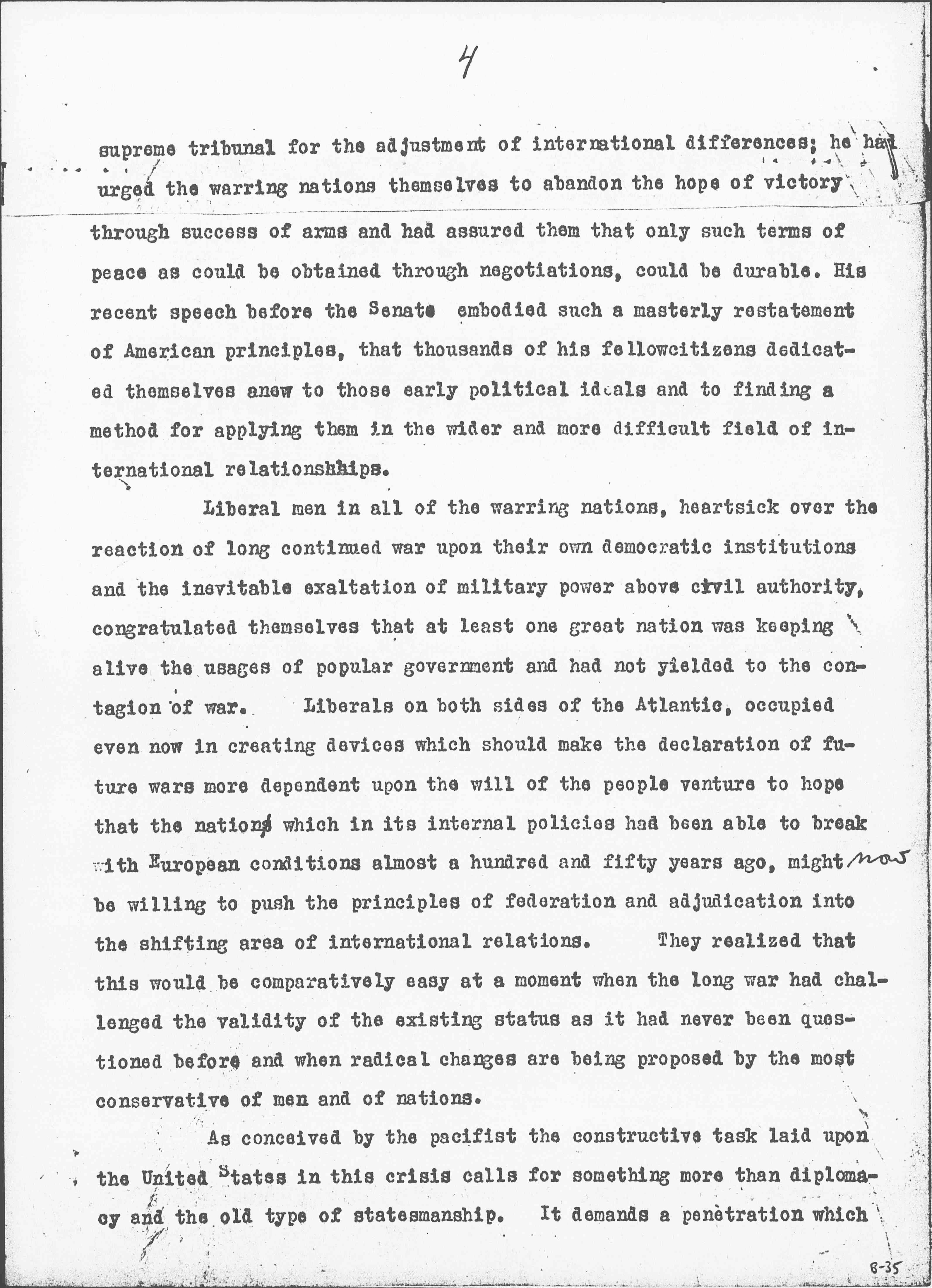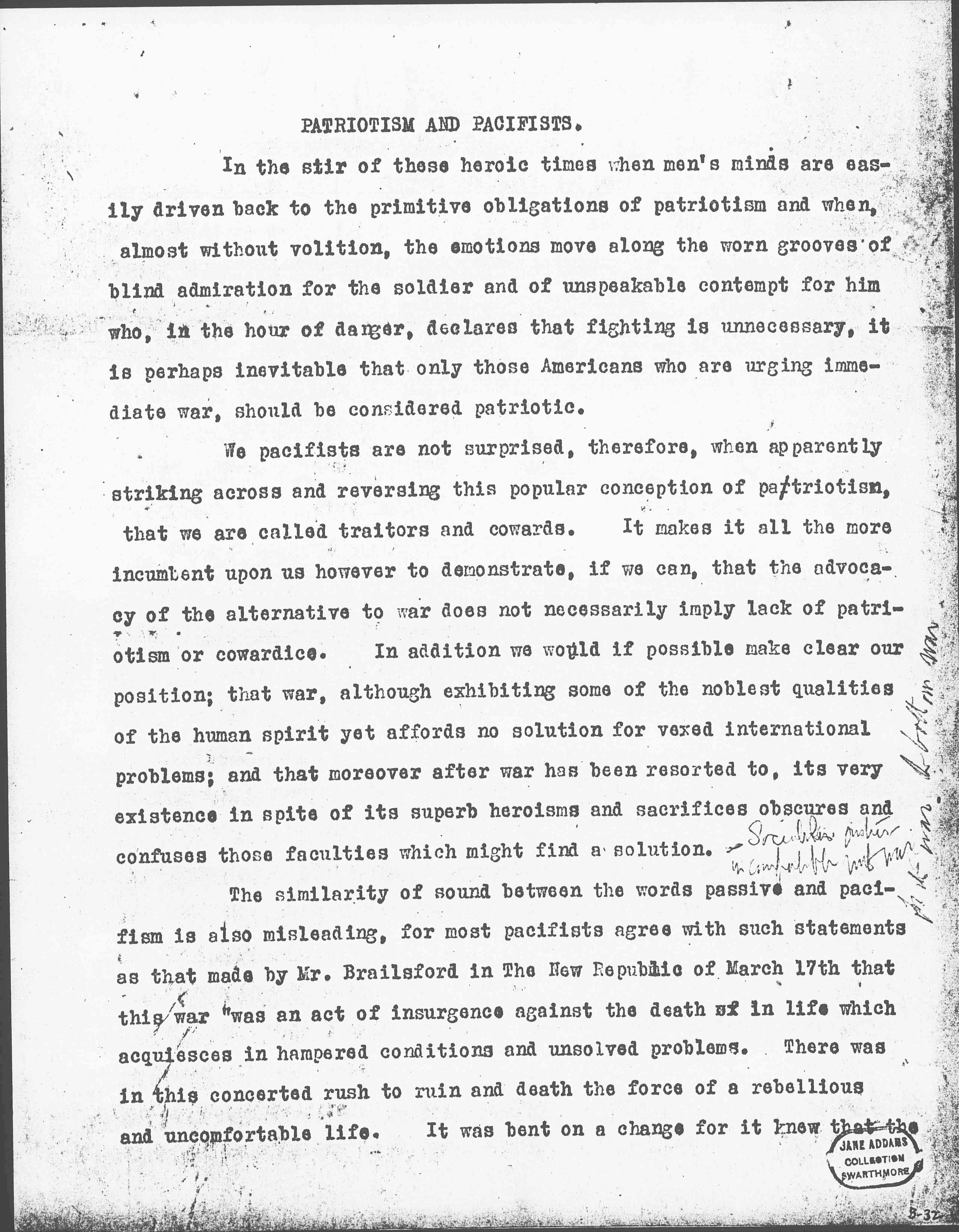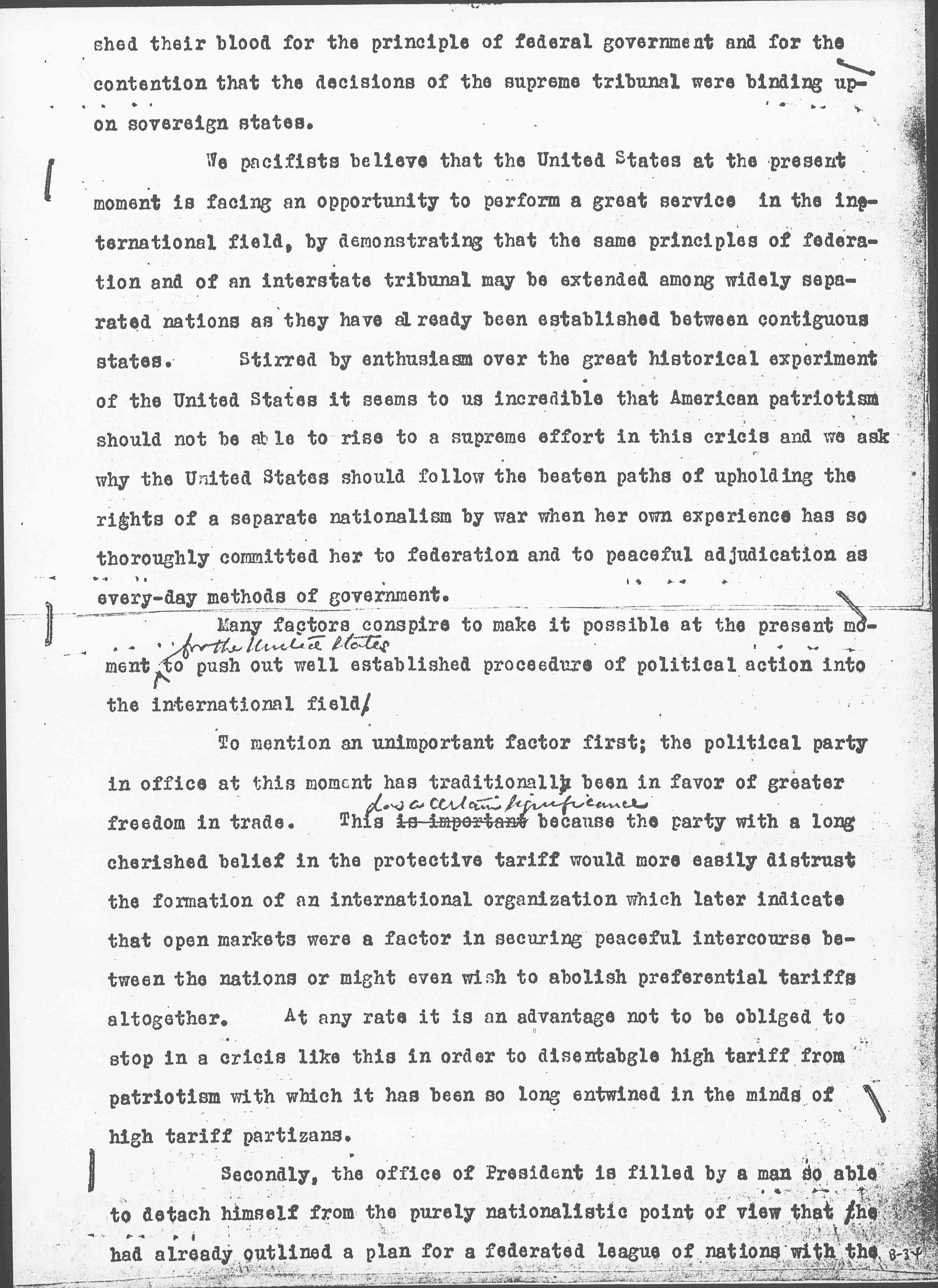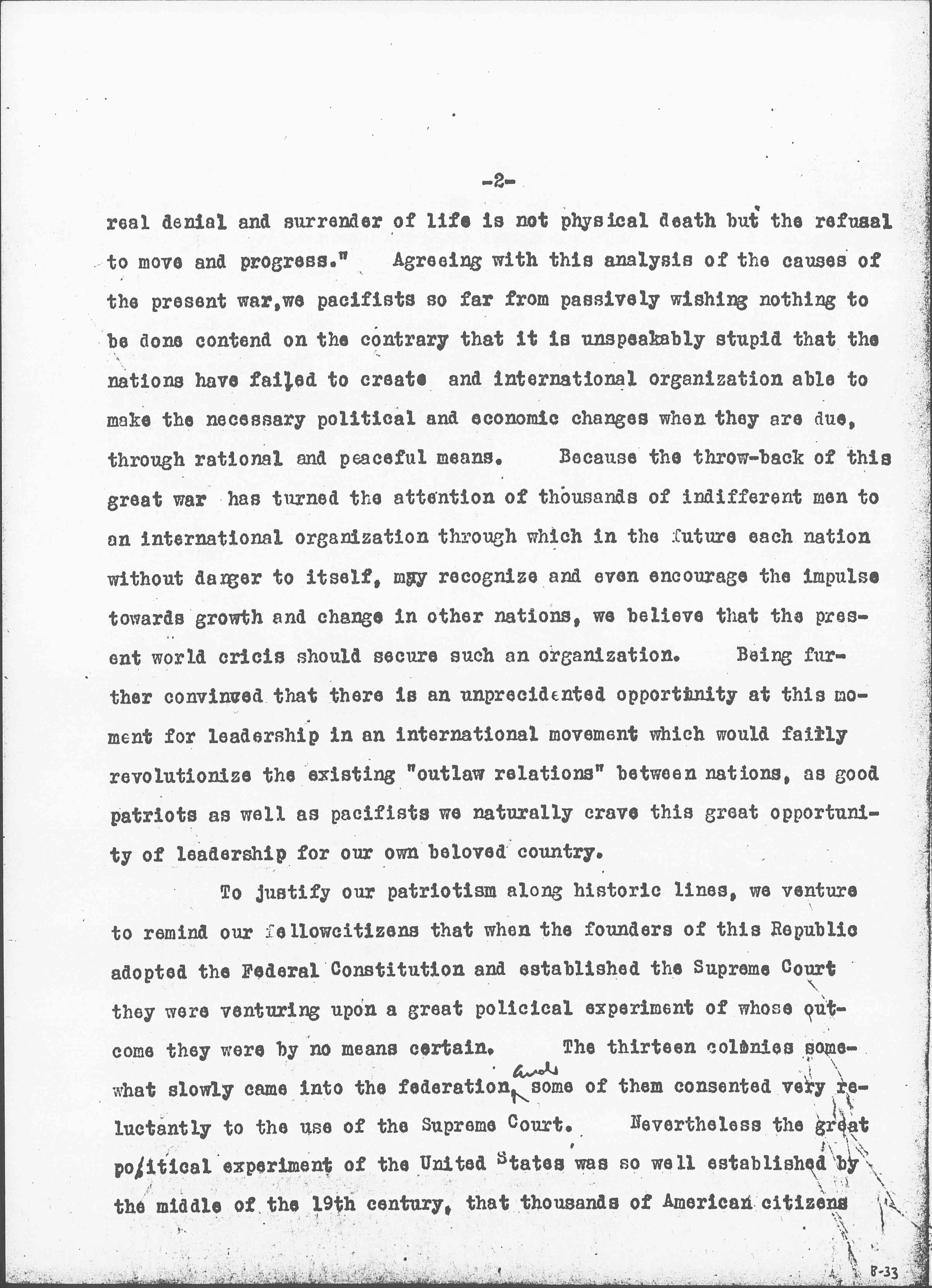 The similarity of sound between the words passive and pacifism is also misleading, for most pacifists agree with such statements as that made by Mr. Brailsford in The New Republic of March 17th that this war "was an act of insurgence against the death of in life which acquiesces in hampered conditions and unsolved problems. There was in this concerted rush to ruin and death the force of a rebellious and uncomfortable life. It was bent on a change for it knew that the [page 2] real denial and surrender of life is not physical death but the refusal to move and progress." Agreeing with this analysis of the causes of the present war, we pacifists so far from passively wishing nothing to be done contend on the contrary that it is unspeakably stupid that the nations have failed to create [an] international organization able to make the necessary political and economic changes when they are due, through rational and peaceful means. Because the throw-back of this great war has turned the attention of thousands of indifferent men to an international organization through which in the future each nation without danger to itself, may recognize and even encourage the impulse towards growth and change in other nations, we believe that the present world [crisis] should secure such an organization. Being further convinced that there is an unprecedented opportunity at this moment for leadership in an international movement which would fairly revolutionize the existing "outlaw relations" between nations, as good patriots as well as pacifists we naturally crave this great opportunity of leadership for our own beloved country.