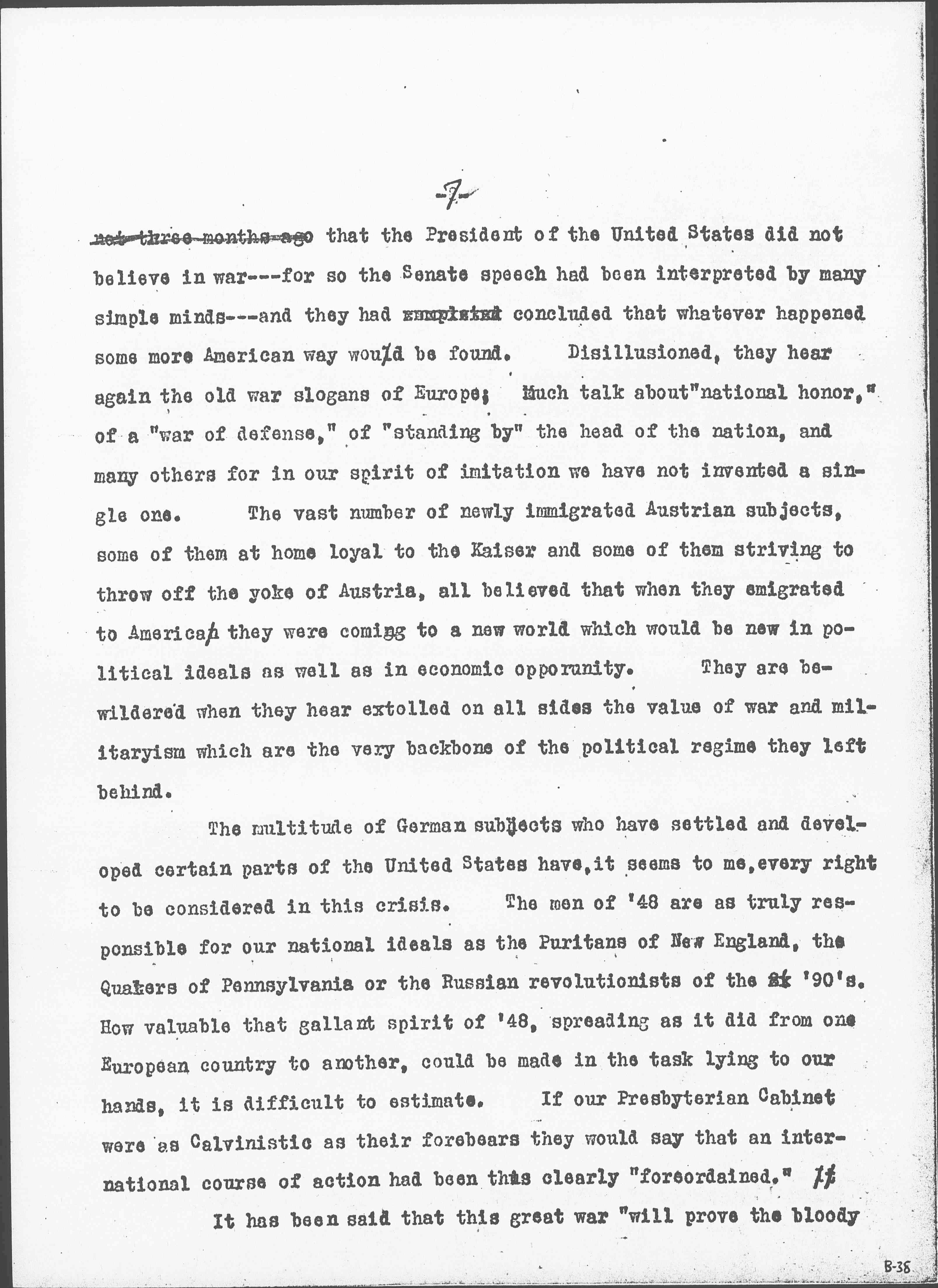 Modern warfare is an intimately social and domestic affair. The civilian sufferings, and in certain regions, the civilian mortality is as great as that endured by the soldiers. There are thousands of our fellow citizens who cannot tear their minds away from Poland, Galicia, Syria, Armenia, [Serbia], [Romania], Greece where their own relatives are dying from diseases super induced by hardship and hunger. To such sore and troubled minds war has come to be a hideousness which belongs to Europe and is part of that privation and oppression which they left behind them when they came to America. Newly immigrated Austrian [subjects] of a dozen nationalities have come to their American friends during the past few weeks of suspense, utterly bewildered by the prospect of war. They had heard not three months [page 7] not three months ago that the President of the United States did not believe in war -- for so the Senate speech had been interpreted by many simple minds -- and they had [illegible] concluded that whatever happened some more American way would be found. Disillusioned, they hear again the old war slogans of Europe; much talk about "national honor," of a "war of defense," of "standing by" the head of the nation, and many others for in our spirit of imitation we have not invented a single one. The vast number of newly immigrated Austrian subjects, some of them at home loyal to the Kaiser and some of them striving to throw off the yoke of Austria, all believed that when they emigrated to America they were coming to a new world which would be new in political ideals as well as in economic opportunity. They are bewildered when they hear extolled on all sides the value of war and [militarism] which are the very backbone of the political regime they left behind.