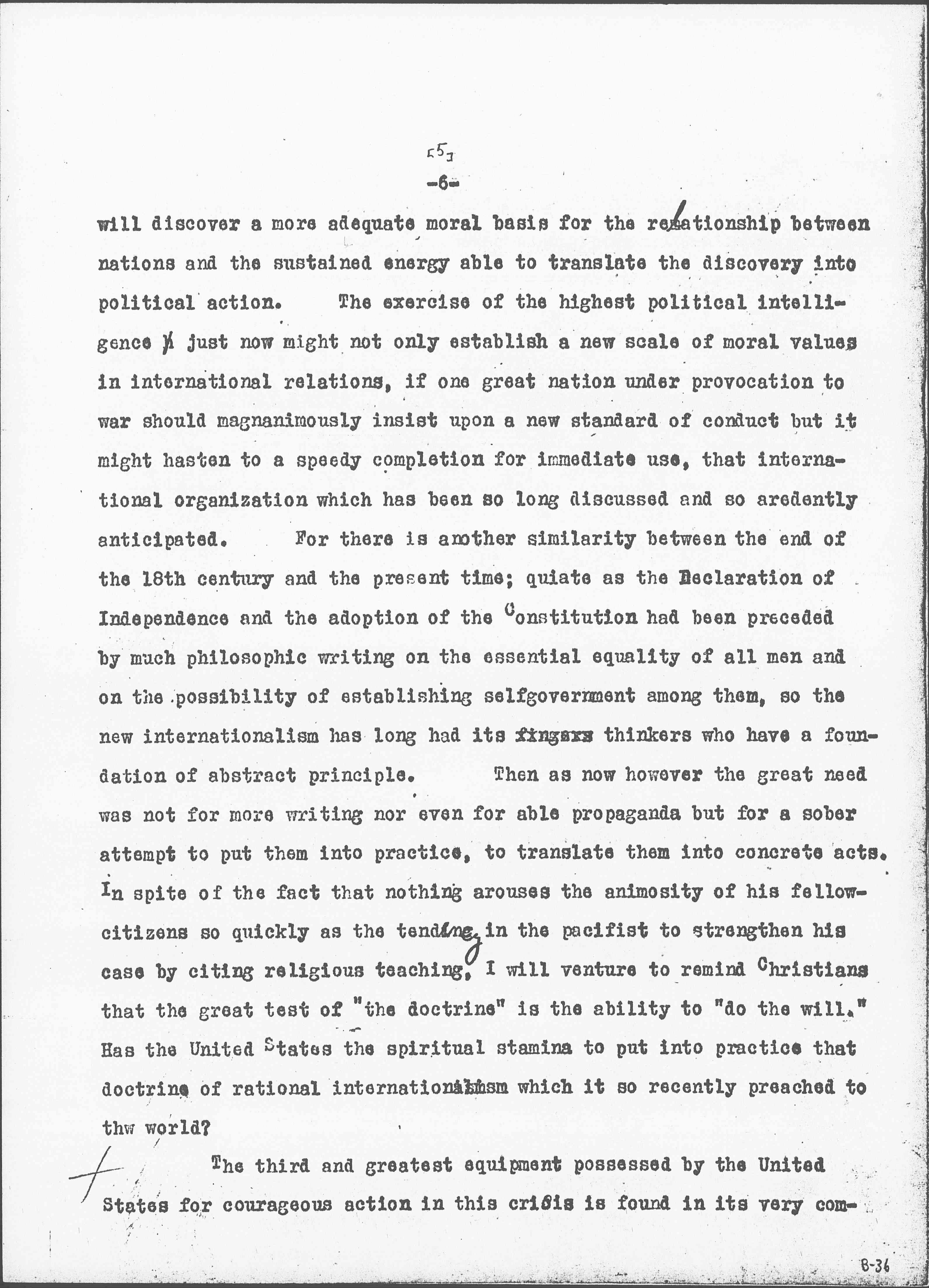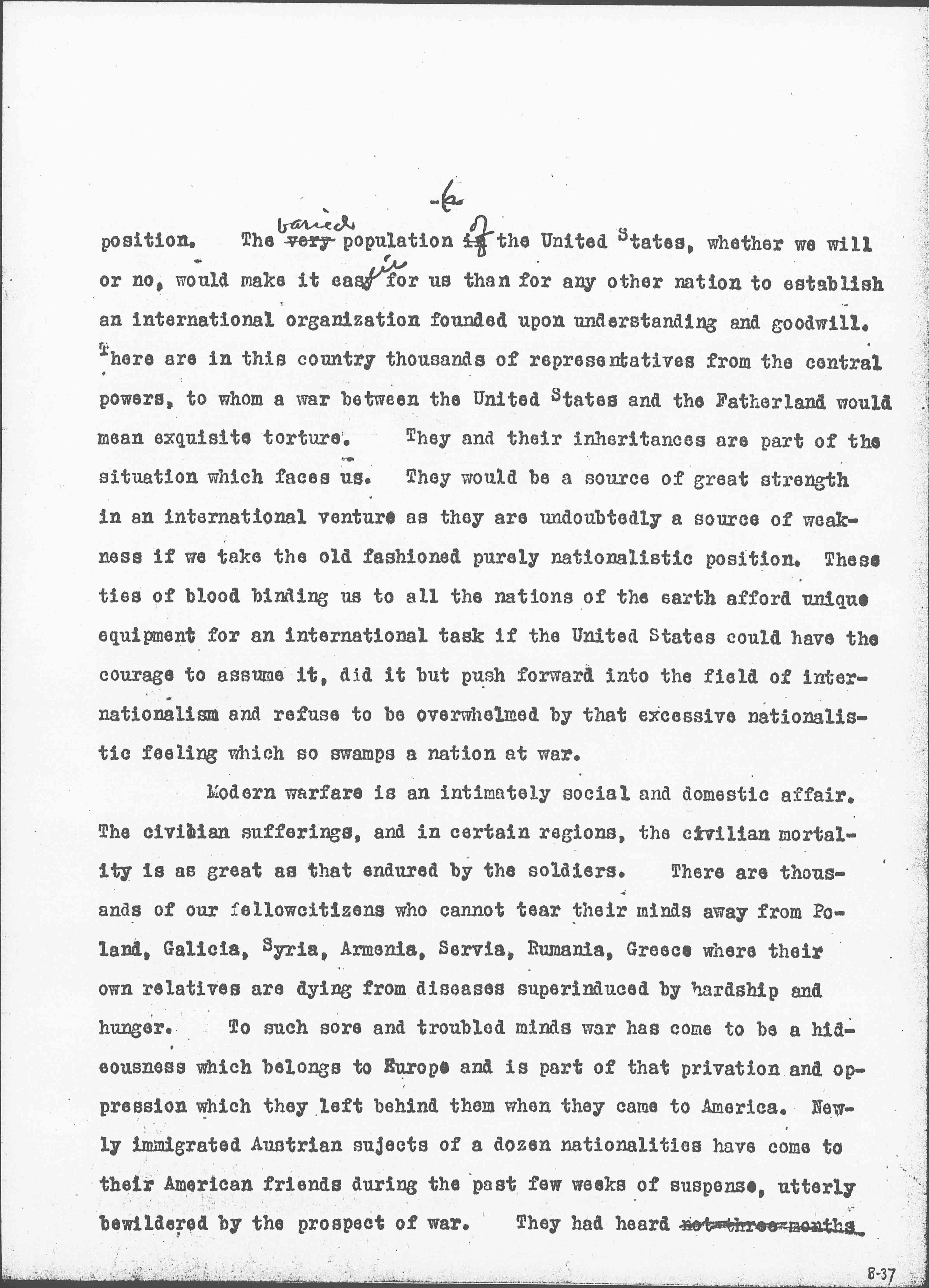 The third and greatest equipment possessed by the United States for courageous action in this crisis is found in its very composition. [page 6] The very ↑varied↓ population in ↑of↓ the United States, whether we will or [not], would make it easier for us than for any other nation to establish an international organization founded upon understanding and goodwill. There are in this country thousands of representatives from the central powers, to whom a war between the United States and the Fatherland would mean exquisite torture. They and their inheritances are part of the situation which faces us. They would be a source of great strength in an international venture as they are undoubtedly a source of weakness if we take the old fashioned purely nationalistic position. These ties of blood binding us to all the nations of the earth afford unique equipment for an international task if the United States could have the courage to assume it, did it but push forward into the field of internationalism and refuse to be overwhelmed by that excessive nationalistic feeling which so swamps a nation at war.