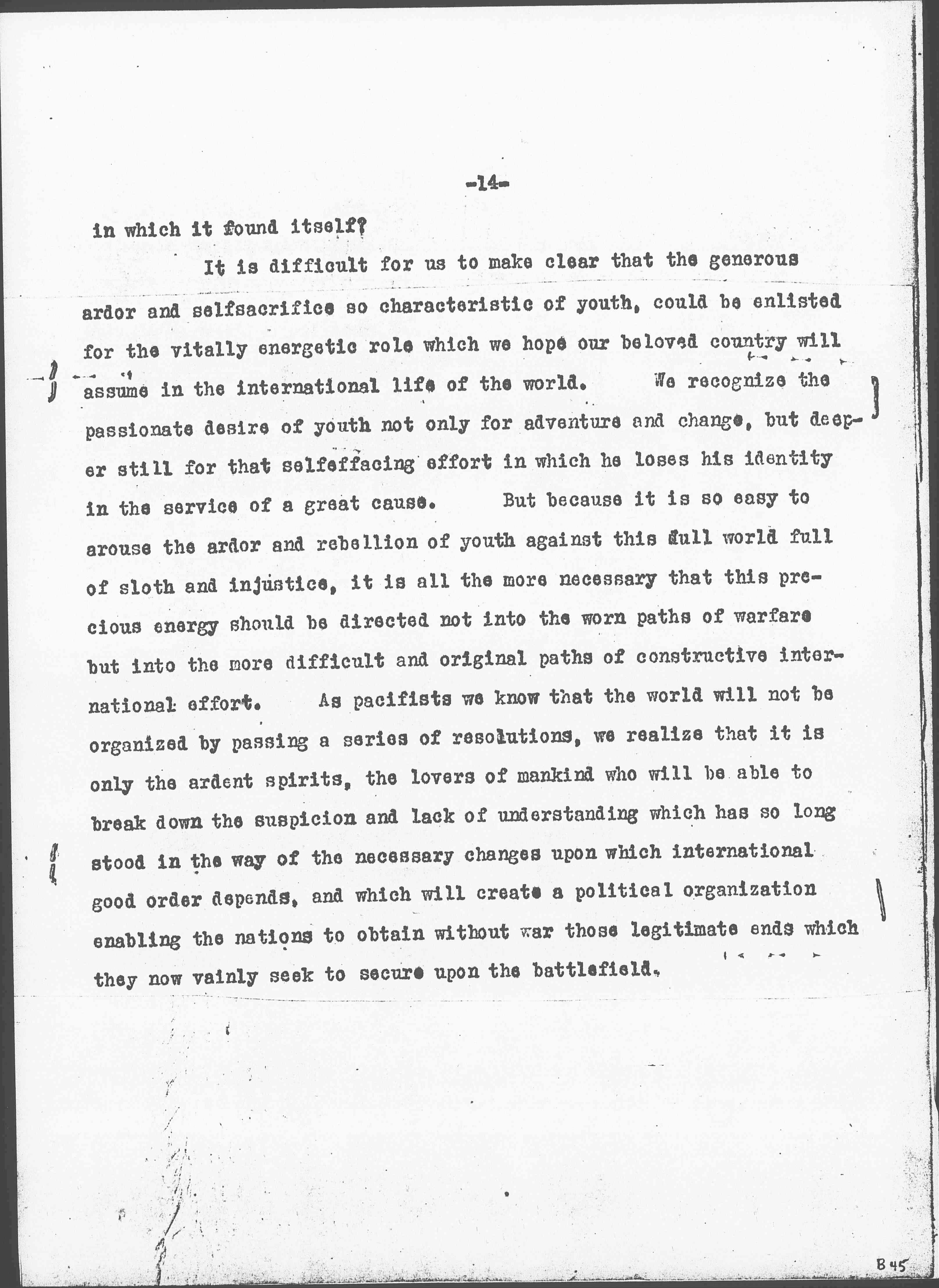 It is difficult for us to make clear that the generous ardor and [self-sacrifice] as characteristic of youth, could be enlisted for the vitally energetic role which we hope our beloved country will assume in the international life of the world. We recognize the passionate desire of youth not only for adventure and change, but deeper still for that [self-effacing] effort in which he loses his identity in the service of a great cause. But because it is so easy to arouse the ardor and rebellion of youth against this dull world full of sloth and injustice, it is all the more necessary that this precious energy should be directed not into the worn paths of warfare but into the more difficult and original paths of constructive international effort. As pacifists we know that the world will not be organized by passing a series of resolutions, we realize that it is only the ardent spirits, the lovers of mankind who will be able to break down the suspicion and lack of understanding which has so long stood in the way of the necessary changes upon which international good order depends, and which will create a political organization enabling the nations to obtain without war those legitimate ends which they now vainly seek to secure upon the battlefield.