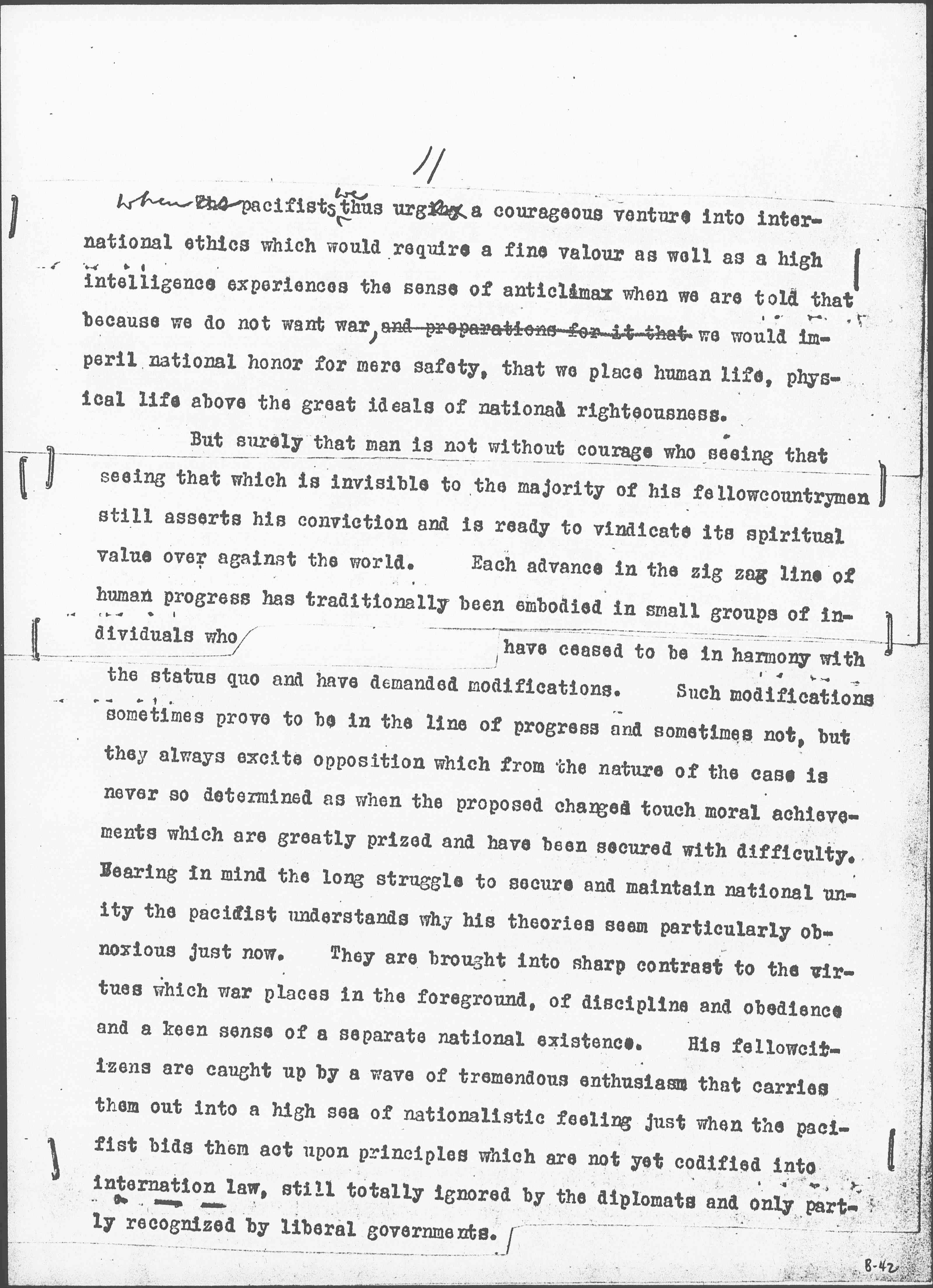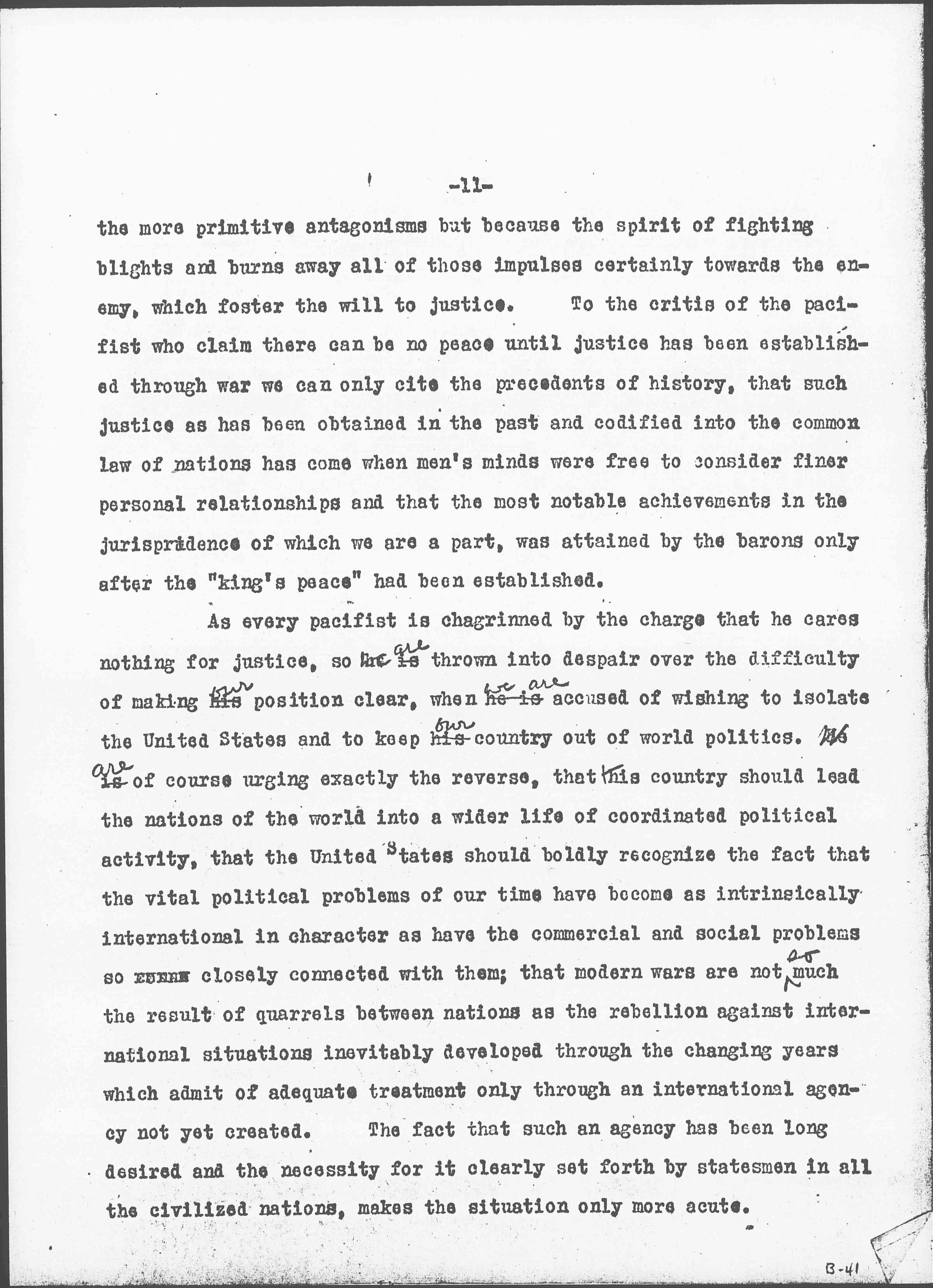 As every pacifist is chagrinned by the charge that he cares nothing for justice, so [we] is ↑are↓ thrown into despair over the difficulty of making his ↑our↓ position clear, when he is ↑we are↓ accused of wishing to isolate the United States and to keep his ↑our↓ country out of world politics. He is ↑We are↓ of course urging exactly the reverse, that [this] country should lead the nations of the world into a wider life of coordinated political activity, that the United States should boldly recognize the fact that the vital political problems of our time have become as intrinsically international in character as have the commercial and social problems so [illegible] closely connected with them; that modern wars are not ↑so↓ much the result of quarrels between nations as the rebellion against international situations inevitably developed through the changing years which admit of adequate treatment only through an international agency not yet created. The fact that such an agency has been long desired and the necessity for it clearly set forth by statesmen in all the civilized nations, makes the situation only more acute. [page 11]