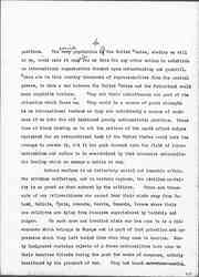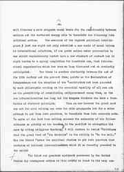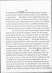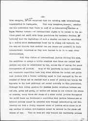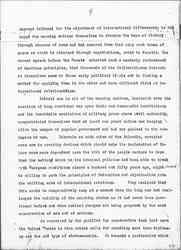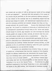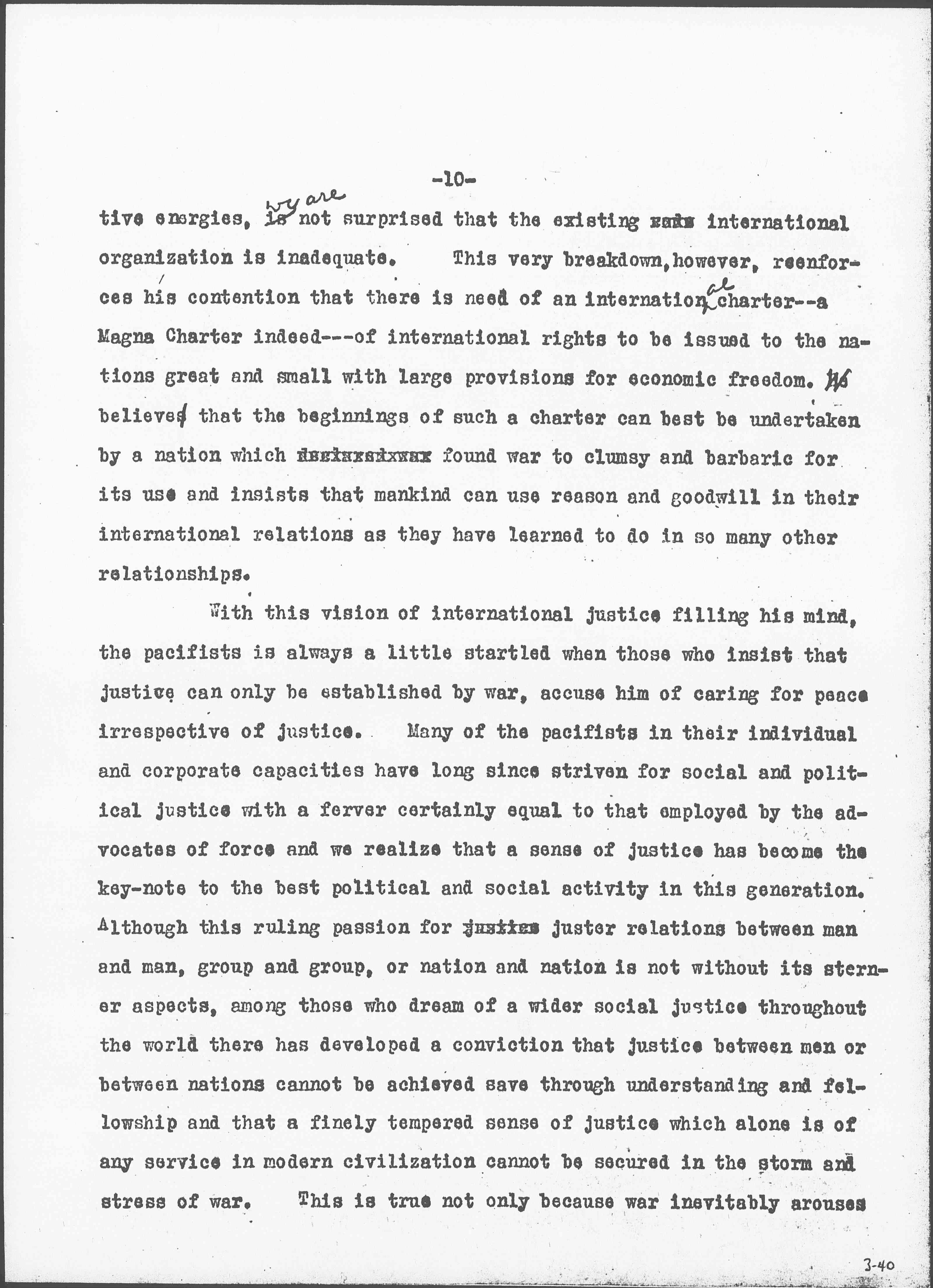 The existing code dramatically proved itself inadequate for the needs of Europe in 1914 when certain tendencies were steadily pushing towards large changes which in the end made war because the system of peace had no way of effecting those changes without war, no adequate international organization which could cope with the situation. The conception of peace founded upon the balance of power or the undisturbed status quo was so negative that frustrated national impulses led to war, quite as any hampered mechanical force or suppressed vitality exhibits violence when it at last breaks through. But because the ↑as we↓ pacifists recognize the irrepressible tendencies in all living nations as in all living men towards the unhampered employment of their creative [page 9] energies, is ↑we are↓ not surprised that the existing [illegible] international organization is inadequate. This very breakdown, however, [reinforces] his contention that there is need of an international charter -- a Magna Charter indeed -- of international rights to be issued to the nations great and small with large provisions for economic freedom. We believe that the beginnings of such a charter can best be undertaken by a nation which [illegible] found war [too] clumsy and barbaric for its use and insists that mankind can use reason and goodwill in their international relations as they have learned to do in so many other relationships.
