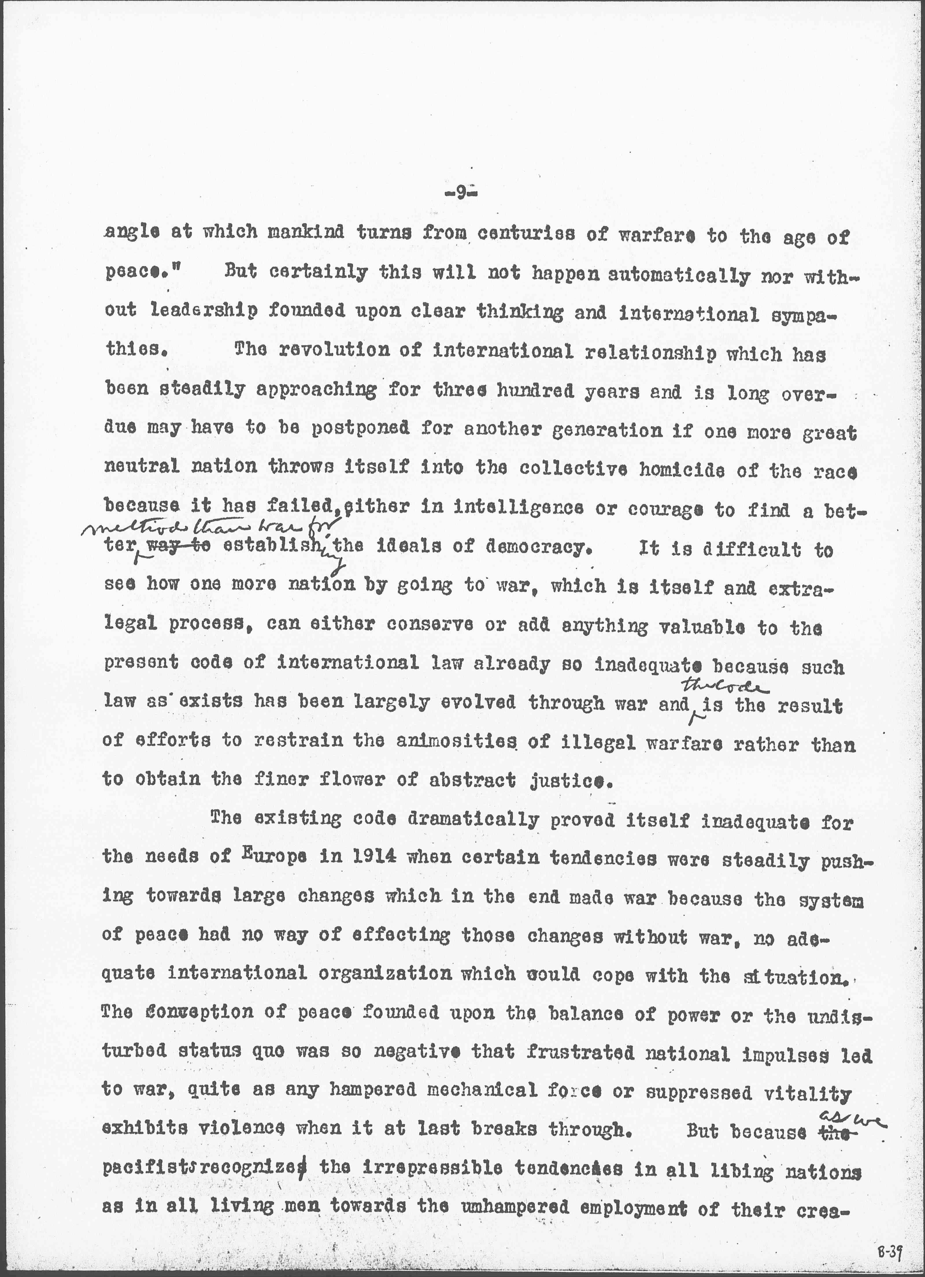 It has been said that this great war "will prove the bloody [page 8] angle at which mankind turns from centuries of warfare to the age of peace." But certainly this will not happen automatically nor without leadership founded upon clear thinking and international sympathies. The revolution of international relationship which has been steadily approaching for three hundred years and is long overdue may have to be postponed for another generation if one more great neutral nation throws itself into the collective homicide of the race because it has failed, either in intelligence or courage to find a better ↑method than war for↓ way to [establishing] the ideals of democracy. It is difficult to see how one more nation by going to war, which is itself [an] extralegal process, can either conserve or add anything valuable to the present code of international law already so inadequate because such law as exists has been largely evolved through war and ↑the code↓ is the result of efforts to restrain the animosities of illegal warfare rather than to obtain the finer flower of abstract justice.