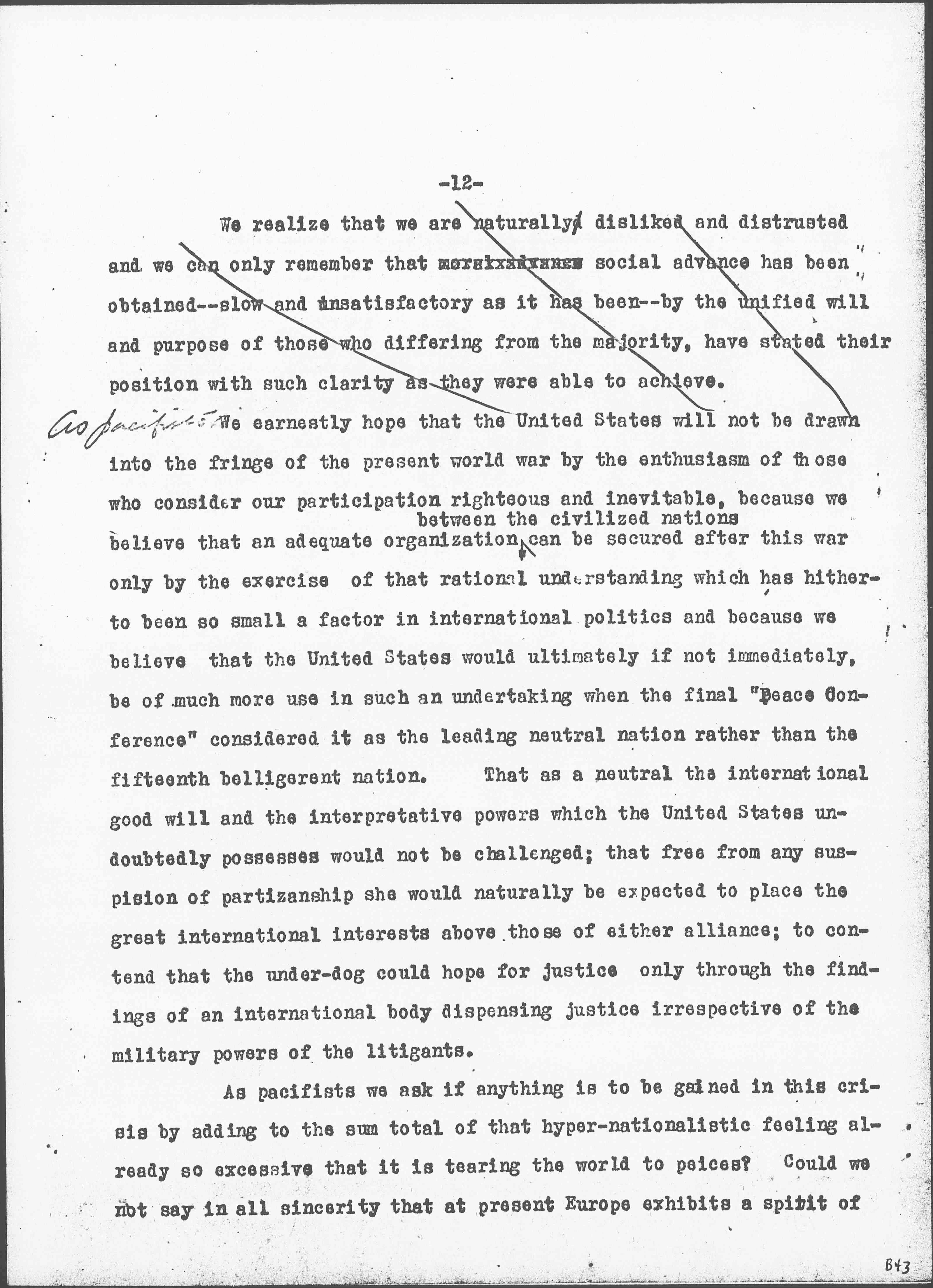 ↑As pacifists↓ we earnestly hope that the United States will not be drawn into the fringe of the present world war by the enthusiasm of those who consider our participation righteous and inevitable, because we believe that an adequate organization ↑between the civilized nations↓ can be secured after this war only by the exercise of that rational understanding which has hitherto been so small a factor in international politics and because we believe that the United States would ultimately if not immediately, be of much more use in such an undertaking when the final "Peace Conference" considered it as the leading neutral nation rather than the fifteenth belligerent nation. That as a neutral the international good will and the interpretative powers which the United States undoubtedly possesses would not be challenged; that free from any suspicion of [partisanship] she would naturally be expected to place the great international interests above those of either alliance; to contend that the [underdog] could hope for justice only through the findings of an international body dispensing justice irrespective of the military powers of the litigants.