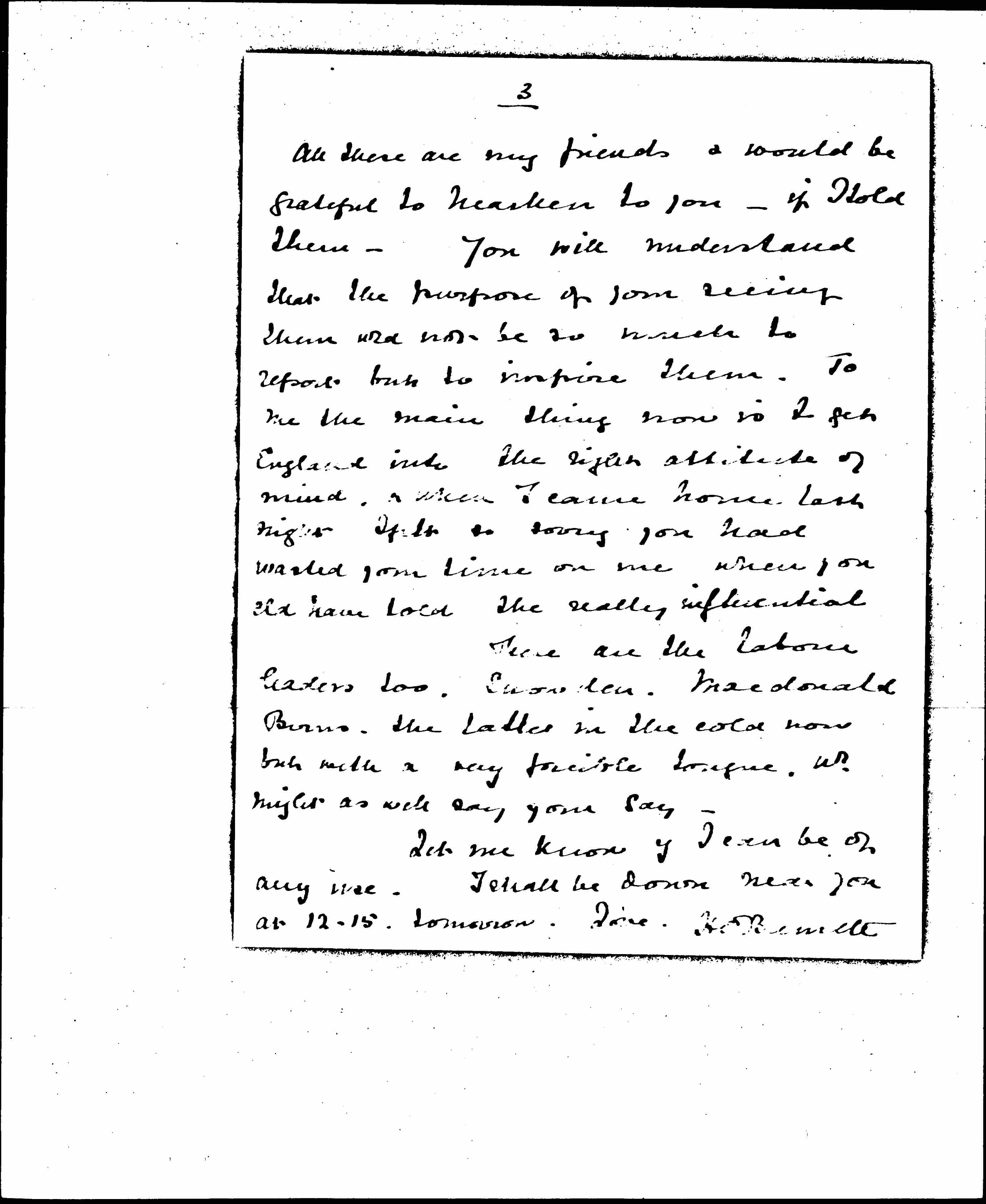 All these are my friends & would be grateful to hearken to you -- if I told them -- You will understand that the purpose of your seeing them wld not be so much to report but to inspire them. To me the main thing now is to get England into the right attitude of mind, & when I came home last night I felt so sorry you had wasted your time on me when you cld have told the really influential.