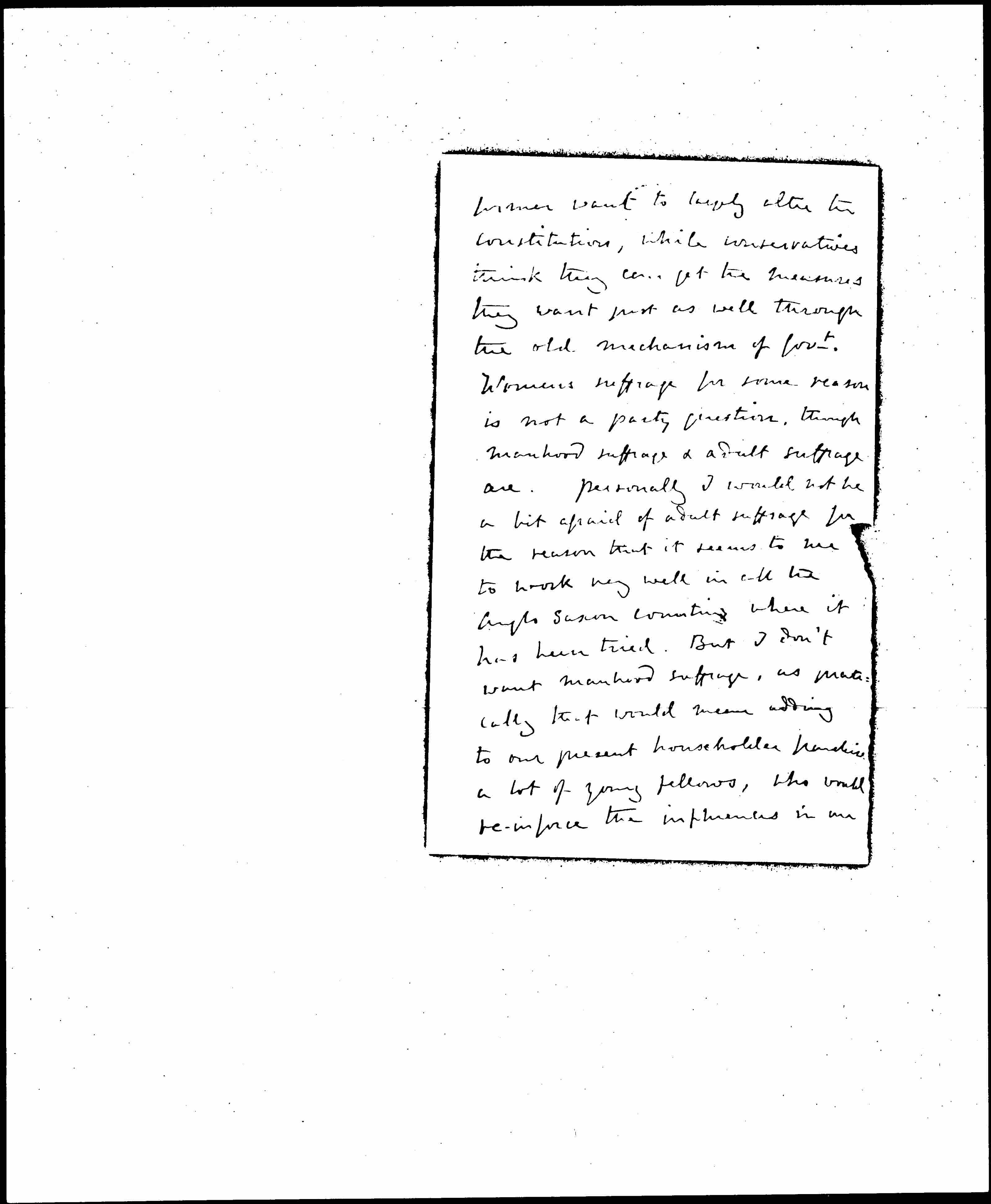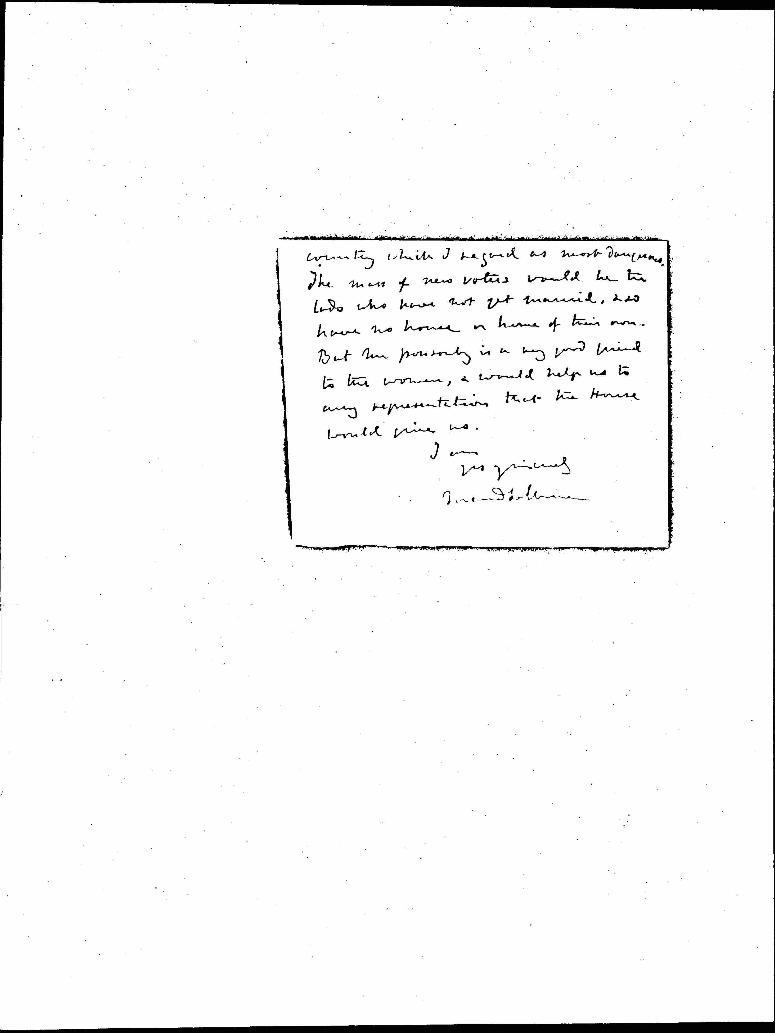 Womens suffrage for some reason is not a party question, though manhood suffrage & adult suffrage are. Personally I would not be a bit afraid of adult suffrage for the reason that it seems to me to work very well in all the Anglo Saxon countries where it has been tried. But I don't want manhood suffrage, as [practically] that would mean adding to our present householder franchise a lot of young fellows, who would [reinforce] the influences in our [page 3] country which I regard as most dangerous. The mass of new voters would be the lads who have not yet married, & so have no house or home of their own. But Mr Ponsonby is a very good friend to the women, & would help us to any representation that the House would give us.
