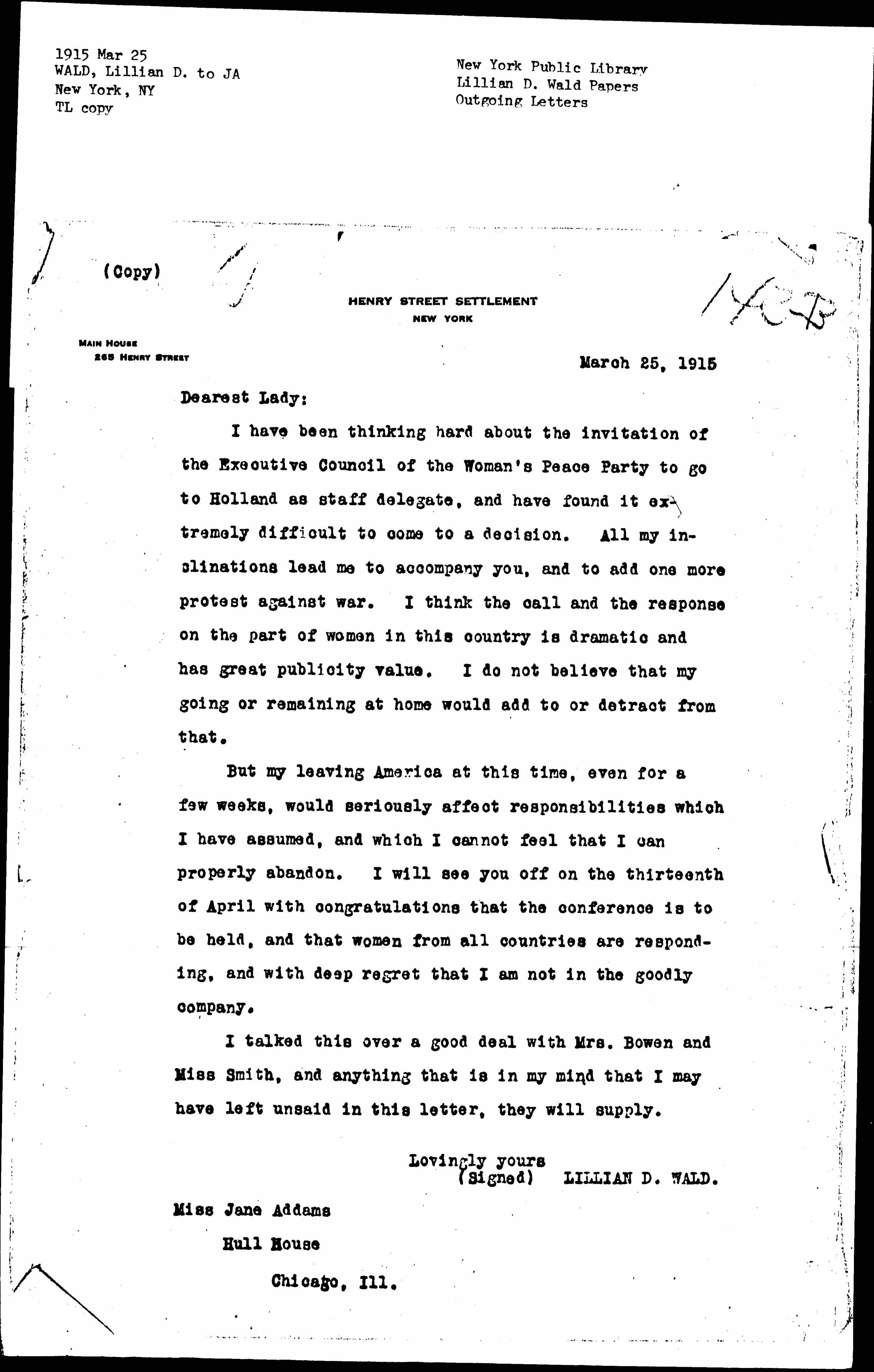 I have been thinking hard about the invitation of the Executive Council of the Woman's Peace Party to go to Holland as staff delegate, and have found it extremely difficult to come to a decision. All my inclinations lead me to accompany you, and to add one more protest against war. I think the call and the response on the part of women in this country is dramatic and has great publicity value. I do not believe that my going or remaining at home would add to or detract from that.