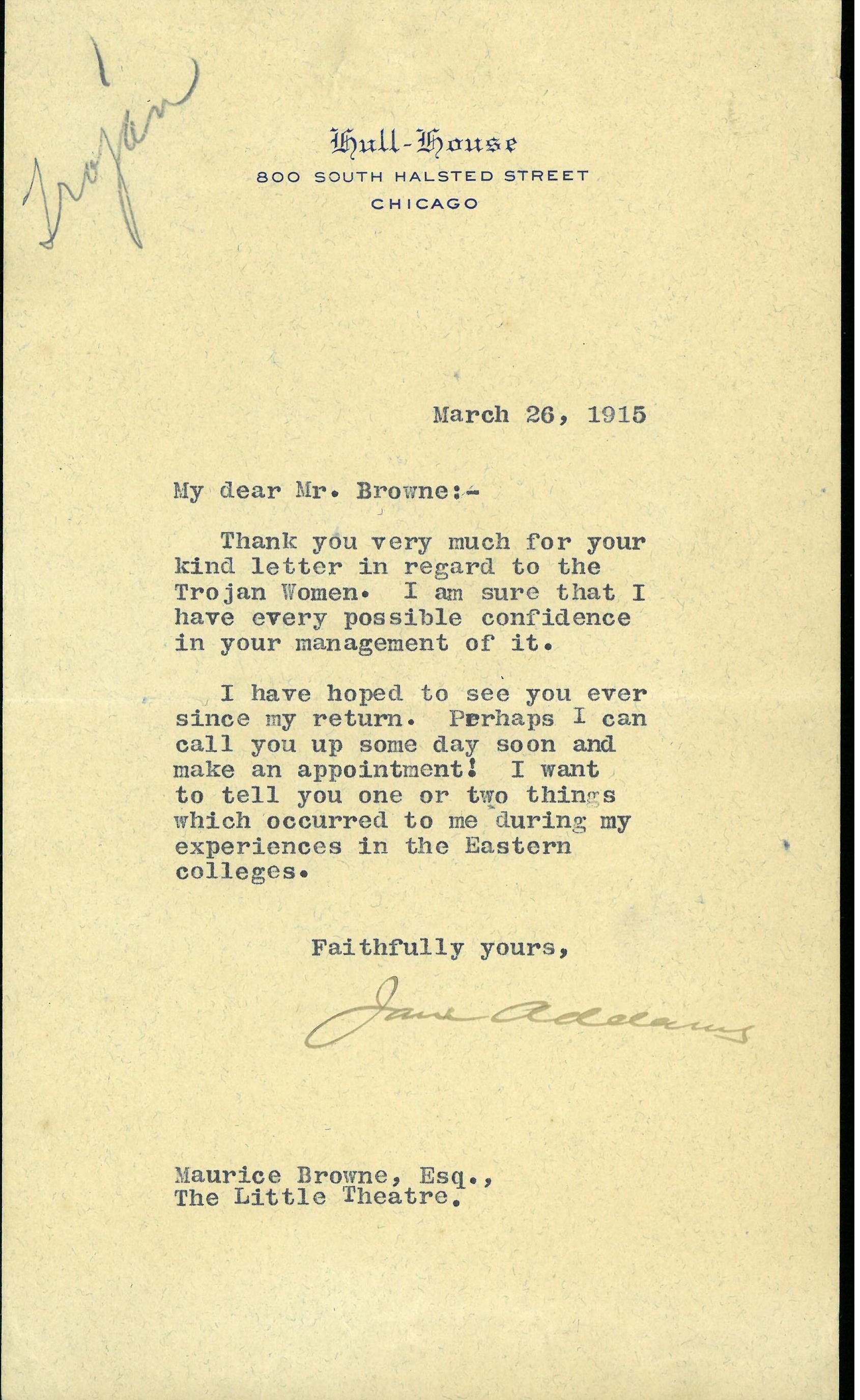 Thank you very much for your kind letter in regard to the Trojan Women. I am sure that I have every possible confidence in your management of it.