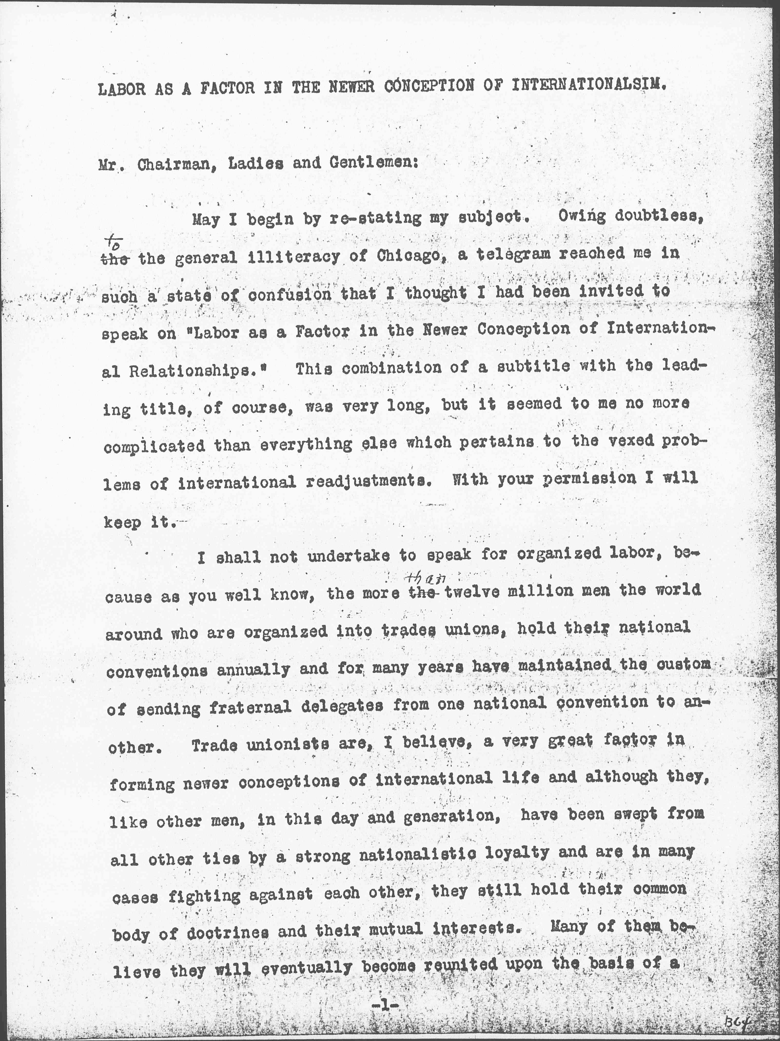 May I begin by [restating] my subject. Owing doubtless, the <to> the general illiteracy of Chicago, a telegram reached me in such a state of confusion that I thought I had been invited to speak on "Labor as a Factor in the Newer Conception of International Relationships." This combination of a subtitle with the leading title, of course, was very long, but it seemed to me no more complicated than everything else which pertains to the vexed problems of international readjustments. With your permission I will keep it.