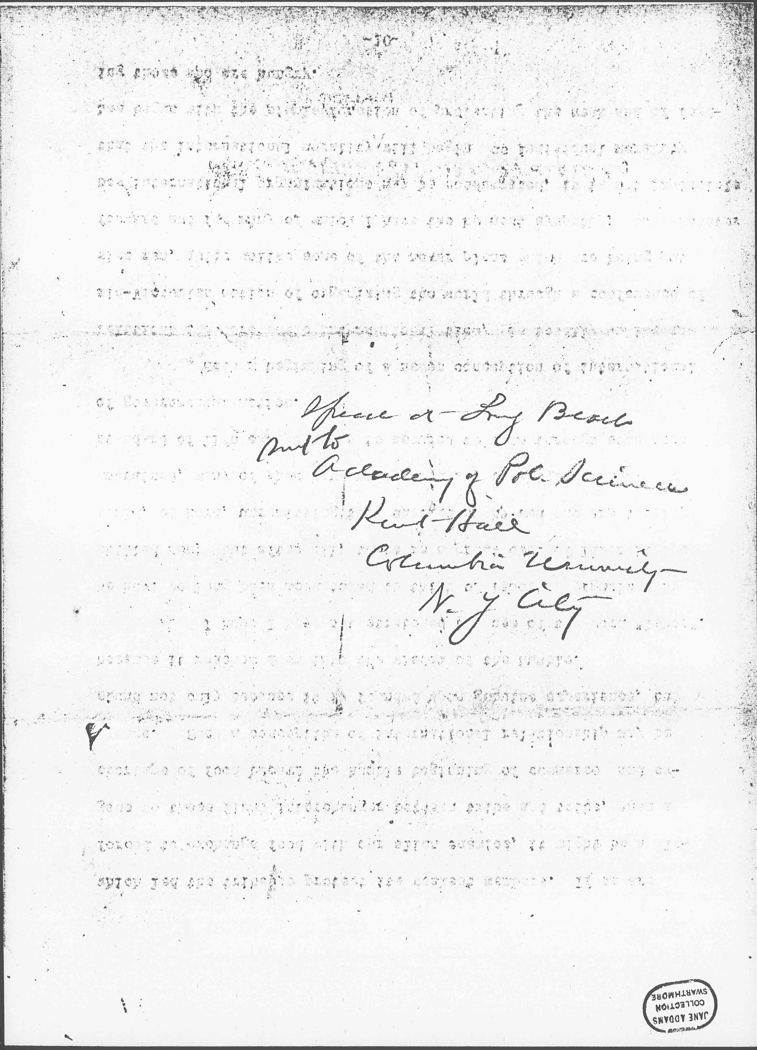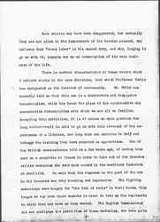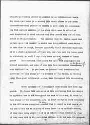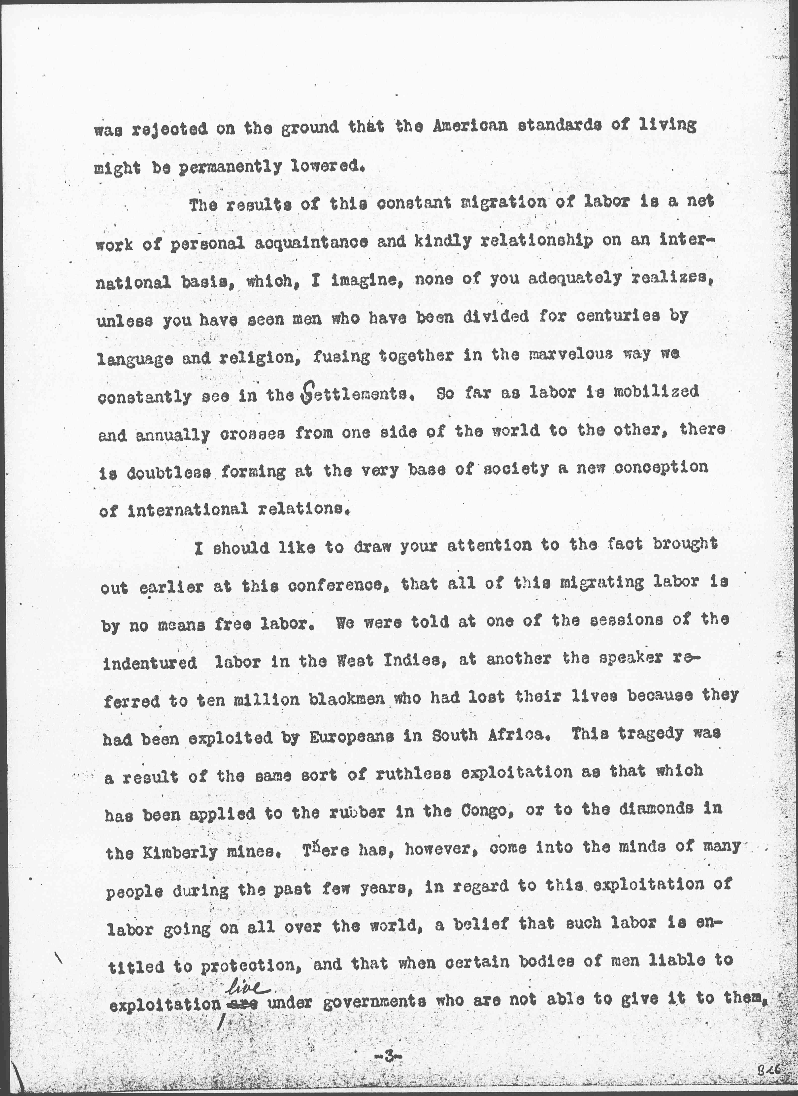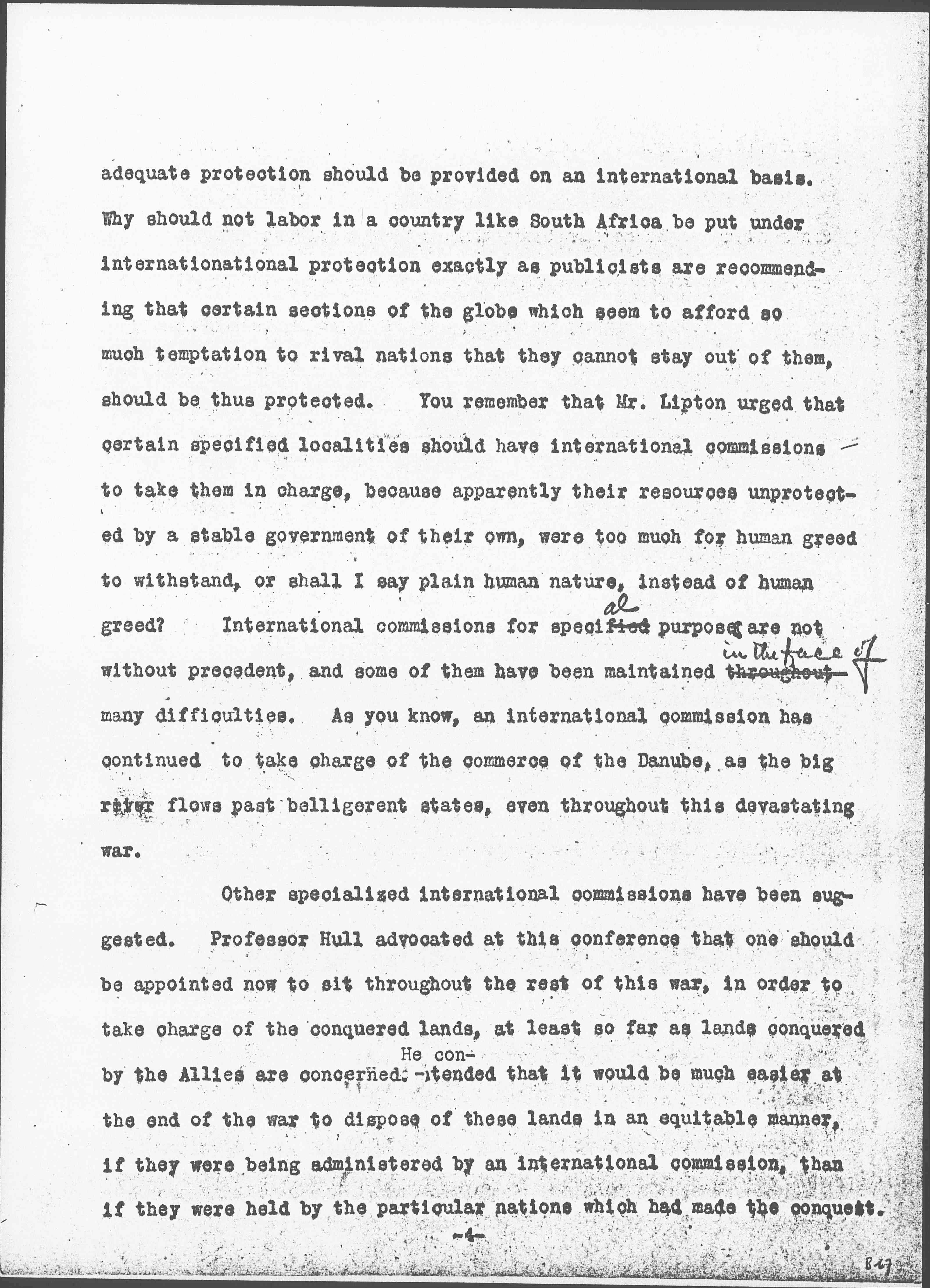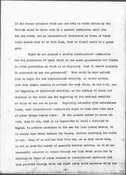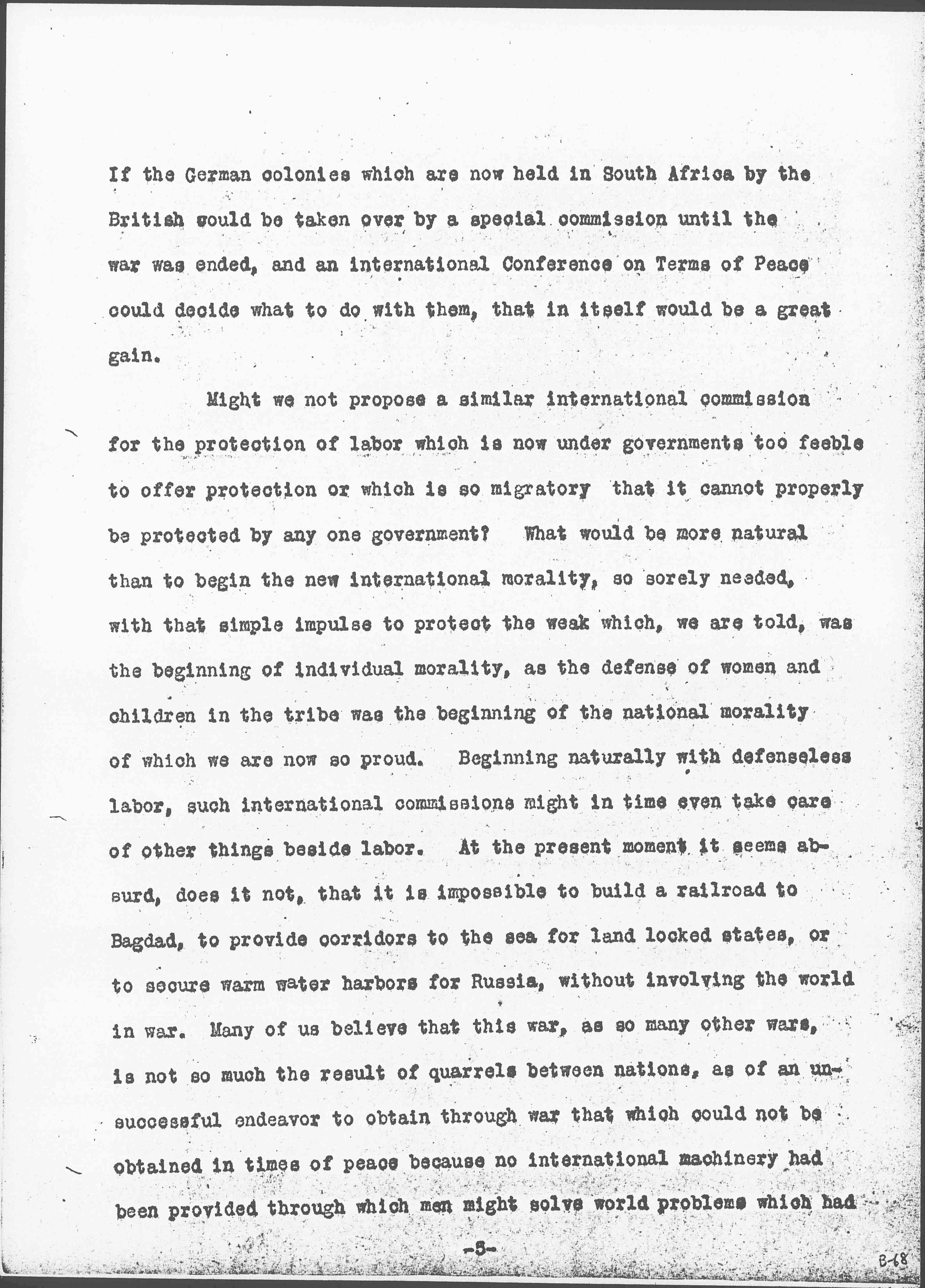 I should like to draw your attention to the fact brought out earlier at this conference, that all of this migrating labor is by no means free labor. We were told at one of the sessions of the indentured labor in the West Indies, at another the speaker referred to ten million black men who had lost their lives because they had been exploited by Europeans in South Africa. This tragedy was a result of the same sort of ruthless exploitation as that which has been applied to the rubber in the Congo, or to the diamonds in the [Kimberley] mines. There has, however, come into the minds of many people during the past few years, in regard to this exploitation of labor going on all over the world, a belief that such labor is entitled to protection, and that when certain bodies of men liable to exploitation, are <live> under governments who are not able to give it to them, [page 4] adequate protection should be provided on an international basis. Why should not labor in a country like South Africa be put under international protection exactly as publicists are recommending that certain sections of the globe which seem to afford so much temptation to rival nations that they cannot stay out of them, should be thus protected. You remember that Mr. [Lippmann] urged that certain specified localities should have international commissions to take them in charge, because apparently their resources unprotected by a stable government of their own, were too much for human greed to withstand, or shall I say plain human nature, instead of human greed? International commissions for special purposes are not without precedent, and some of them have been maintained throughout <in the face of> many difficulties. As you know, an international commission has continued to take charge of the commerce of the Danube, as the big river flows past belligerent states, even throughout this devastating war.