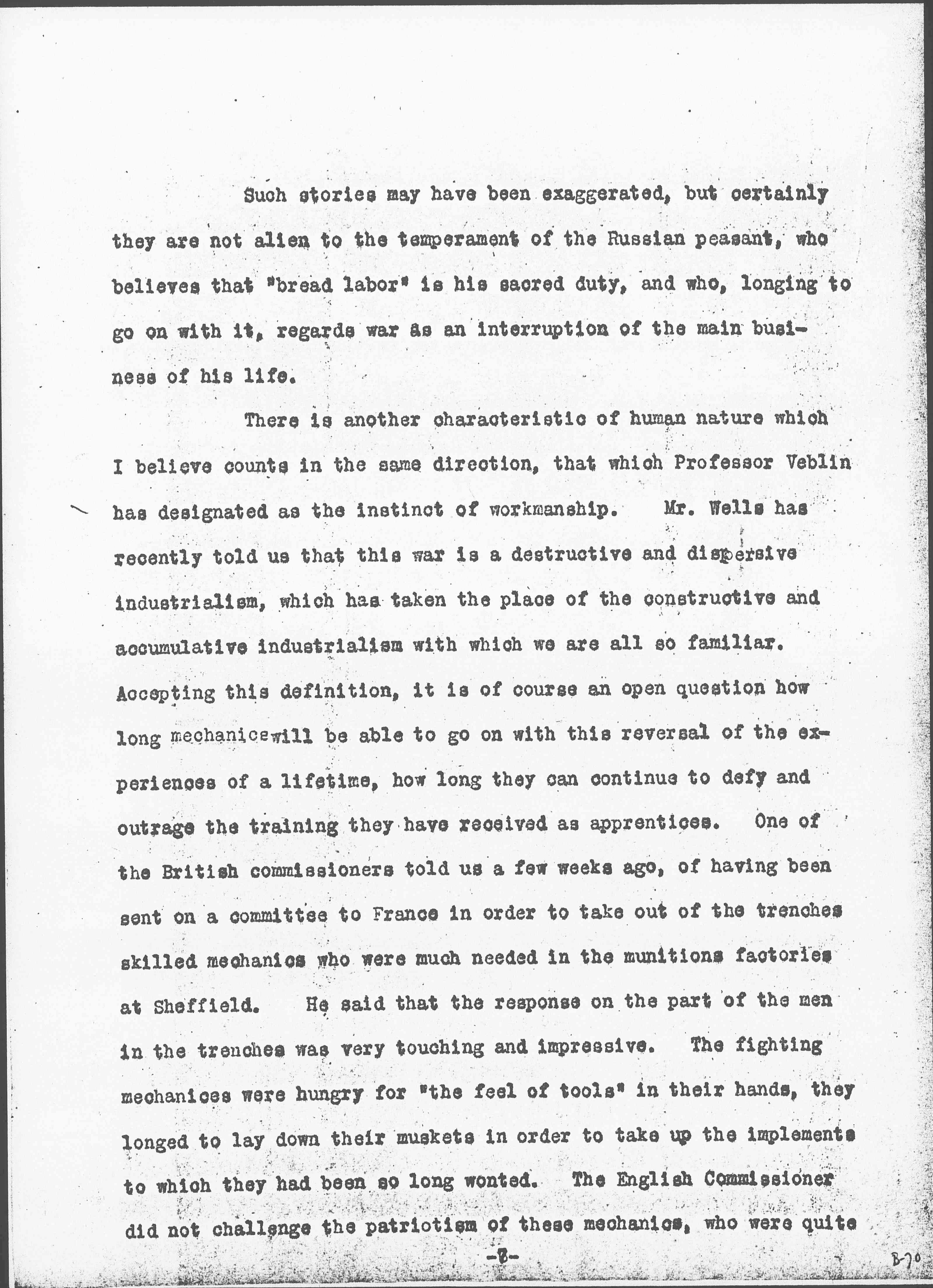 There is another characteristic of human nature which I believe counts in the same direction, that which Professor [Veblen] has designated as the instinct of workmanship. Mr. Wells has recently told us that this war is a destructive and dispersive industrialism, which has taken the place of the constructive and accumulative industrialism with which we are all so familiar. Accepting this definition, it is of course an open question how long mechanics will be able to go on with this reversal of the experiences of a lifetime, how long they can continue to defy and outrage the training they have received as apprentices. One of the British commissioners told us a few weeks ago, of having been sent on a committee to France in order to take out of the trenches skilled mechanics who were much needed in the munitions factories at Sheffield. He said that the response on the part of the men in the trenches was very touching and impressive. The fighting mechanics were hungry for "the feel of tools" in their hands, they longed to lay down their muskets in order to take up the implements to which they had been so long wonted. The English Commissioner did not challenge the patriotism of these mechanics, who were quite [page 8] ready to fight on to the end of the war, if it was so ordered, but he was much impressed with their eagerness to return to a more normal life and to again use the implements to which their very nerves and muscles had become accustomed. Is not the instinct of workmanship a genuine factor in human existence, and one that is <should> not to be [underrated]? <in a world of internationalized industry>