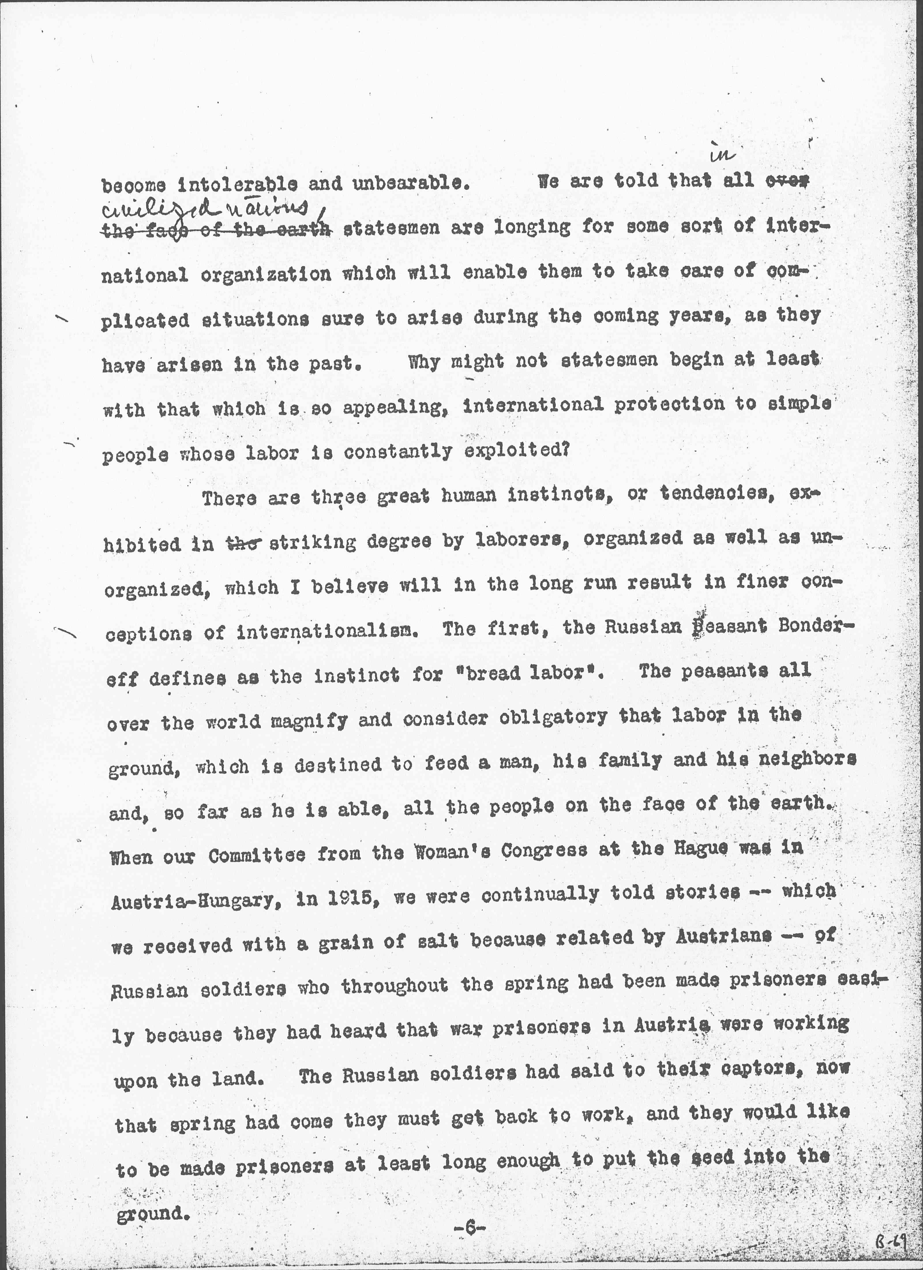 There are three great human instincts, or tendencies, exhibited in the striking degree by laborers, organized as well as unorganized, which I believe will in the long run result in finer conceptions of internationalism. The first, the Russian peasant [Bondarev] defines as the instinct for "bread labor". The peasants all over the world magnify and consider obligatory that labor in the ground, which is destined to feed a man, his family and his neighbors and, so far as he is able, all the people on the face of the Earth. When our Committee from the [Women's] Congress at The Hague was in Austria-Hungary, in 1915, we were continually told stories -- which we received with a grain of salt because related by Austrians -- of Russian soldiers who throughout the spring had been made prisoners easily because they had heard that war prisoners in Austria were working upon the land. The Russian soldiers had said to their captors, now that spring had come they must get back to work, and they would like to be made prisoners at least long enough to put the seed into the ground. [page 7]