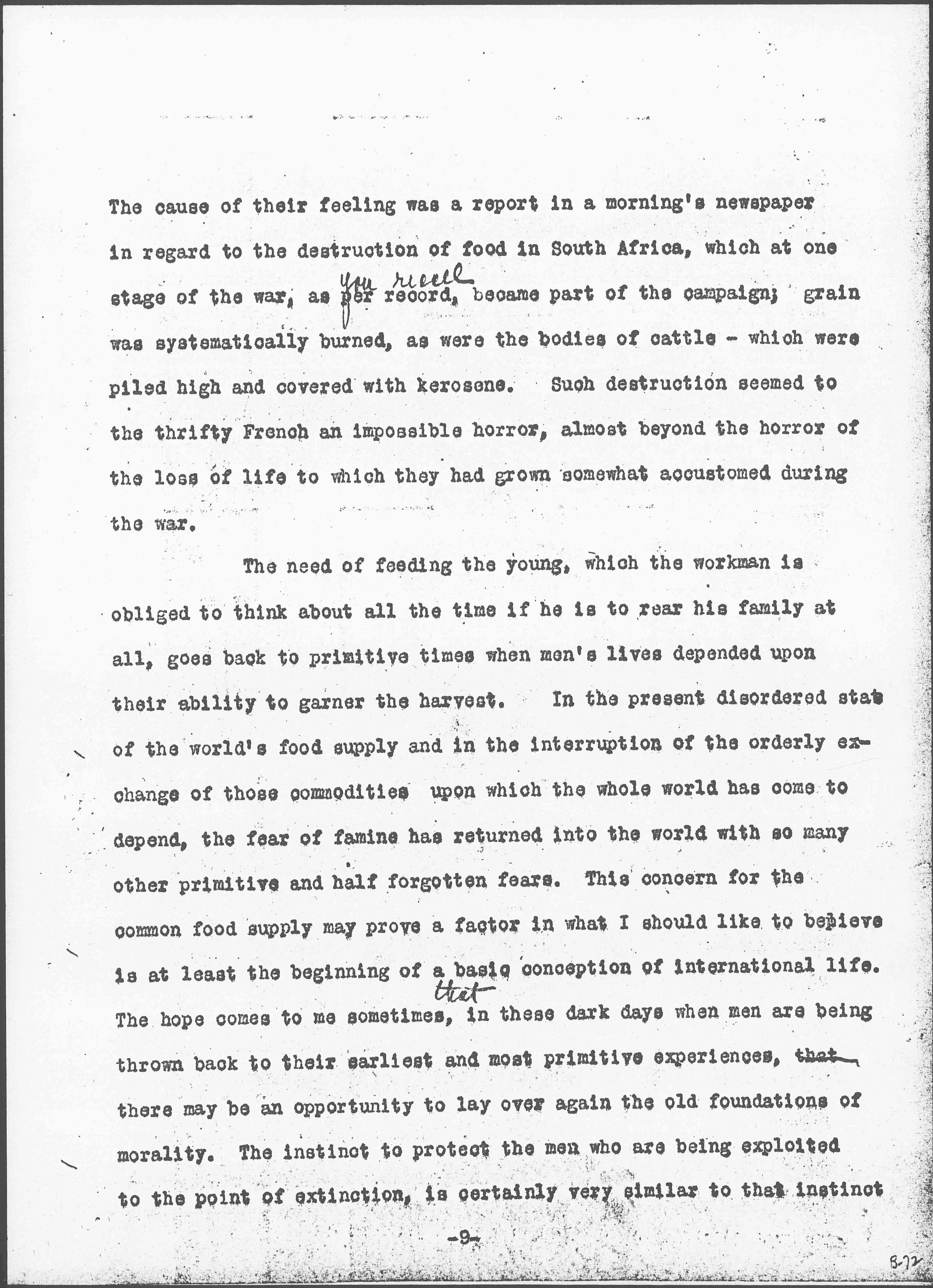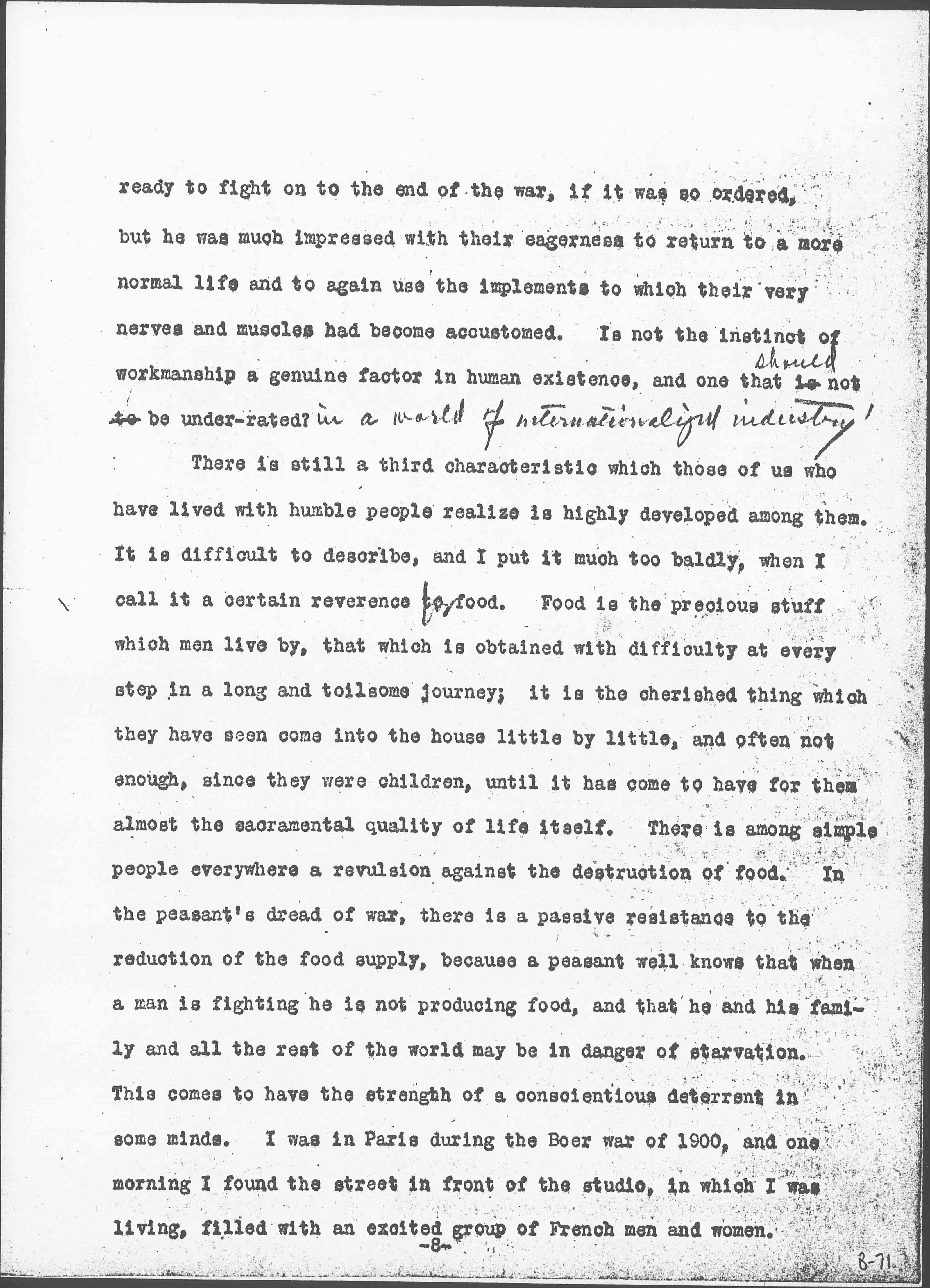 There is still a third characteristic which those of us who have lived with humble people realize is highly developed among them. It is difficult to describe, and I put it much too baldly, when I call it a certain reverence to <for> food. Food is the precious stuff which men live by, that which is obtained with difficulty at every step in a long and toilsome journey; it is the cherished thing which they have seen come into the house little by little, and often not enough, since they were children, until it has come to have for them almost the sacramental quality of life itself. There is among simple people everywhere a revulsion against the destruction of food. In the peasant's dread of war, there is a passive resistance to the reduction of the food supply, because a peasant well knows that when a man is fighting he is not producing food, and that he and his family and all the rest of the world may be in danger of starvation. This comes to have the strength of a conscientious deterrent in some minds. I was in Paris during the Boer War of 1900, and one morning I found the street in front of the studio, in which I was living, filled with an excited group of French men and women. [page 9] The cause of their feeling was a report in a morning's newspaper in regard to the destruction of food in South Africa, which at one stage of the war, as per record <you recall>, became part of the campaign; grain was systematically burned, as were the bodies of cattle -- which were piled high and covered with kerosene. Such destruction seemed to the thrifty French an impossible horror, almost beyond the horror of the loss of life to which they had grown somewhat accustomed during the war.