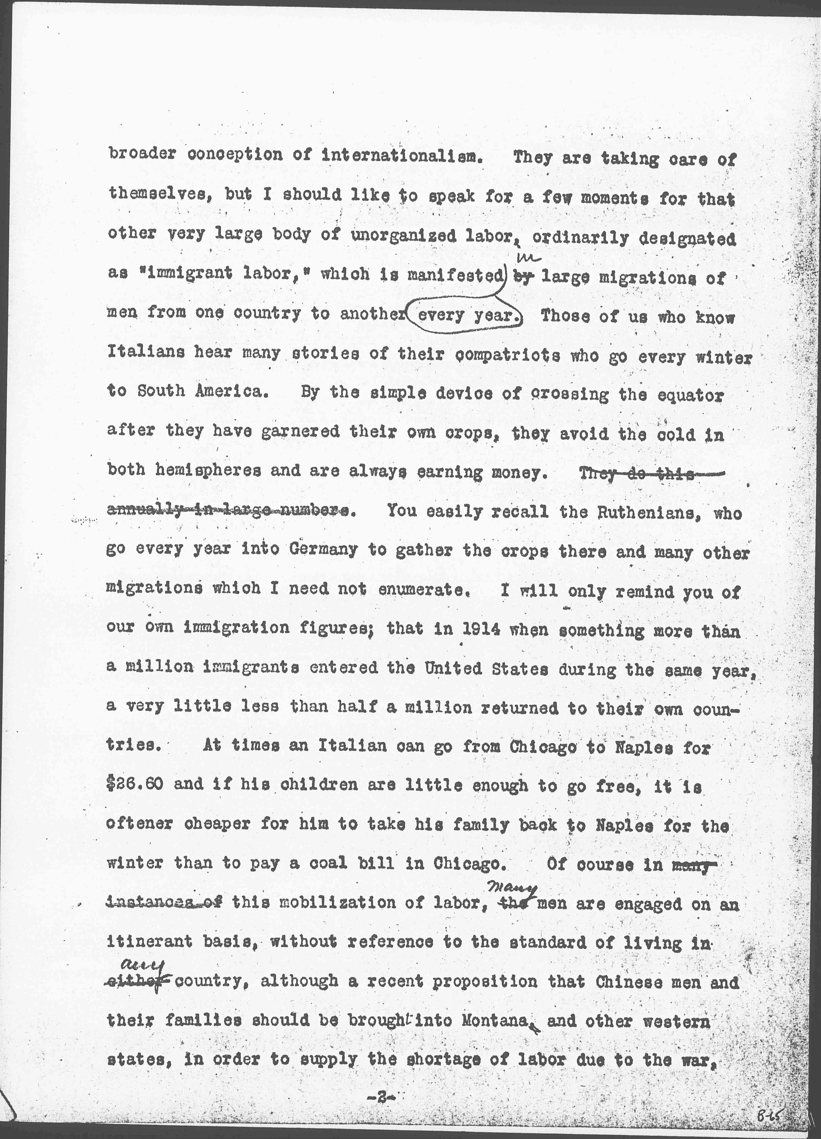 I shall not undertake to speak for organized labor, because as you well know, the more the <than> twelve million men the world around who are organized into trades unions, hold their national conventions annually and for many years have maintained the custom of sending fraternal delegates from one national convention to another. Trade unionists are, I believe, a very great factor in forming newer conceptions of international life and although they, like other men, in this day and generation, have been swept from all other ties by a strong nationalistic loyalty and are in many cases fighting against each other, they still hold their common body of doctrines and their mutual interests. Many of them believe they will eventually become reunited upon the basis of a [page 2] broader conception of internationalism. They are taking care of themselves, but I should like to speak for a few moments for that other very large body of unorganized labor, ordinarily designated as "immigrant labor," which is manifested <every year> by <in> large migrations of men from one country to another. Those of us who know Italians hear many stories of their compatriots who go every winter to South America. By the simple device of crossing the equator after they have garnered their own crops, they avoid the cold in both hemispheres and are always earning money. They do this annually in large numbers. You easily recall the Ruthenians, who go every year into Germany to gather the crops there and many other migrations which I need not enumerate. I will only remind you of our own immigration figures; that in 1914 when something more than a million immigrants entered the United States during the same year, a very little less than half a million returned to their own countries. At times an Italian can go from Chicago to Naples for $26.60 and if his children are little enough to go free, it is oftener cheaper for him to take his family back to Naples for the winter than to pay a coal bill in Chicago. Of course in many instances of this mobilization of labor, the <many> men are engaged on an itinerant basis, without reference to the standard of living in either <any> country, although a recent proposition that Chinese men and their families should be brought into Montana and other western states, in order to supply the shortage of labor due to the war, [page 3] was rejected on the ground that the American standards of living might be permanently lowered.
