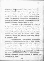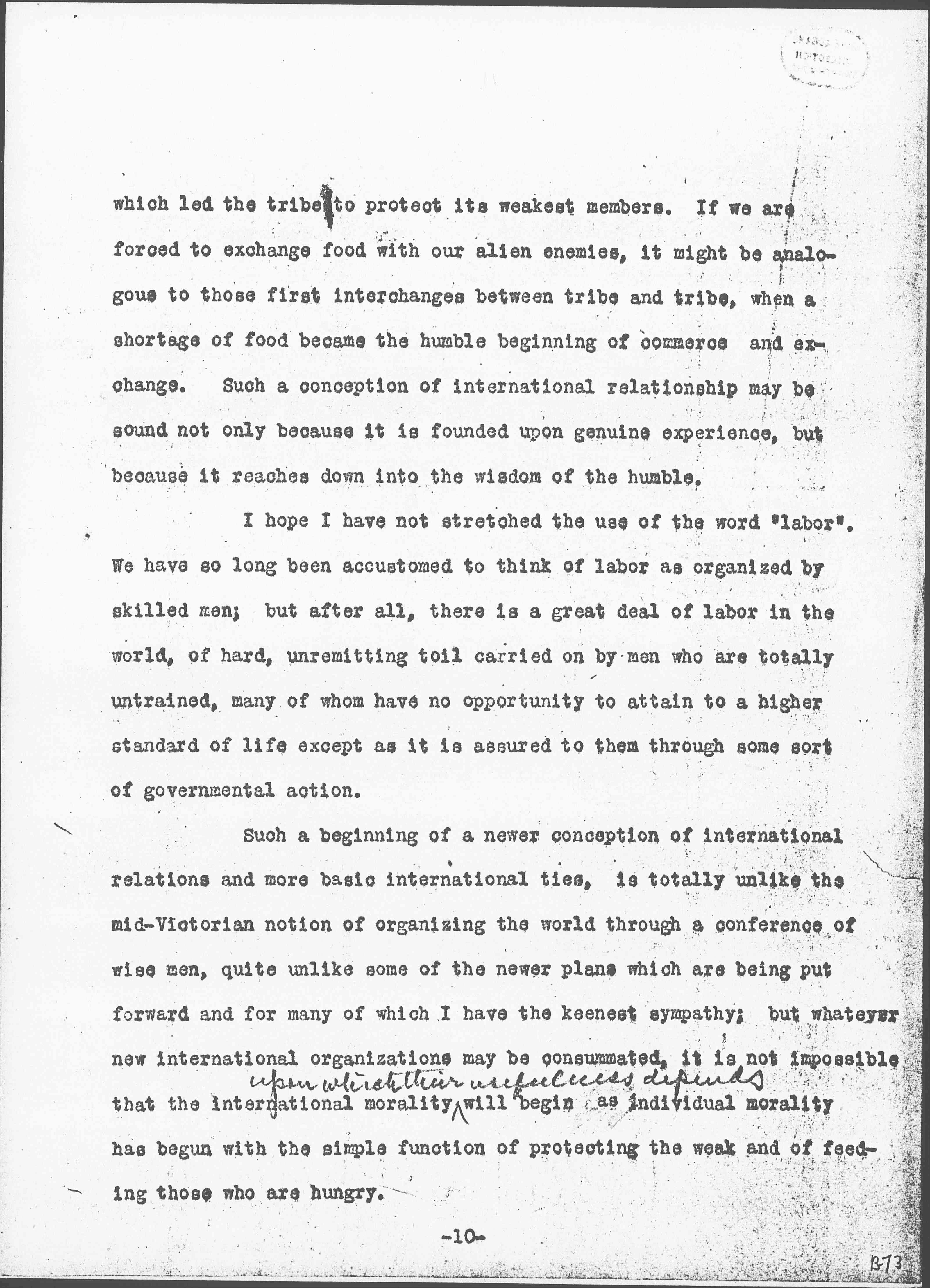 The need of feeding the young, which the workman is obliged to think about all the time if he is to rear his family at all, goes back to primitive times when men's lives depended upon their ability to garner the harvest. In the present disordered state of the world's food supply and in the interruption of the orderly exchange of those commodities upon which the whole world has come to depend, the fear of famine has returned into the world with so many other primitive and half forgotten fears. This concern for the common food supply may prove a factor in what I should like to believe is at least the beginning of a basic conception of international life. The hope comes to me sometimes, <that> in these dark days when men are being thrown back to their earliest and most primitive experiences, that there may be an opportunity to lay over again the old foundations of morality. The instinct to protect the men who are being exploited to the point of extinction, is certainly very similar to that instinct [page 10] which led the tribe to protect its weakest members. If we are forced to exchange food with our alien enemies, it might be analogous to those first interchanges between tribe and tribe, when a shortage of food became the humble beginning of commerce and exchange. Such a conception of international relationship may be sound not only because it is founded upon genuine experience, but because it reaches down into the wisdom of the humble.