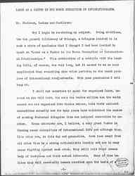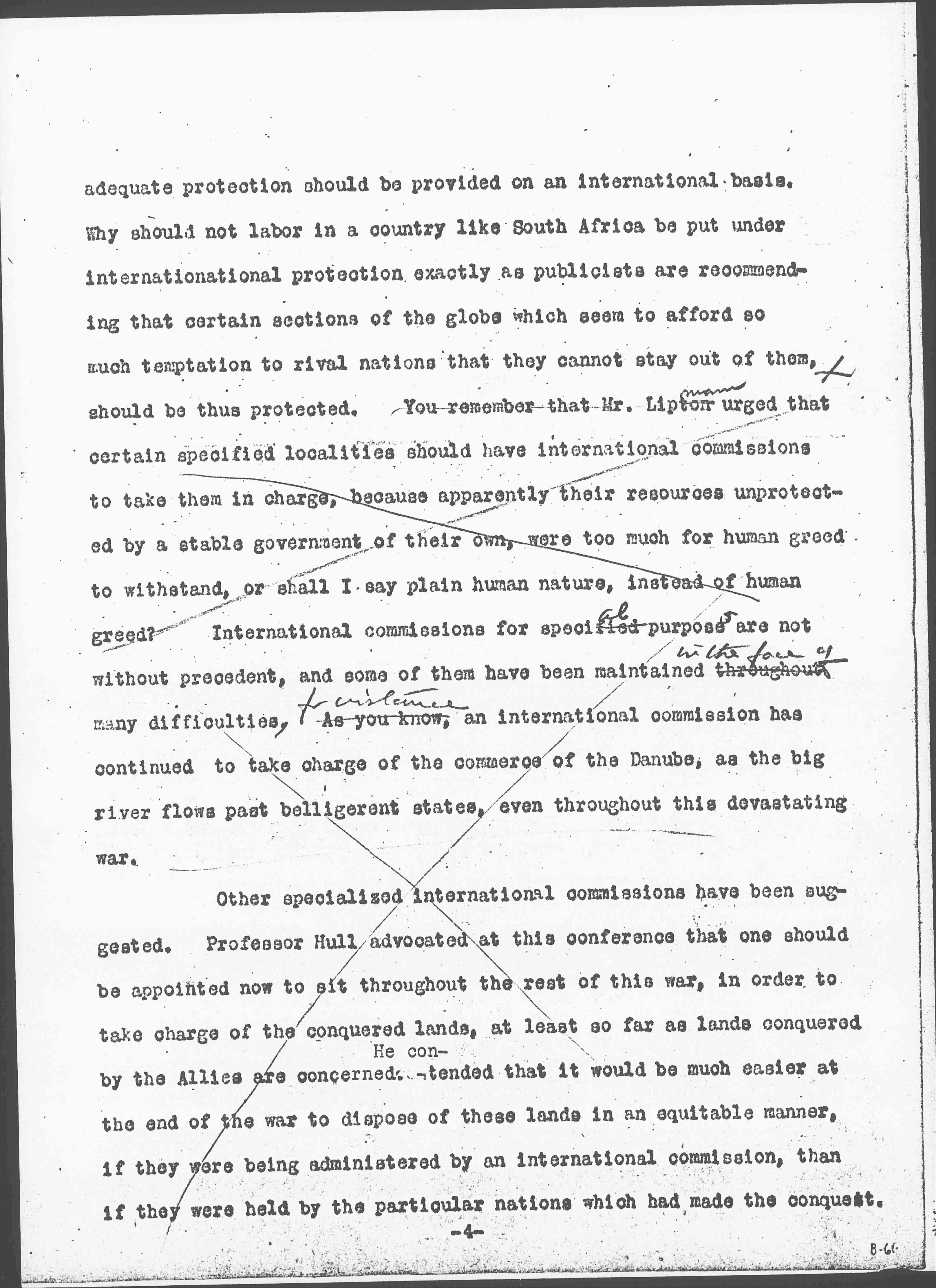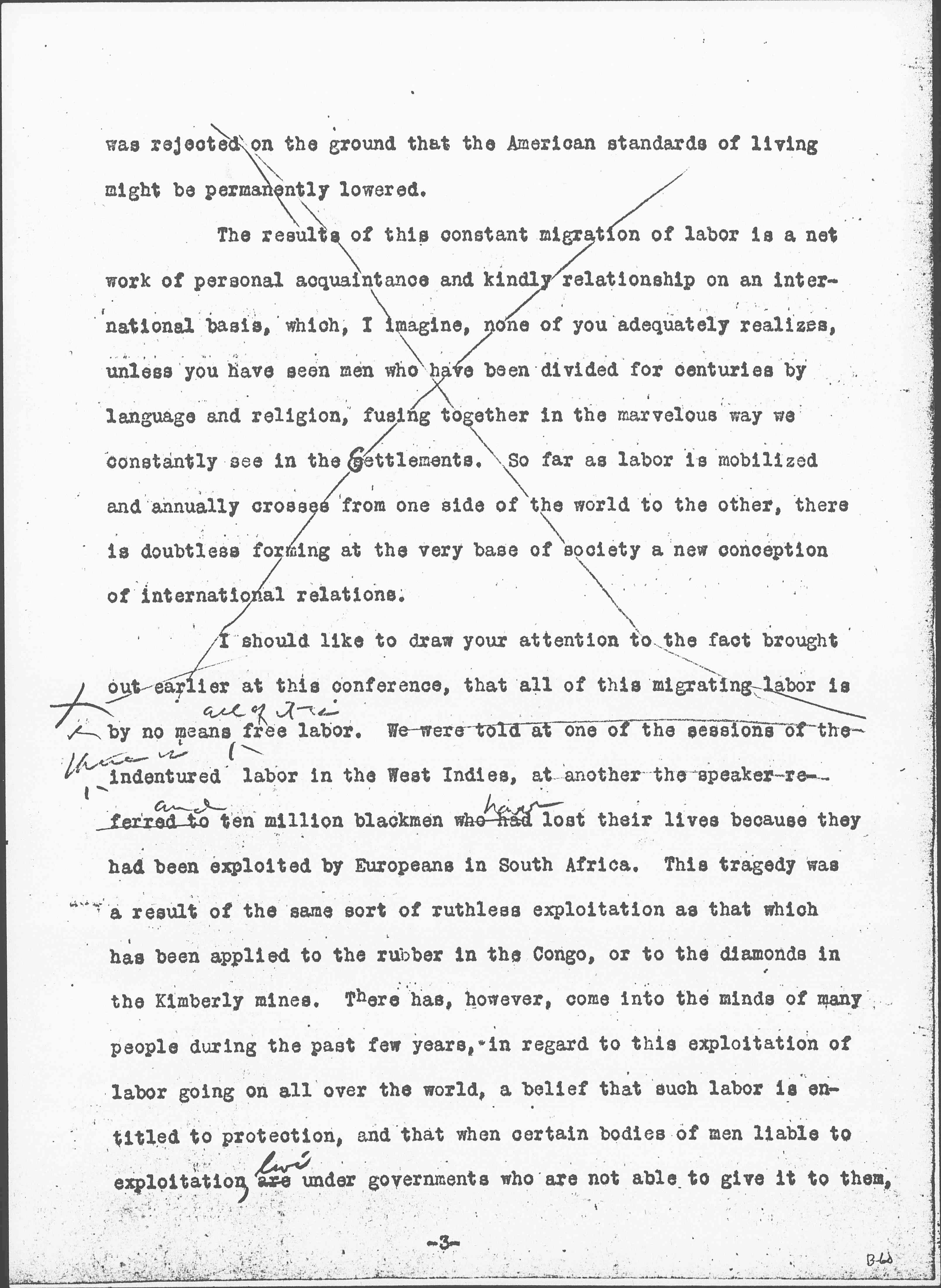 I should like to draw your attention to the fact brought out earlier at this conference, that all of this migrating labor is by no means <all of it is> free labor. We were told at one of the sessions of the <There is> indentured labor in the West Indies, at another the speaker referred to <and> ten million [black men] who had <have> lost their lives because they had been exploited by Europeans in South Africa. This tragedy was a result of the same sort of ruthless exploitation as that which has been applied to the rubber in the Congo, or to the diamonds in the [Kimberley] mines. There has, however, come into the minds of many people during the past few years, in regard to this exploitation of labor going on all over the world, a belief that such labor is entitled to protection, and that when certain bodies of men liable to exploitation, are <live> under governments who are not able to give it to them, [page 4] adequate protection should be provided on an international basis. Why should not labor in a country like South Africa be put under international protection exactly as publicists are recommending that certain sections of the globe which seem to afford so much temptation to rival nations that they cannot stay out of them, should be thus protected. You remember that Mr. [Lippmann] urged that certain specified localities should have international commissions to take them in charge, because apparently their resources unprotected by a stable government of their own, were too much for human greed to withstand, or shall I say plain human nature, instead of human greed? International commissions for special purposes are not without precedent, and some of them have been maintained throughout <in the face of> many difficulties, As you know <for instance>, an international commission has continued to take charge of the commerce of the Danube, as the big river flows past belligerent states, even throughout this devastating war.
