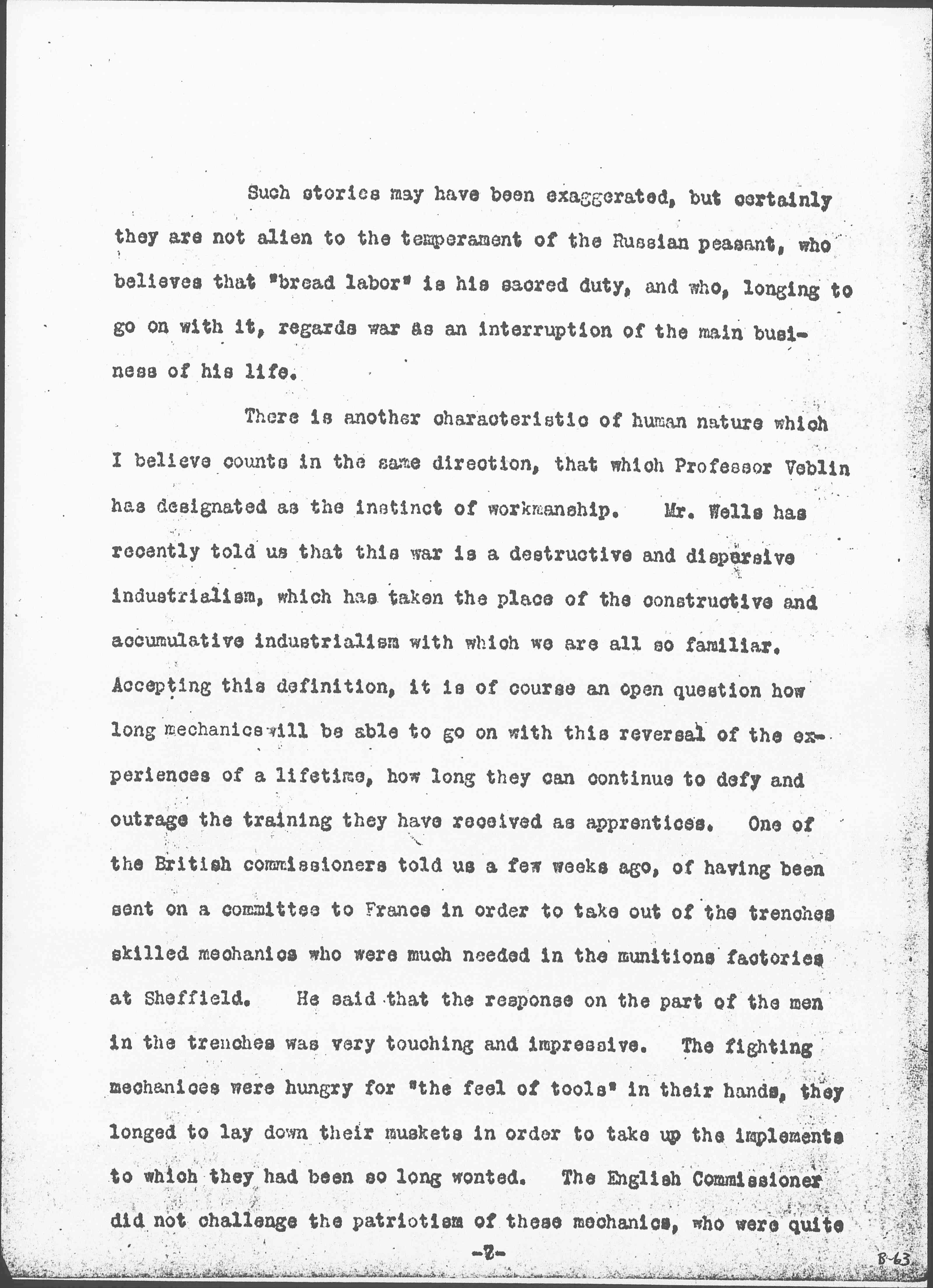 There is another characteristic of human nature which I believe counts in the same direction, that which Professor [Veblen] has designated as the instinct of workmanship. Mr. Wells has recently told us that this war is a destructive and dispersive industrialism, which has taken the place of the constructive and accumulative industrialism with which we are all so familiar. Accepting this definition, it is of course an open question how long mechanics will be able to go on with this reversal of the experiences of a lifetime, how long they can continue to defy and outrage the training they have received as apprentices. One of the British commissioners told us a few weeks ago, of having been sent on a committee to France in order to take out of the trenches skilled mechanics who were much needed in the munitions factories at Sheffield. He said that the response on the part of the men in the trenches was very touching and impressive. The fighting [mechanics] were hungry for "the feel of tools" in their hands, they longed to lay down their muskets in order to take up the implements to which they had been so long wonted. The English Commissioner did not challenge the patriotism of these mechanics, who were quite