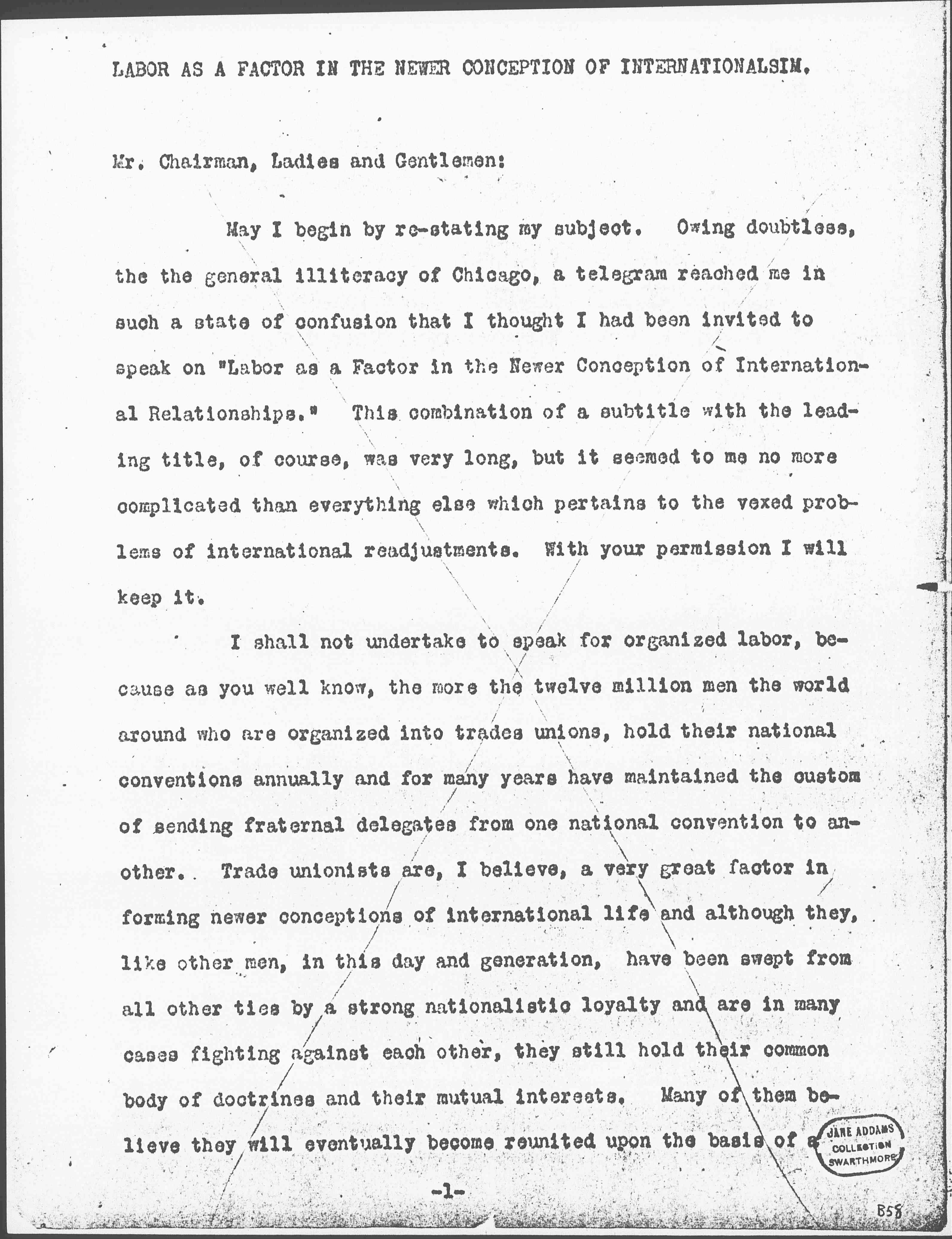May I begin by [restating] my subject. Owing doubtless, [to] the general illiteracy of Chicago, a telegram reached me in such a state of confusion that I thought I had been invited to speak on "Labor as a Factor in the Newer Conception of International Relationships." This combination of a subtitle with the leading title, of course, was very long, but it seemed to me no more complicated than everything else which pertains to the vexed problems of international readjustments. With your permission I will keep it.