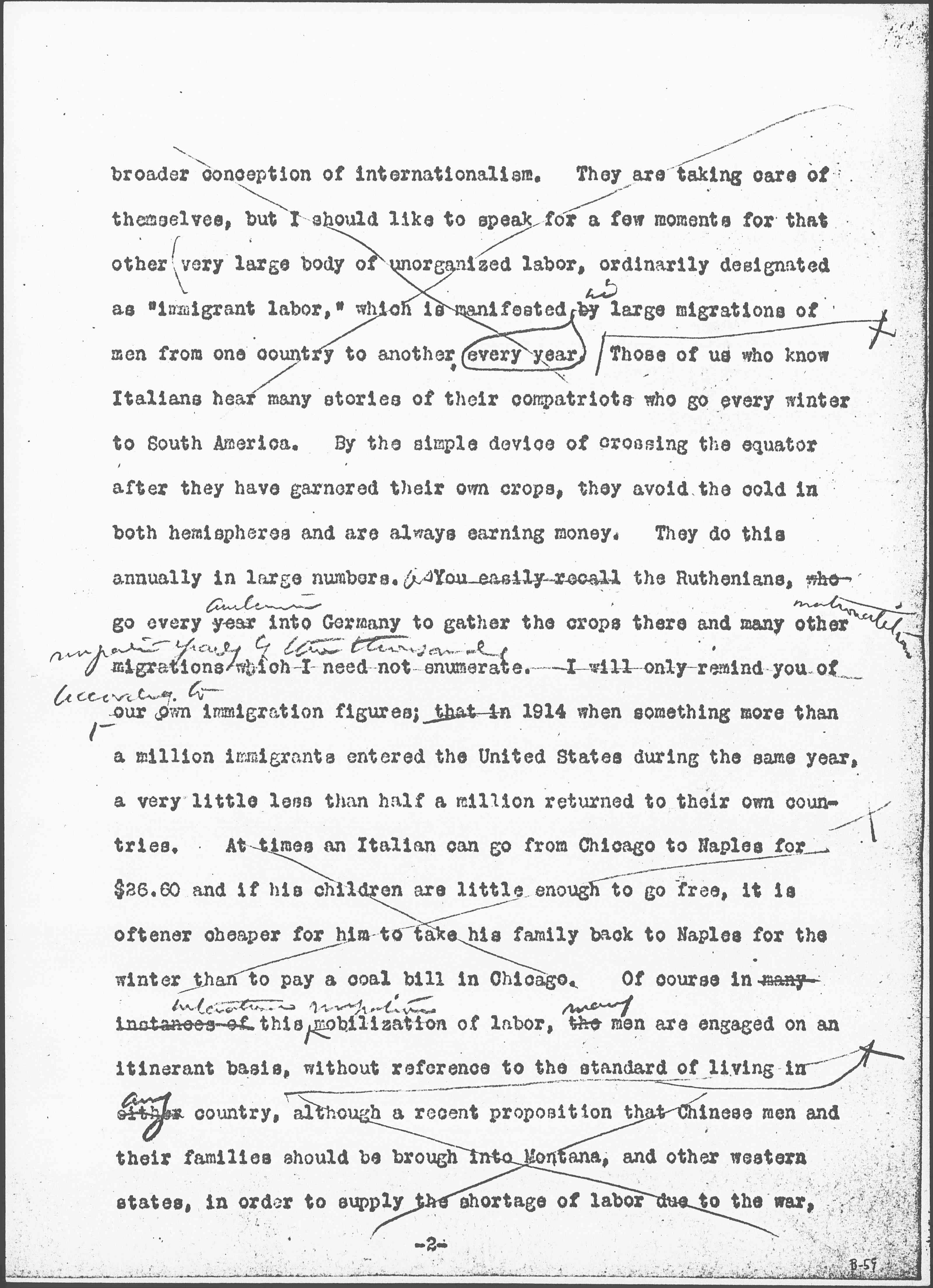 I shall not undertake to speak for organized labor, because as you well know, the more [than] twelve million men the world around who are organized into trades unions, hold their national conventions annually and for many years have maintained the custom of sending fraternal delegates from one national convention to another. Trade unionists are, I believe, a very great factor in forming newer conceptions of international life and although they, like other men, in this day and generation, have been swept from all other ties by a strong nationalistic loyalty and are in many cases fighting against each other, they still hold their common body of doctrines and their mutual interests. Many of them believe they will eventually become reunited upon the basis of a [page 2] broader conception of internationalism. They are taking care of themselves, but I should like to speak for a few moments for that other very large body of unorganized labor, ordinarily designated as "immigrant labor," which is manifested <every year> by <in > large migrations of men from one country to another. Those of us who know Italians hear many stories of their compatriots who go every winter to South America. By the simple device of crossing the equator after they have garnered their own crops, they avoid the cold in both hemispheres and are always earning money. They do this annually in large numbers. <As> You easily recall the Ruthenians, who go every year <autumn> into Germany to gather the crops there and many other <nationalities migrate yearly by the thousands> migrations which I need not enumerate. I will only remind you of <according to> our own immigration figures; that in 1914 when something more than a million immigrants entered the United States during the same year, a very little less than half a million returned to their own countries. At times an Italian can go from Chicago to Naples for $26.60 and if his children are little enough to go free, it is oftener cheaper for him to take his family back to Naples for the winter than to pay a coal bill in Chicago. Of course in many instances of this <international migration> mobilization of labor, the <many> men are engaged on an itinerant basis, without reference to the standard of living in either <any> country, although a recent proposition that Chinese men and their families should be brought into Montana, and other western states, in order to supply the shortage of labor due to the war, [page 3] was rejected on the ground that the American standards of living might be permanently lowered.
