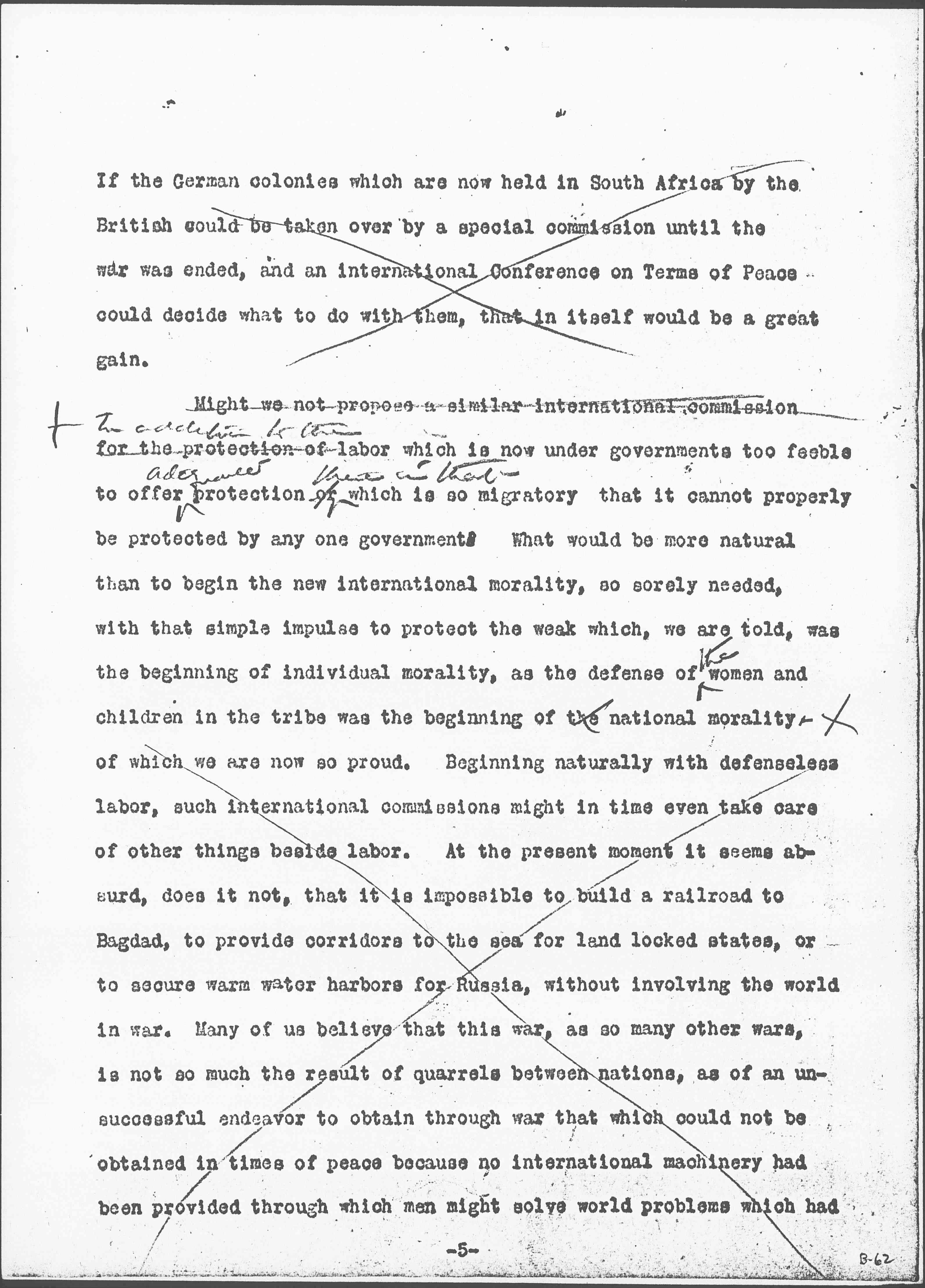 Might we not propose a similar international commission for the protection of <In addition to the> labor which is now under governments too feeble to offer <adequate> protection or <there is that> which is so migratory that it cannot properly be protected by any one government. What would be more natural than to begin the new international morality, so sorely needed, with that simple impulse to protect the weak which, we are told, was the beginning of individual morality, as the defense of <the> women and children in the tribe was the beginning of the national morality. of which we are now so proud. Beginning naturally with defenseless labor, such international commissions might in time even take care of other things beside labor. At the present moment it seems absurd, does it not, that it is impossible to build a railroad to [Baghdad], to provide corridors to the sea for land locked states, or to secure warm water harbors for Russia, without involving the world in war. Many of us believe that this war, as so many other wars, is not so much the result of quarrels between nations, as of an unsuccessful endeavor to obtain through war that which could not be obtained in times of peace because no international machinery had been provided through which men might solve world problems which had [page 6] become intolerable and unbearable. We are told that <in> all over the face of the Earth <civilized nations,> statesmen are longing for some sort of international organization which will enable them to take care of complicated situations sure to arise during the coming years, as they have arisen in the past. Why might not statesmen begin at least with that which is so appealing, international protection to simple people whose labor is constantly exploited? [page 7]