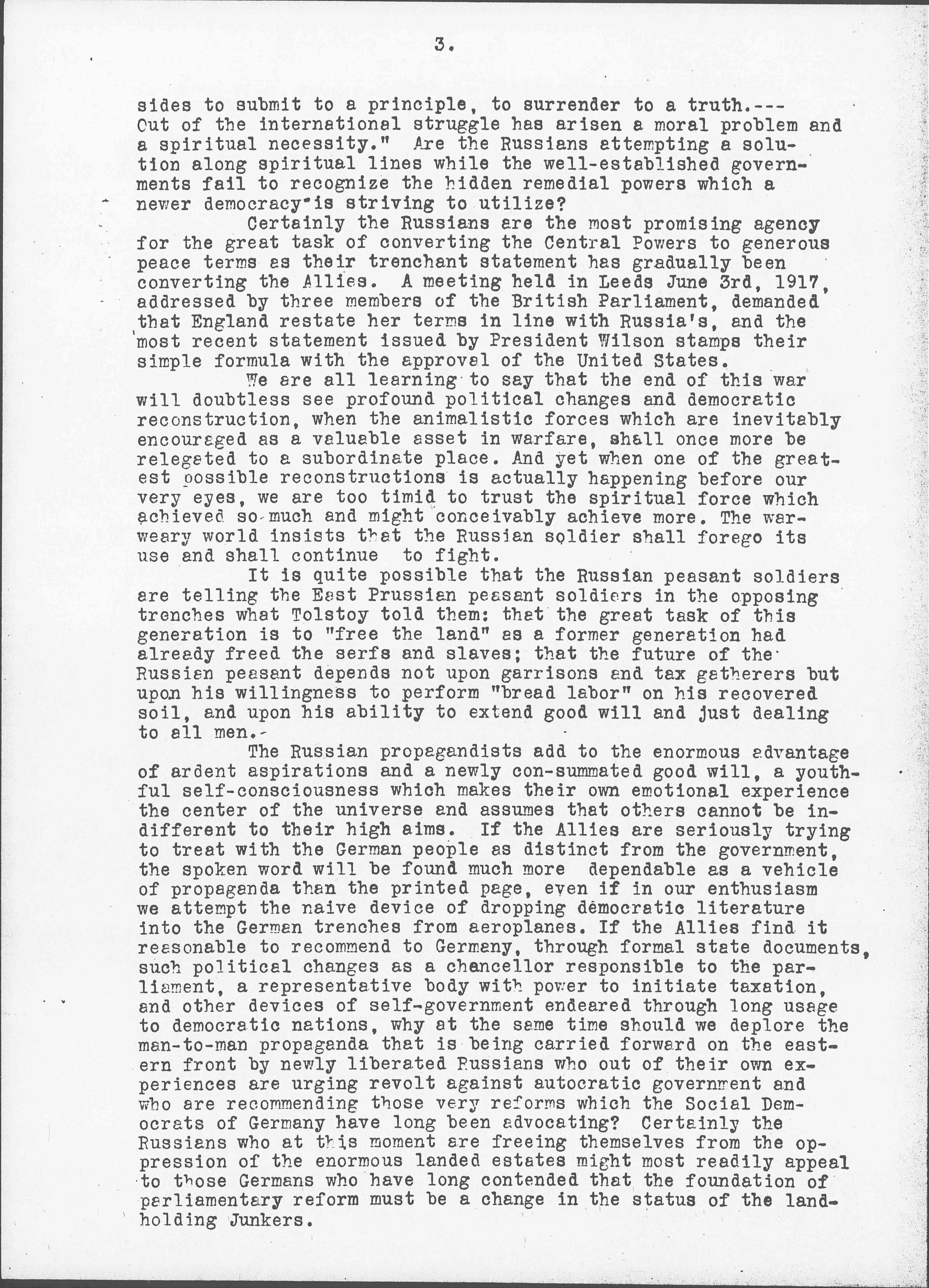 The Russian propagandists add to the enormous advantage of ardent aspirations and a newly [consummated] good will, a youthful self-consciousness which makes their own emotional experience the center of the universe and assumes that others cannot be indifferent to their high aims. If the Allies are seriously trying to treat with the German people as distinct from the government, the spoken word will be found much more dependable as a vehicle of propaganda than the printed page, even if in our enthusiasm we attempt the naive device of dropping democratic literature into the German trenches from [airplanes]. If the Allies find it reasonable to recommend to Germany, through formal state documents, such political changes as a chancellor responsible to the parliament, a representative body with power to initiate taxation, and other devices of self-government endeared through long usage to democratic nations, why at the same time should we deplore the man-to-man propaganda that is being carried forward on the eastern front by newly liberated Russians who out of their own experiences are urging revolt against autocratic government and who are recommending those very reforms which the Social Democrats of Germany have long been advocating? Certainly the Russians who at this moment are freeing themselves from the oppression of the enormous landed estates might most readily appeal to those Germans who have long contended that the foundation of parliamentary reform must be a change in the status of the landholding Junkers. [page 4]