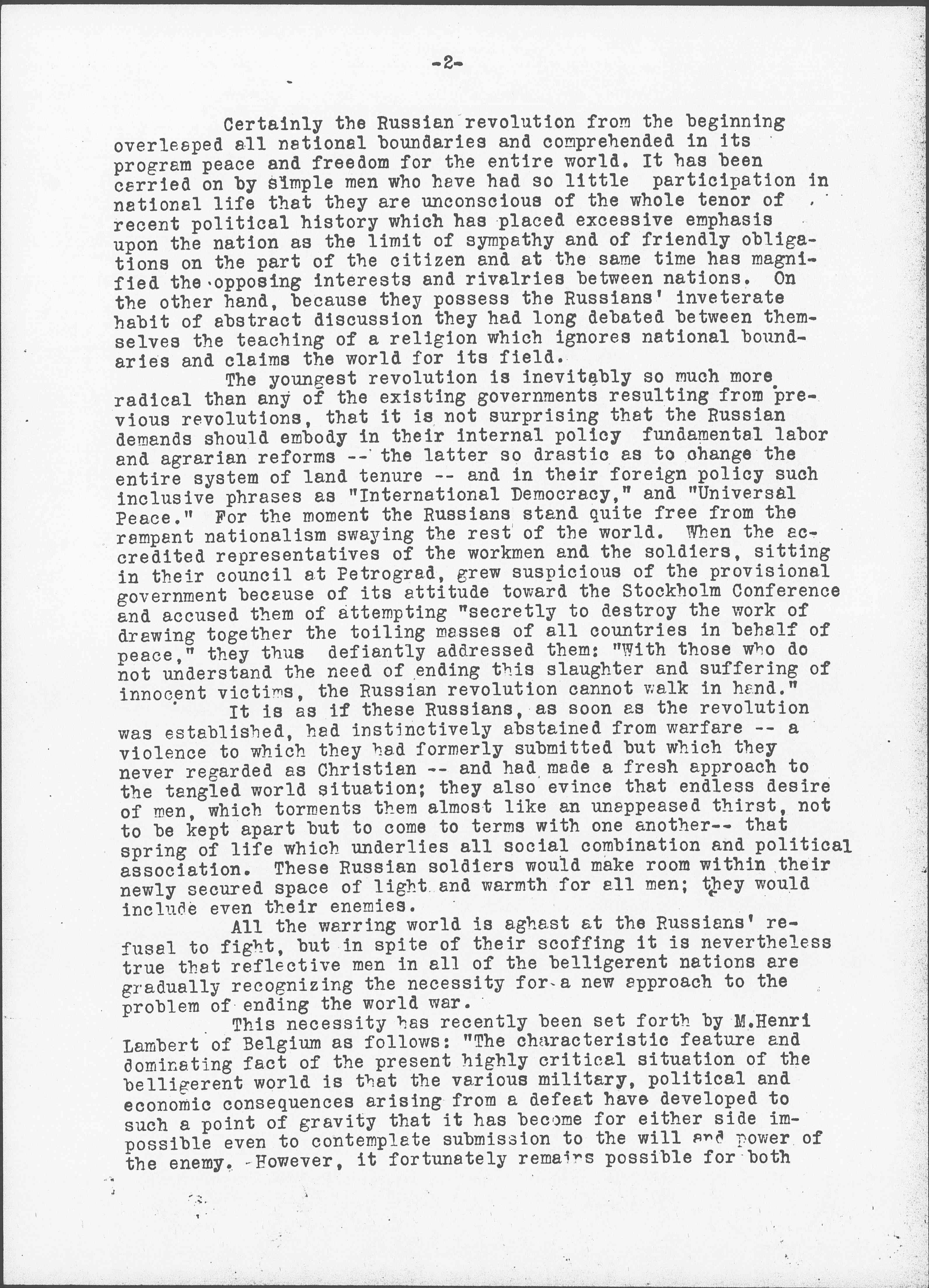 This necessity has recently been set forth by M. Henri Lambert of Belgium as follows: "The characteristic feature and dominating fact of the present highly critical situation of the belligerent world is that the various military, political and economic consequences arising from a defeat have developed to such a point of gravity that it has become for either side impossible even to contemplate submission to the will and power of the enemy. However, it fortunately remains possible for both [page 3] sides to submit to a principle, to surrender to a truth. -- Out of the international struggle has arisen a moral problem and a spiritual necessity." Are the Russians attempting a solution along spiritual lines while the well-established governments fail to recognize the hidden remedial powers which a newer democracy is striving to utilize?