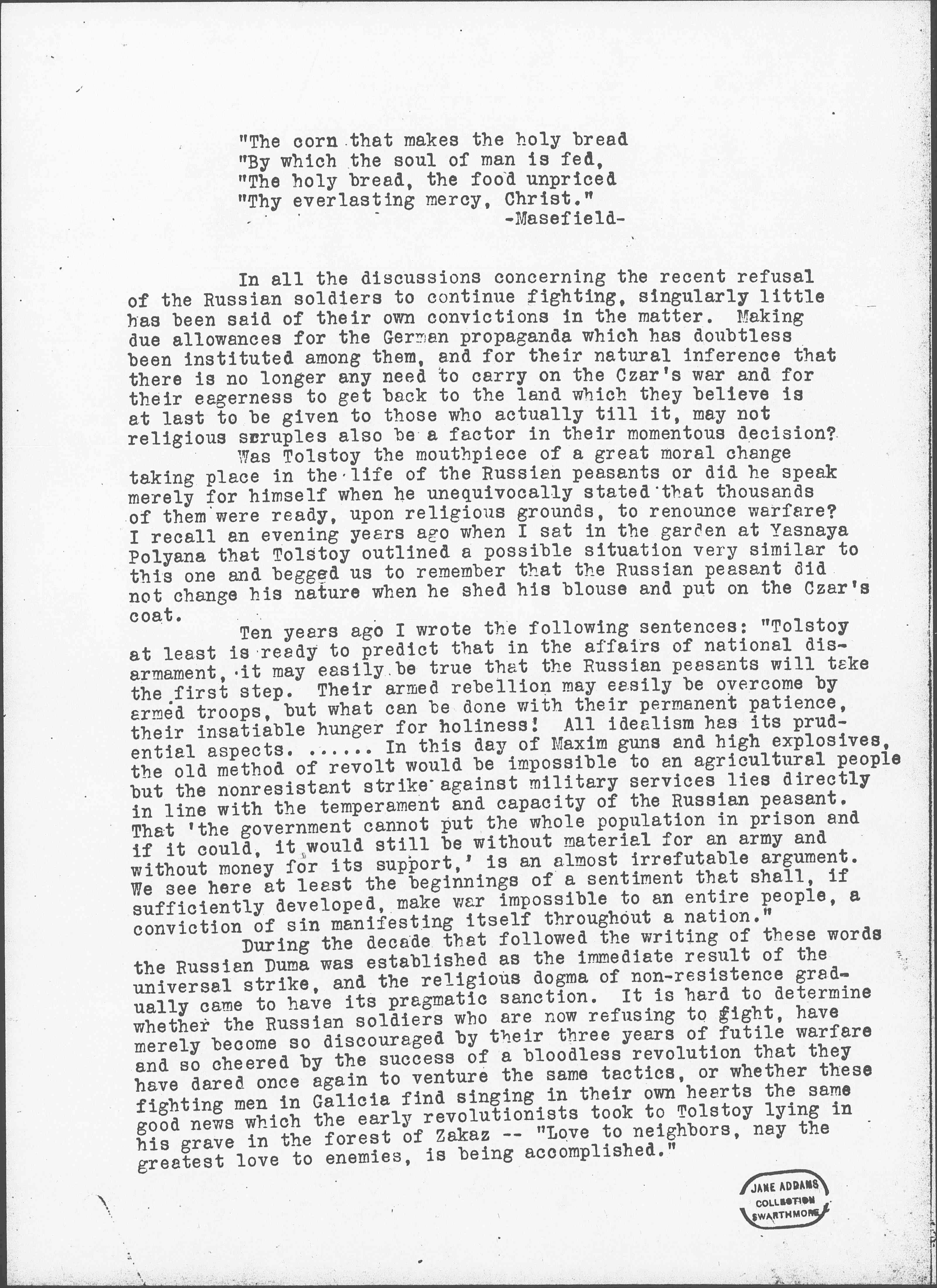 During the decade that followed the writing of these words the Russian Duma was established as the immediate result of the universal strike, and the religious dogma of [nonresistance] gradually came to have its pragmatic sanction. It is hard to determine whether the Russian soldiers who are now refusing to fight, have merely become so discouraged by their three years of futile warfare and so cheered by the success of a bloodless revolution that they have dared once again to venture the same tactics, or whether these fighting men in Galicia find singing in their own hearts the same good news which the early revolutionists took to Tolstoy lying in his grave in the forest of Zakaz -- "Love to neighbors, nay the greatest love to enemies, is being accomplished." [page 2]