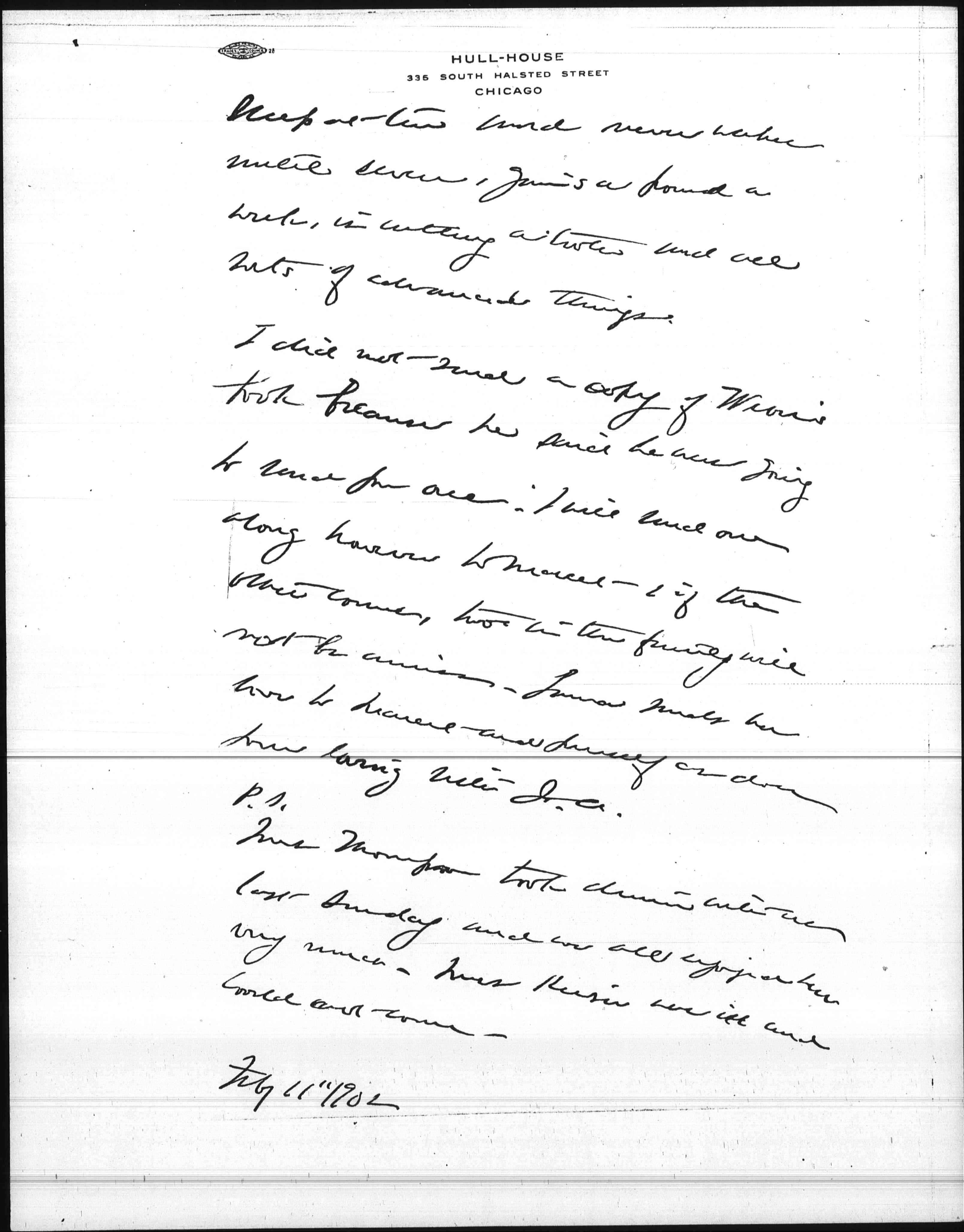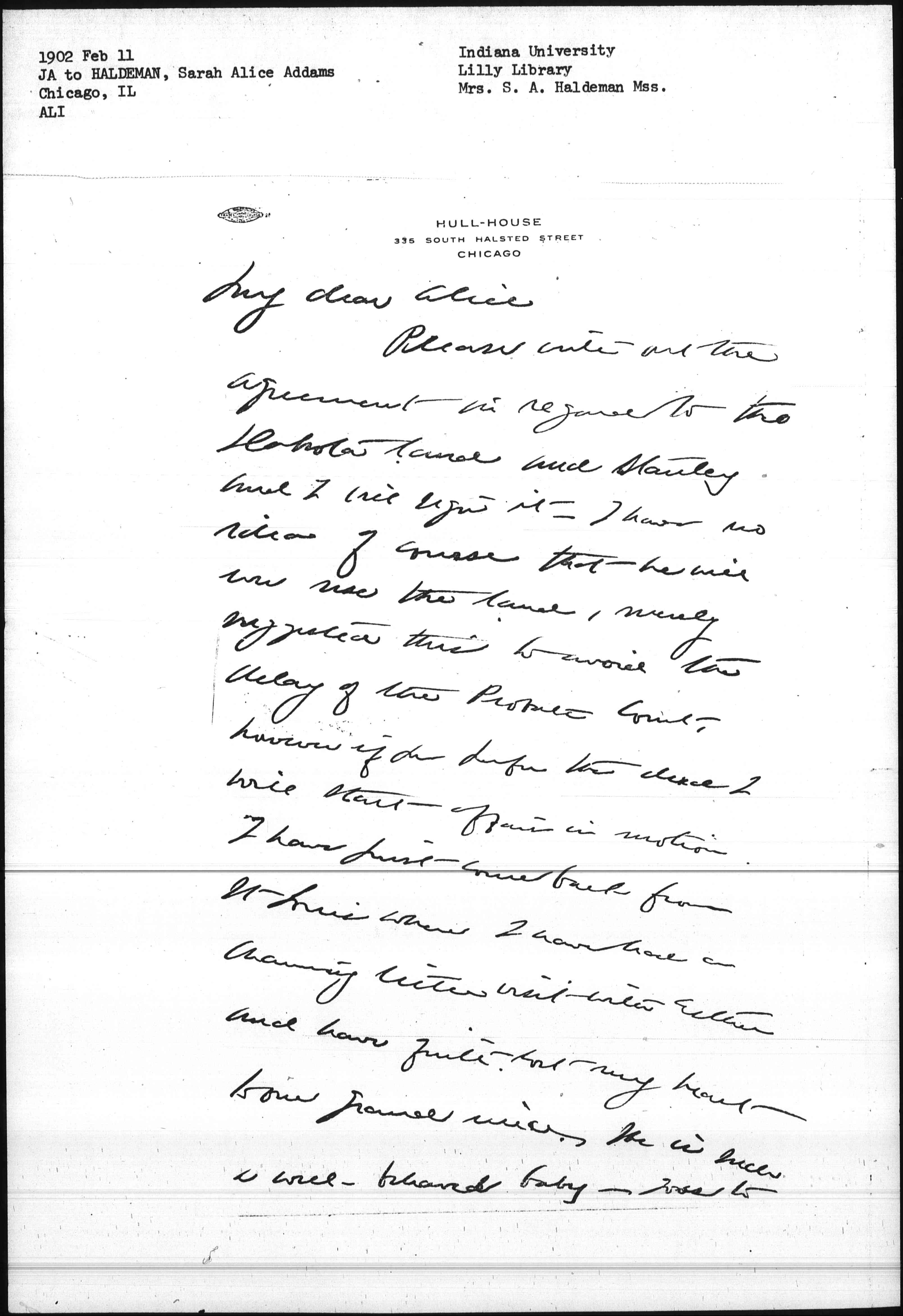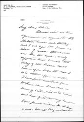 Please write out the agreement in regard to the Dakota land and Stanley and I will sign it. I have no idea of course that he will ever use the land, merely suggested this to avoid the delay of the Probate Court, however if you prefer the deed I will start affairs in motion. I have just come back from St Louis where I have had a charming little visit with Esther and have quite lost my heart to our grand niece. She is such a well-behaved baby -- goes to [page 2] sleep at ten and never wakes until seven, gains a pound a week, is cutting a tooth and all sorts of advanced things.