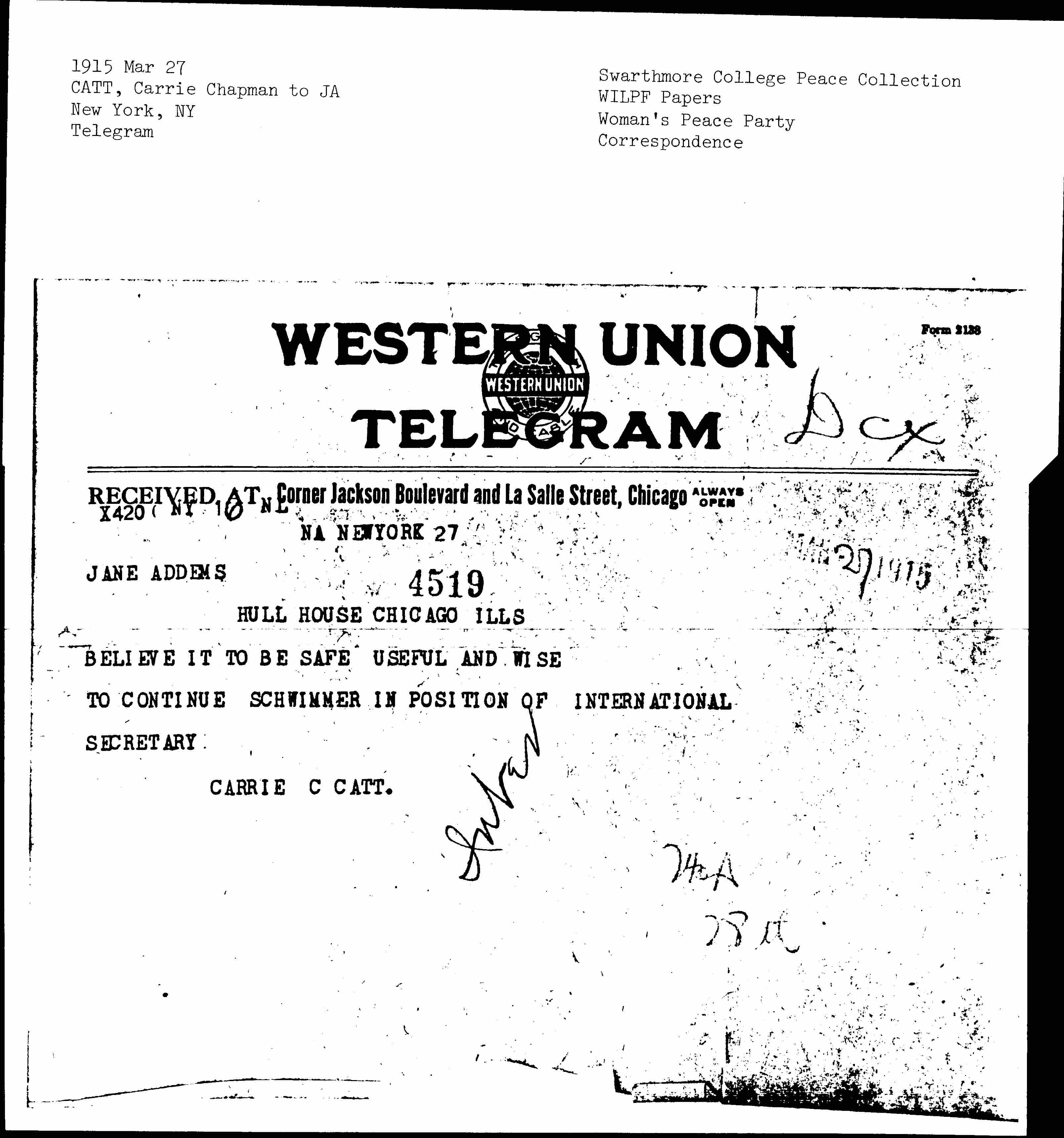 RECEIVED AT Corner Jackson Boulevard and La Salle Street, Chicago [stamped]