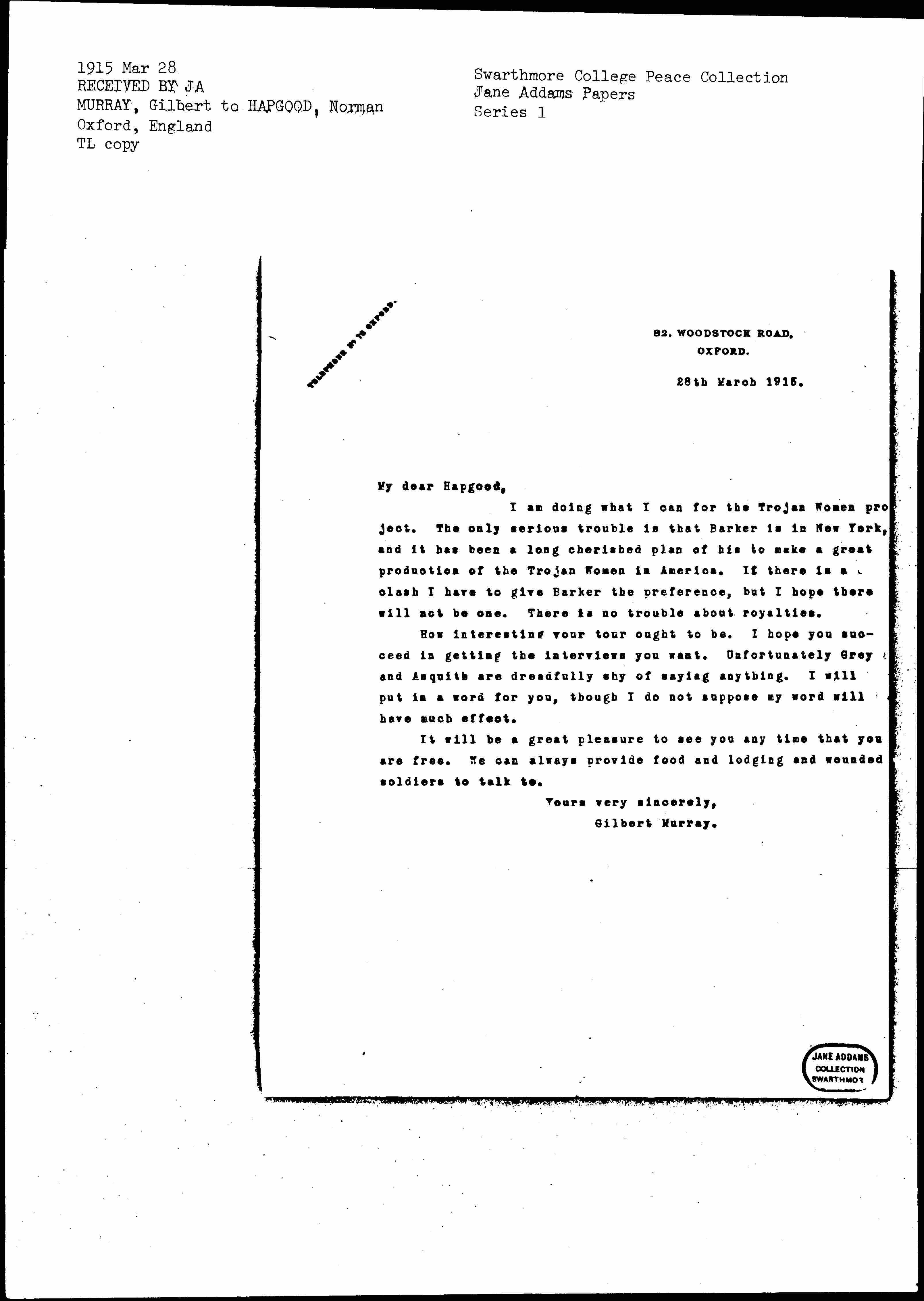 I am doing what I can for the Trojan Women project. The only serious trouble is that Barker is in New York, and it has been a long cherished plan of his to make a great production of the Trojan Women in America. If there is a clash I have to give Barker the preference, but I hope there will not be one. There is no trouble about royalties.