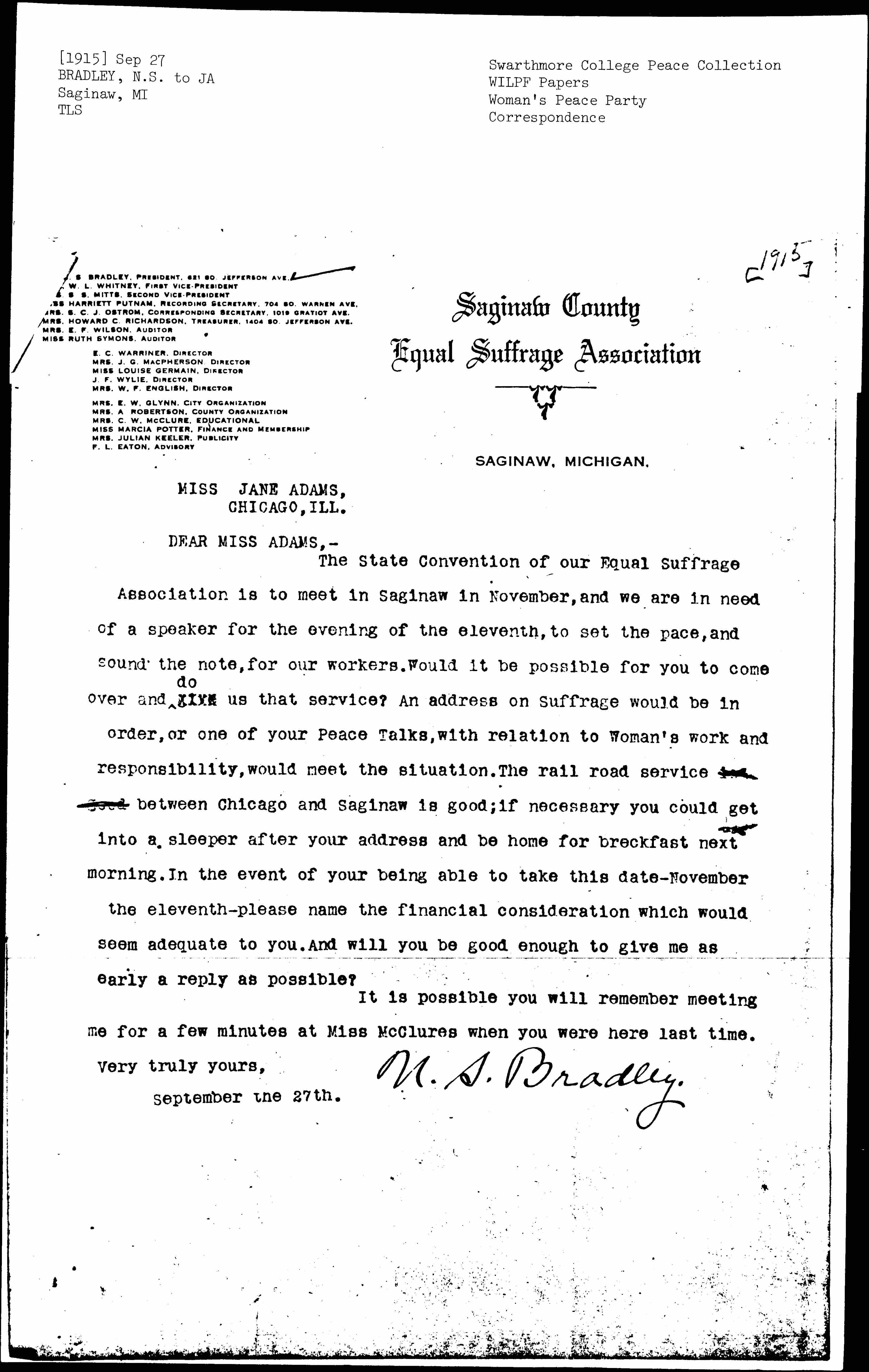 The State Convention of our Equal Suffrage Association is to meet in Saginaw in November, and we are in need of a speaker for the evening of the eleventh, to set the pace, and sound the note, for our workers. Would it be possible for you to come over and <do> [illegible] us that service? An address on Suffrage would be in order, or one of your Peace Talks, with relation to Woman's work and responsibility, would meet the situation. The rail road service is Good between Chicago and Saginaw is good; if necessary you could get into a sleeper after your address and be home for [breakfast] next morning. In the event of your being able to take this date -- November the eleventh -- please name the financial consideration which would seem adequate to you. And will you be good enough to give me as early a reply as possible?