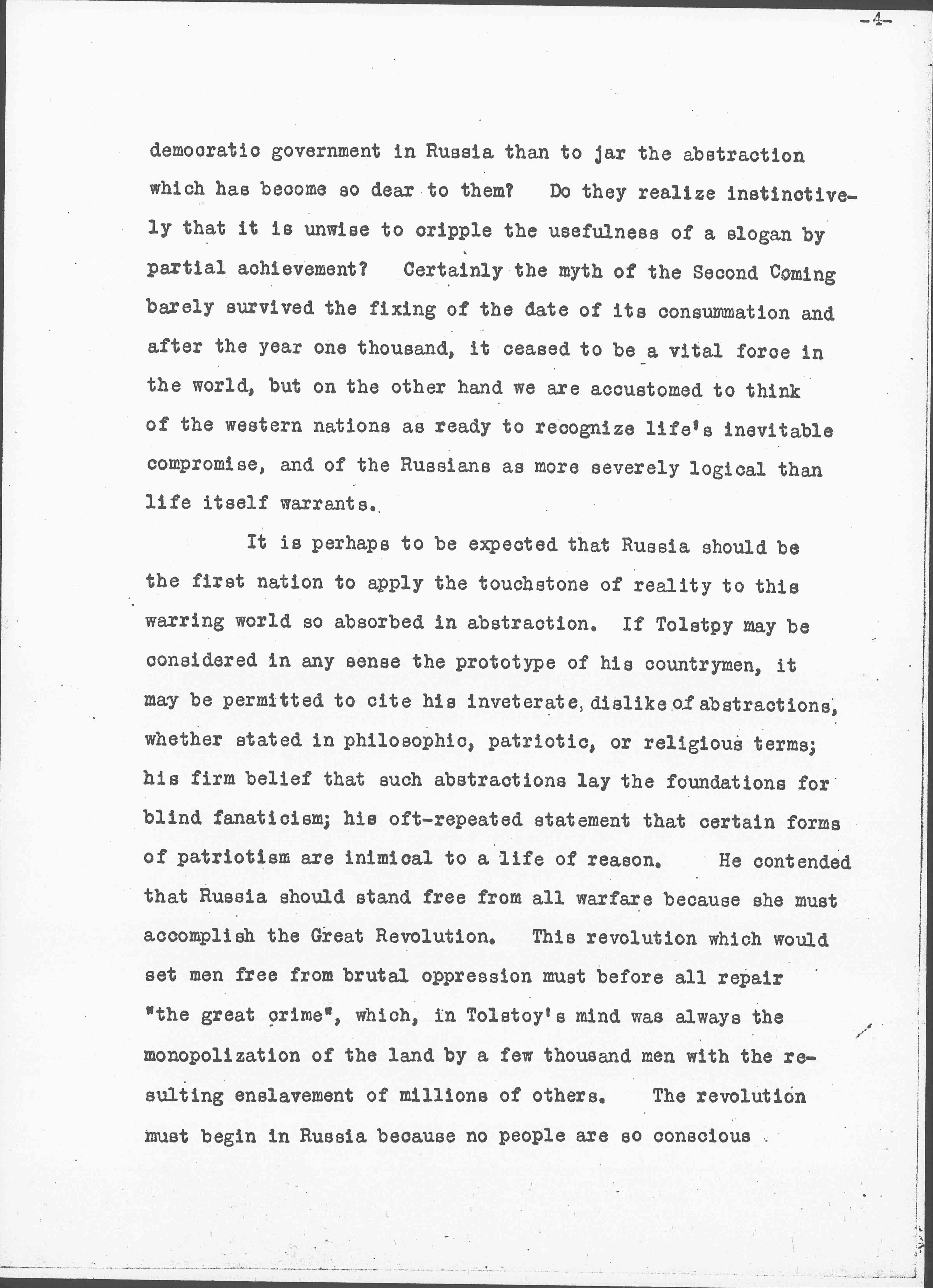 [missing page(s)] democratic government in Russia than to jar the abstraction which has become so dear to them? Do they realize instinctively that it is unwise to cripple the usefulness of a slogan by partial achievement? Certainly the myth of the Second Coming barely survived the fixing of the date of its consummation and after the year one thousand, it ceased to be a vital force in the world, but on the other hand we are accustomed to think of the western nations as ready to recognize life's inevitable compromise, and of the Russians as more severely logical than life itself warrants.