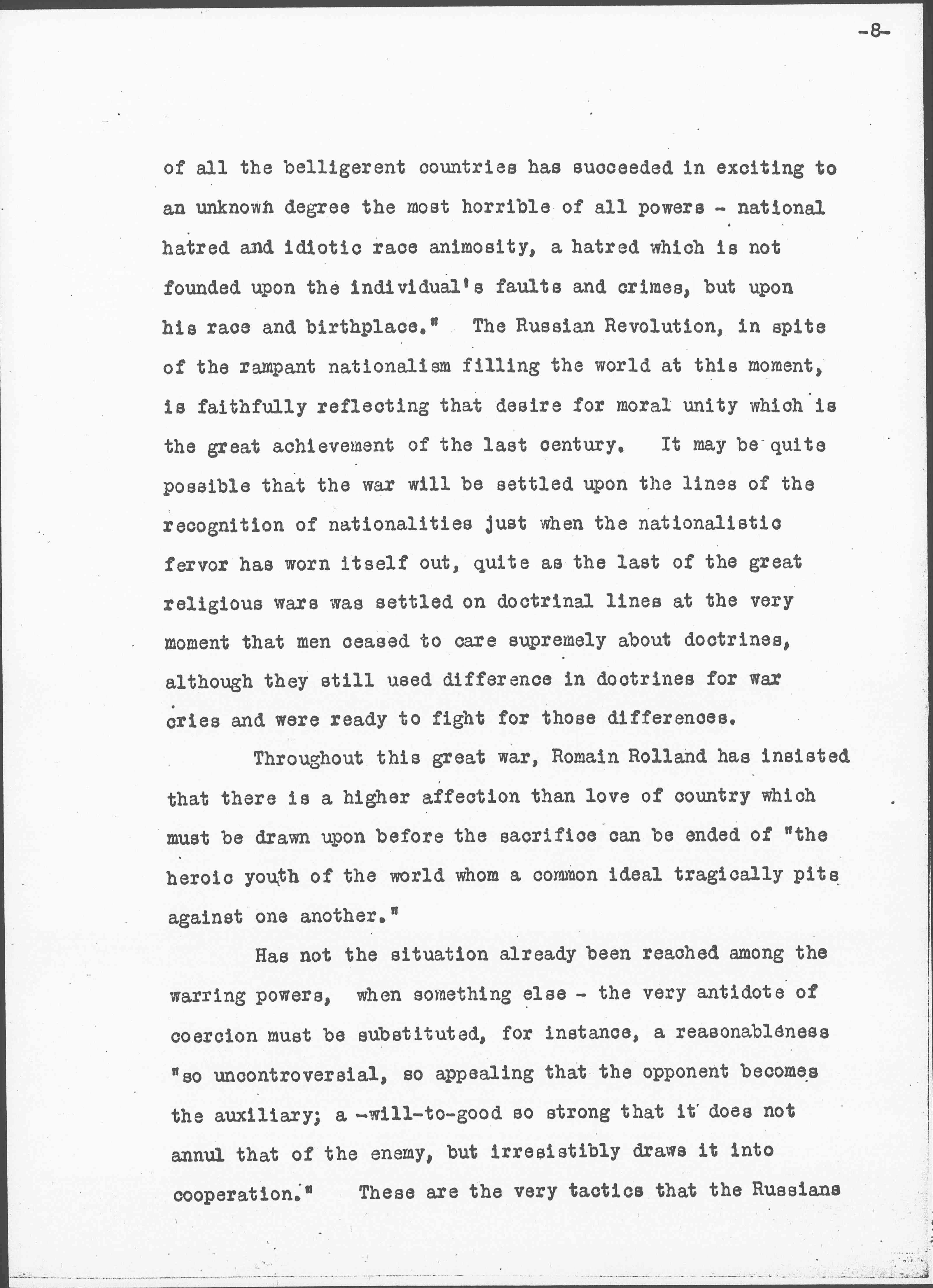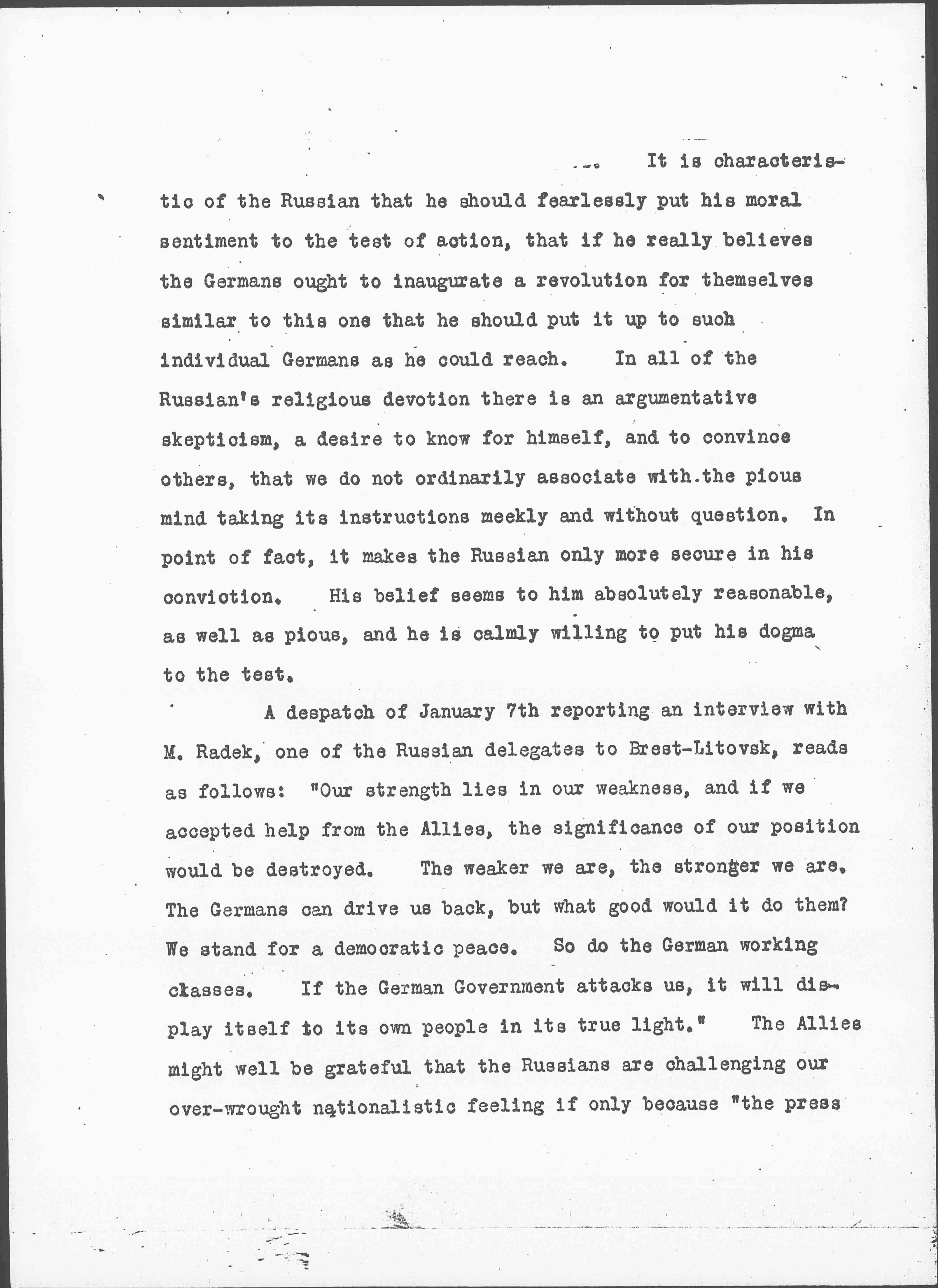 As [dispatch] of January 7th reporting an interview with M. Radek, one of the Russian delegates to Brest-Litovsk, reads as follows: "Our strength lies in our weakness, and if we accepted help from the Allies, the significance of our position would be destroyed. The weaker we are, the stronger we are. The Germans can drive us back, but what good would it do them? We stand for a democratic peace. So do the German working classes. If the German Government attacks us, it will display itself to its own people in its true light." The Allies might well be grateful that the Russians are challenging our over-wrought nationalistic feeling if only because "the press [page 7] of all the belligerent countries has succeeded in exciting to an unknown degree the most horrible of all powers -- national hatred and idiotic race animosity, a hatred which is not founded upon the individual's faults and crimes, but upon his race and birthplace." The Russian Revolution, in spite of the rampant nationalism filling the world at this moment, is faithfully reflecting that desire for moral unity which is the great achievement of the last century. It may be quite possible that the war will be settled upon the lines of the recognition of nationalities just when the nationalistic fervor has worn itself out, quite as the last of the great religious wars was settled on doctrinal lines at the very moment that men ceased to care supremely about doctrines, although they still used difference in doctrines for war cries and were ready to fight for those differences.