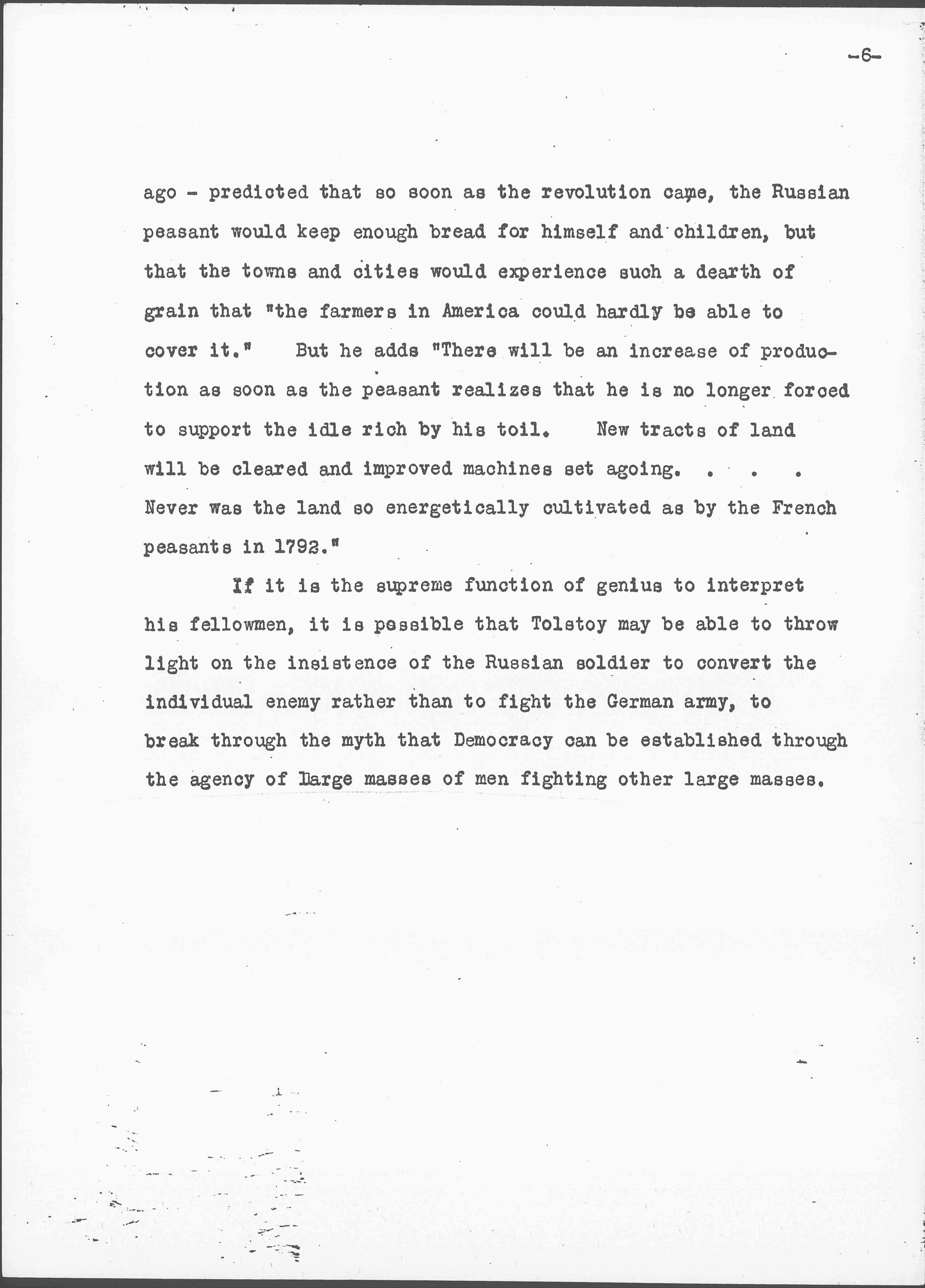 If it is the supreme function of genius to interpret his fellowmen, it is possible that Tolstoy may be able to throw light on the insistence of the Russian soldier to convert the individual enemy rather than to fight the German army, to break through the myth that Democracy can be established through the agency of large masses of men fighting other large masses. [page 6]