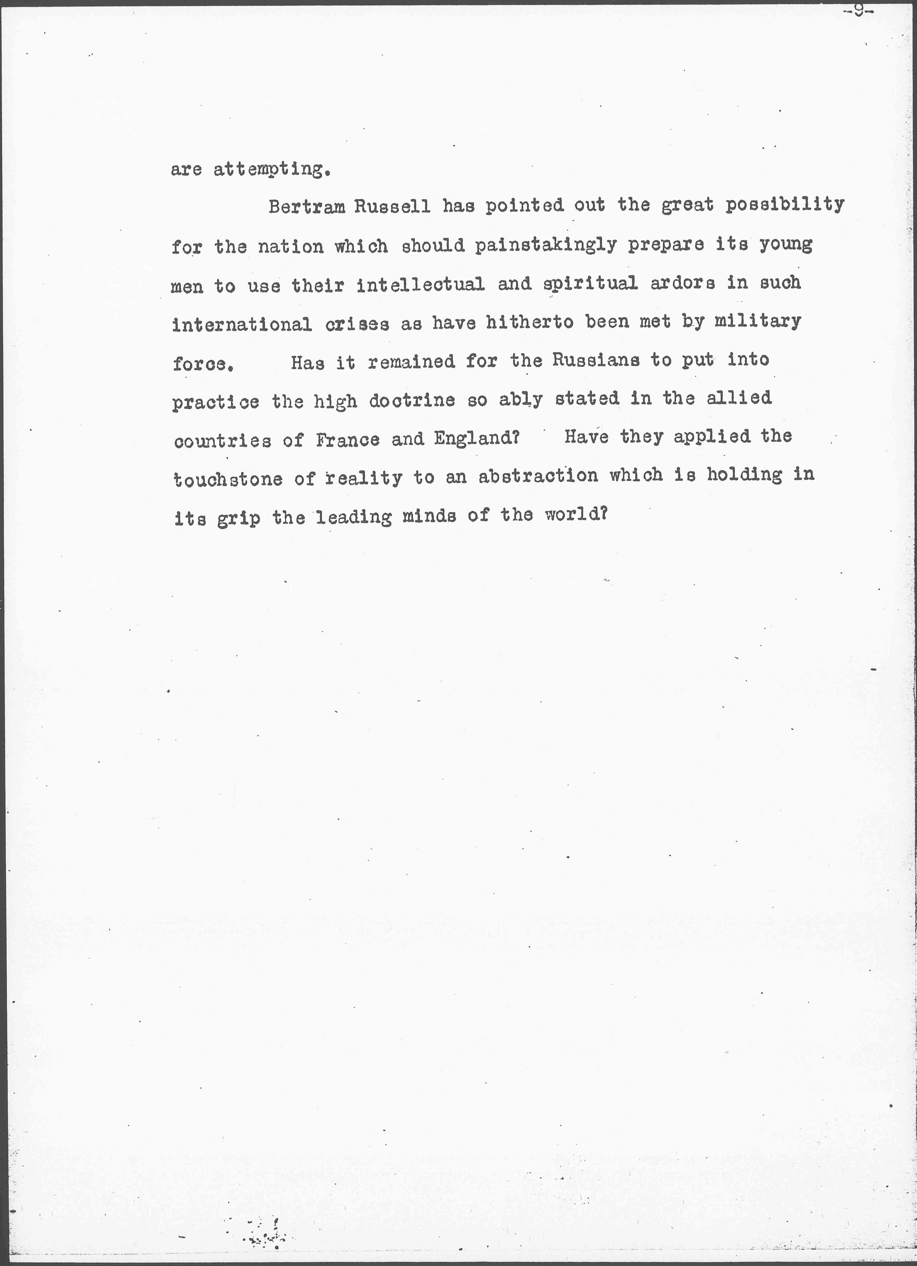[Bertrand] Russell has pointed out the great possibility for the nation which should painstakingly prepare its young men to use their intellectual and spiritual ardors in such international crises as have hitherto been met by military force. Has it remained for the Russians to put into practice the high doctrine so ably stated in the allied countries of France and England? Have they applied the touchstone of reality to an abstraction which is holding in its grip the leading minds of the world?