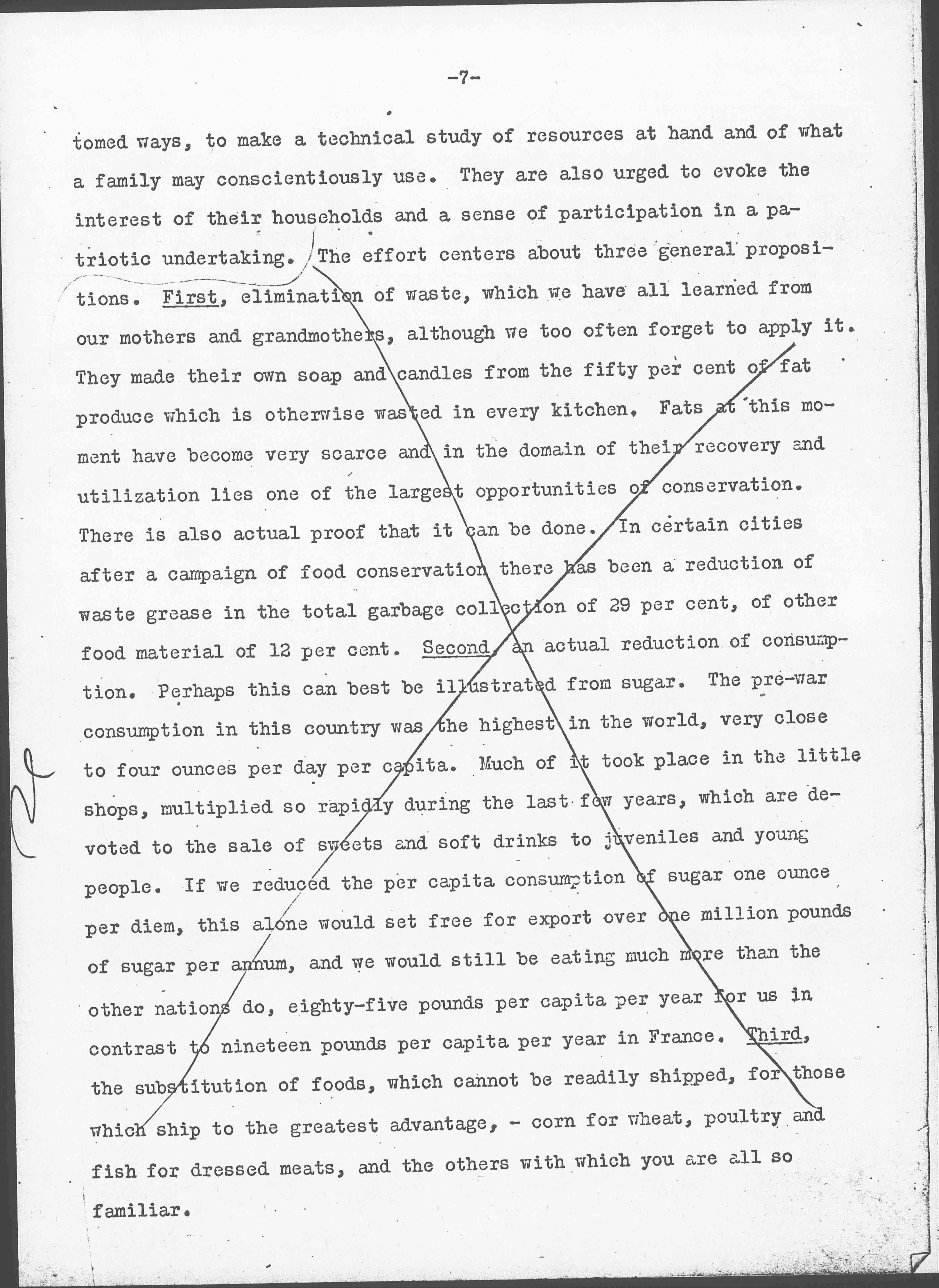 The women responsible for twenty-two millions of kitchens of the Nation are asked to give up certain old habits, to modify accustomed [page 7] ways, to make a technical study of resources at hand and of what a family may conscientiously use. They are also urged to evoke the interest of their households and a sense of participation in a patriotic undertaking. The effort centers about three general propositions. First, elimination of waste, which we have all learned from our mothers and grandmothers, although we too often forget to apply it. They made their own soap and candles from the fifty [percent] of fat produce which is otherwise wasted in every kitchen. Fats at this moment have become very scarce and in the domain of their recovery and utilization lies one of the largest opportunities of conservation. There is also actual proof that it can be done. In certain cities after a campaign of food conservation there has been a reduction of waste grease in the total garbage collection of 29 [percent], of other food material of 12 [percent]. Second, an actual reduction of consumption. Perhaps this can best be illustrated from sugar. The pre-war consumption in this country was the highest in the world, very close to four ounces per day per capita. Much of it took place in the little shops, multiplied so rapidly during the last few years, which are devoted to the sale of sweets and soft drinks to juveniles and young people. If we reduced the per capita consumption of sugar one ounce per diem, this alone would set free for export over one million pounds of sugar per annum, and we would still be eating much more than the other nations do, eighty-five pounds per capita per year for us in contrast to nineteen pounds per capita per year in France. Third, the substitution of foods, which cannot be readily shipped, for those which ship to the greatest advantage, -- corn for wheat, poultry and fish for dressed meats, and the others with which you are all so familiar. [page 8]