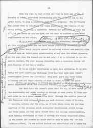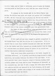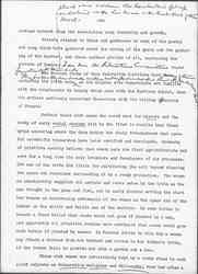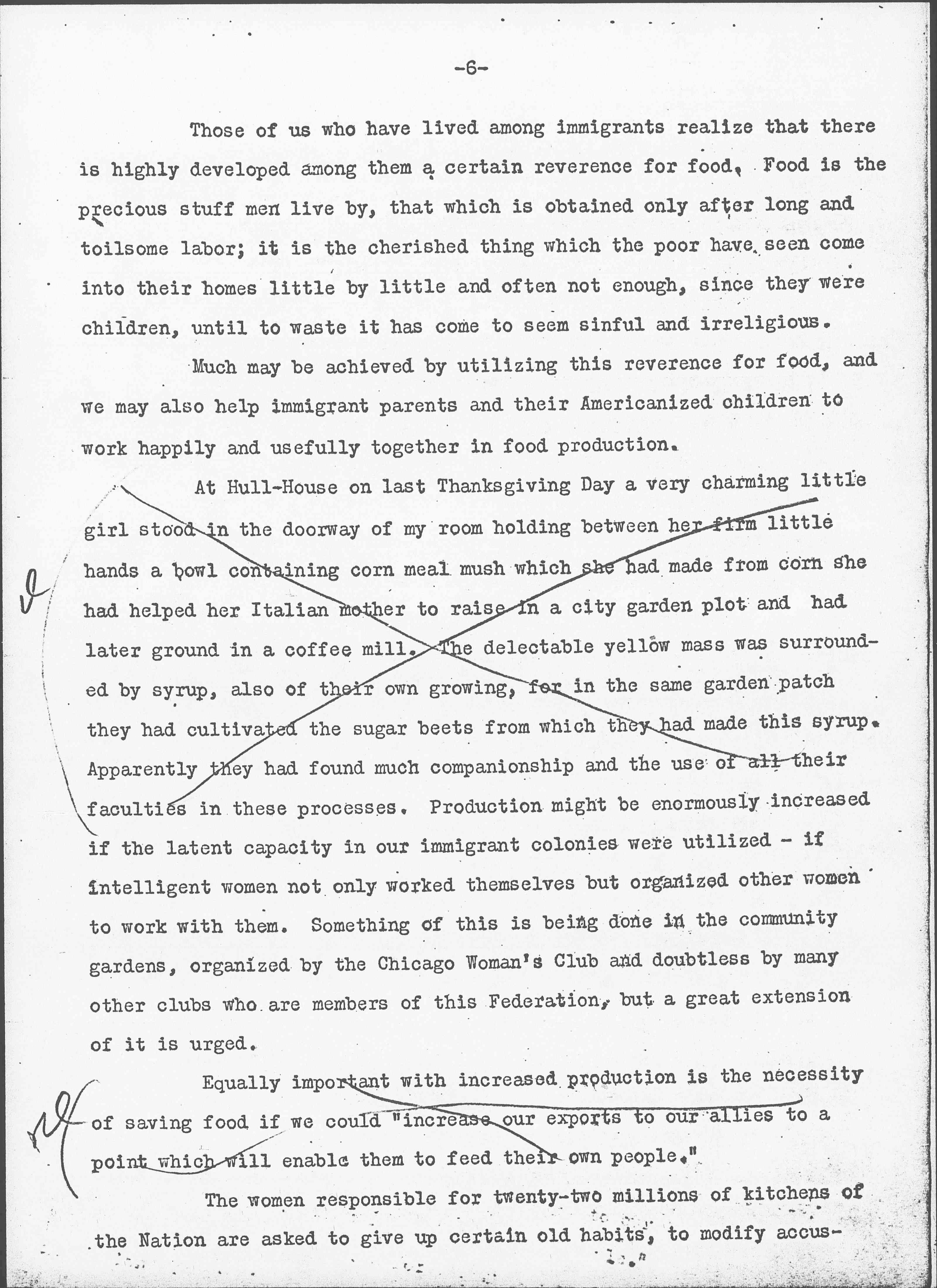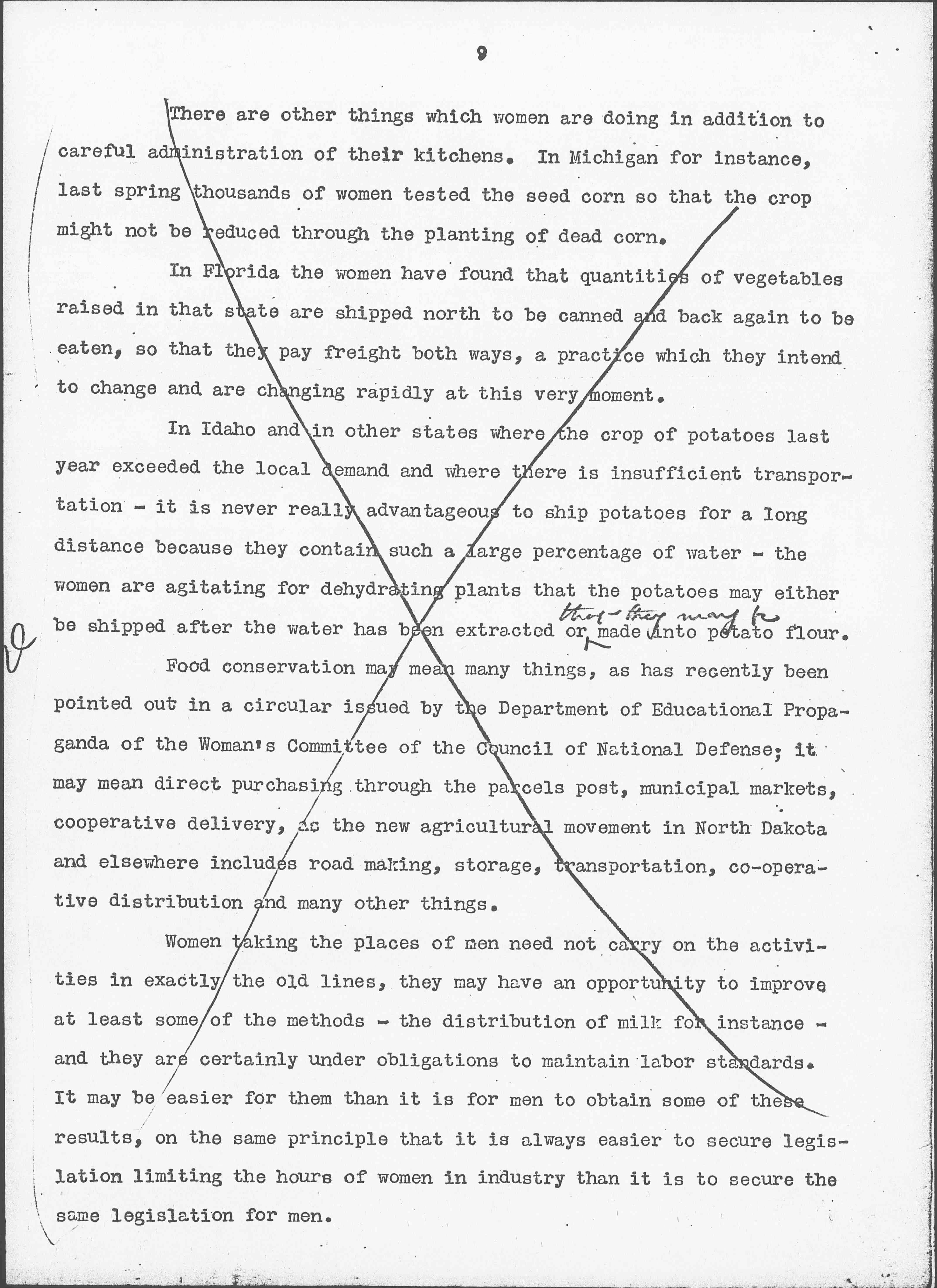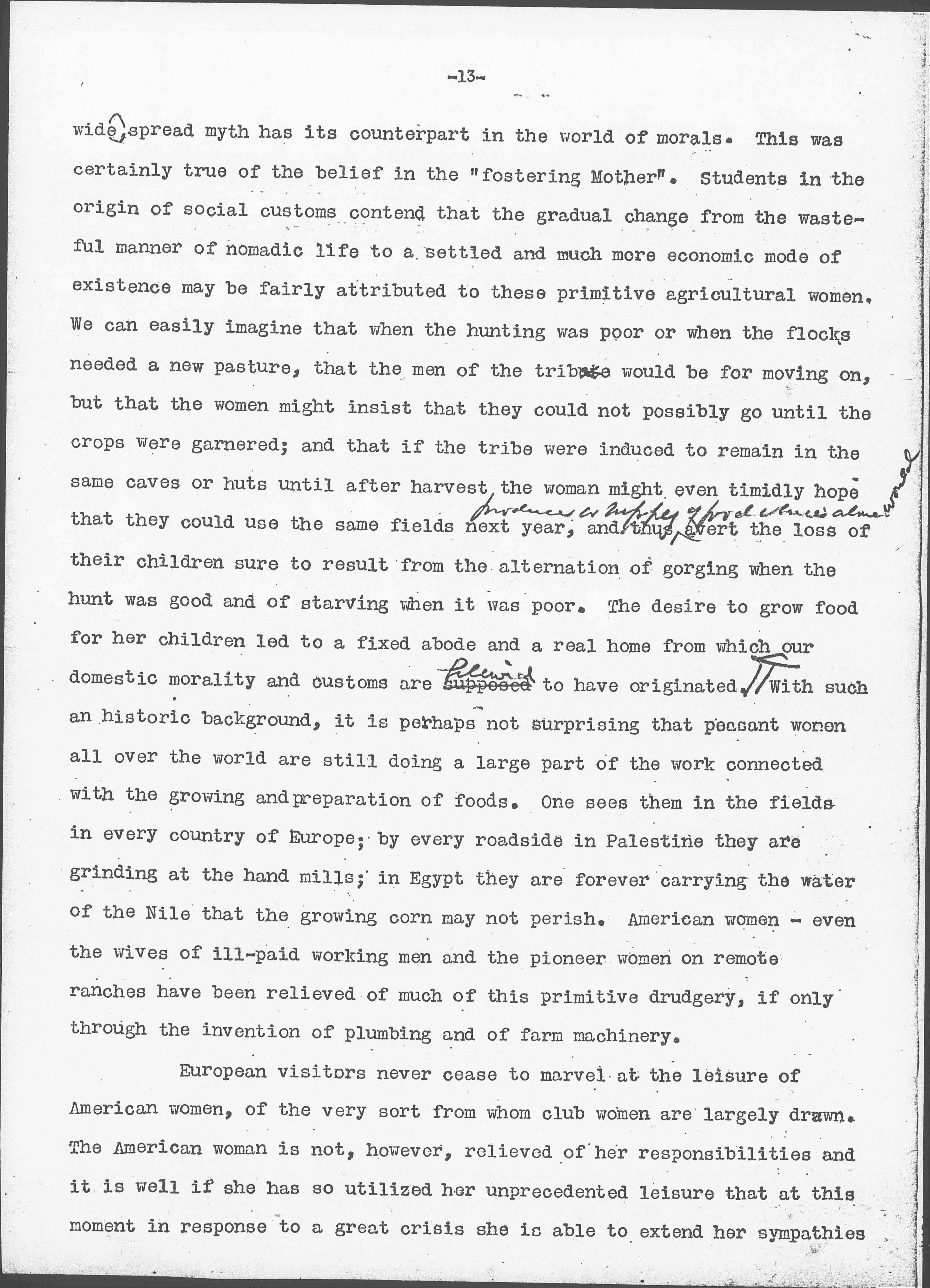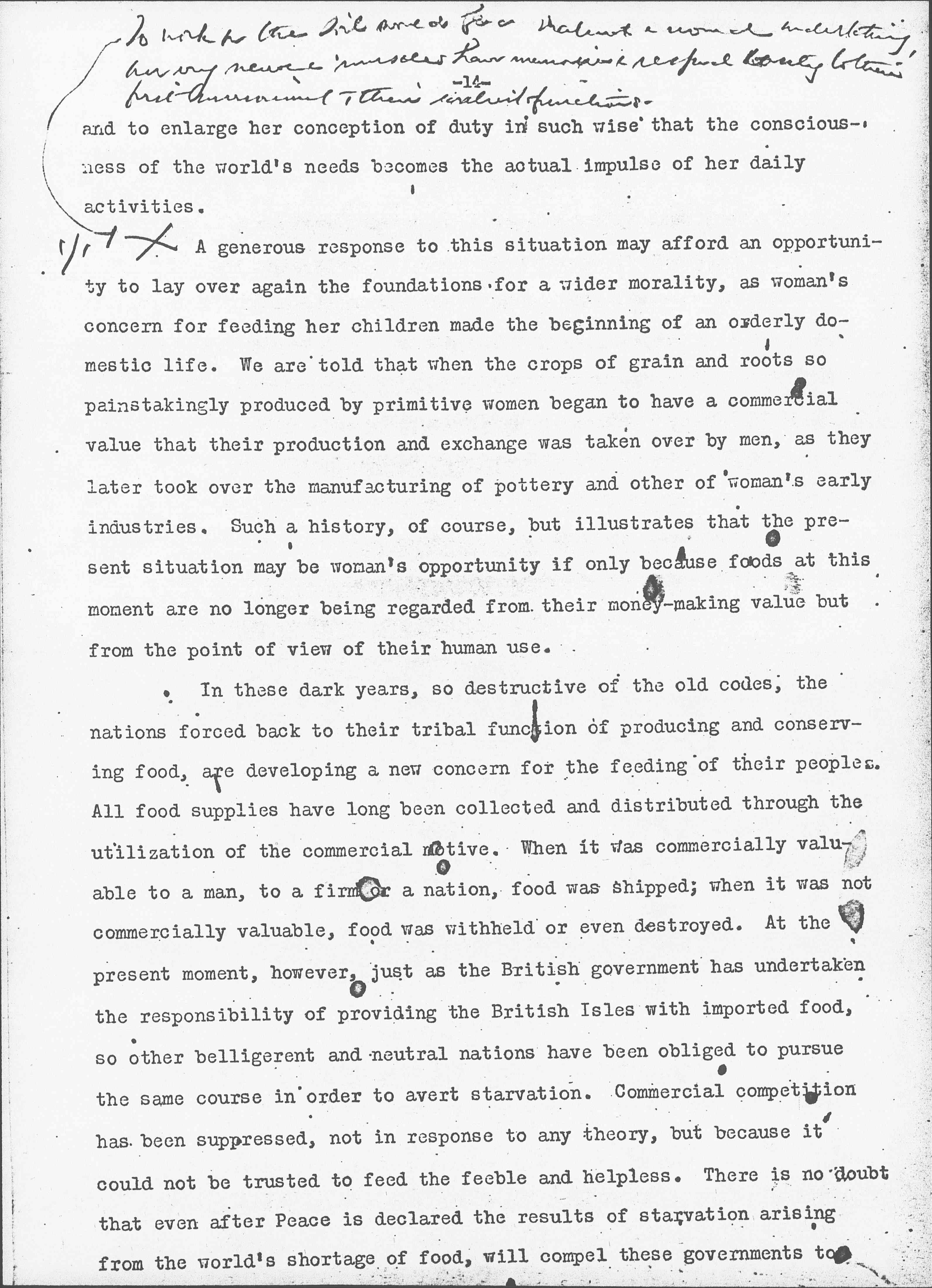 ↑To work [for?] the soil [could?] be a [valiant?] & sound undertaking, but every [two illegible words] have [illegible] respond [only?] to their first [illegible], their [illegible] functions.↓ A generous response to this situation may afford an opportunity to lay over again the foundations for a wider morality, as woman's concern for feeding her children made the beginning of an orderly domestic life. We are told that when the crops of grain and roots so painstakingly produced by primitive women began to have a commercial value that their production and exchange was taken over by men, as they later took over the manufacturing of pottery and other of woman's early industries. Such a history, of course, but illustrates that the present situation may be woman's opportunity if only because foods at this moment are no longer being regarded from their money-making value but from the point of view of their human use.