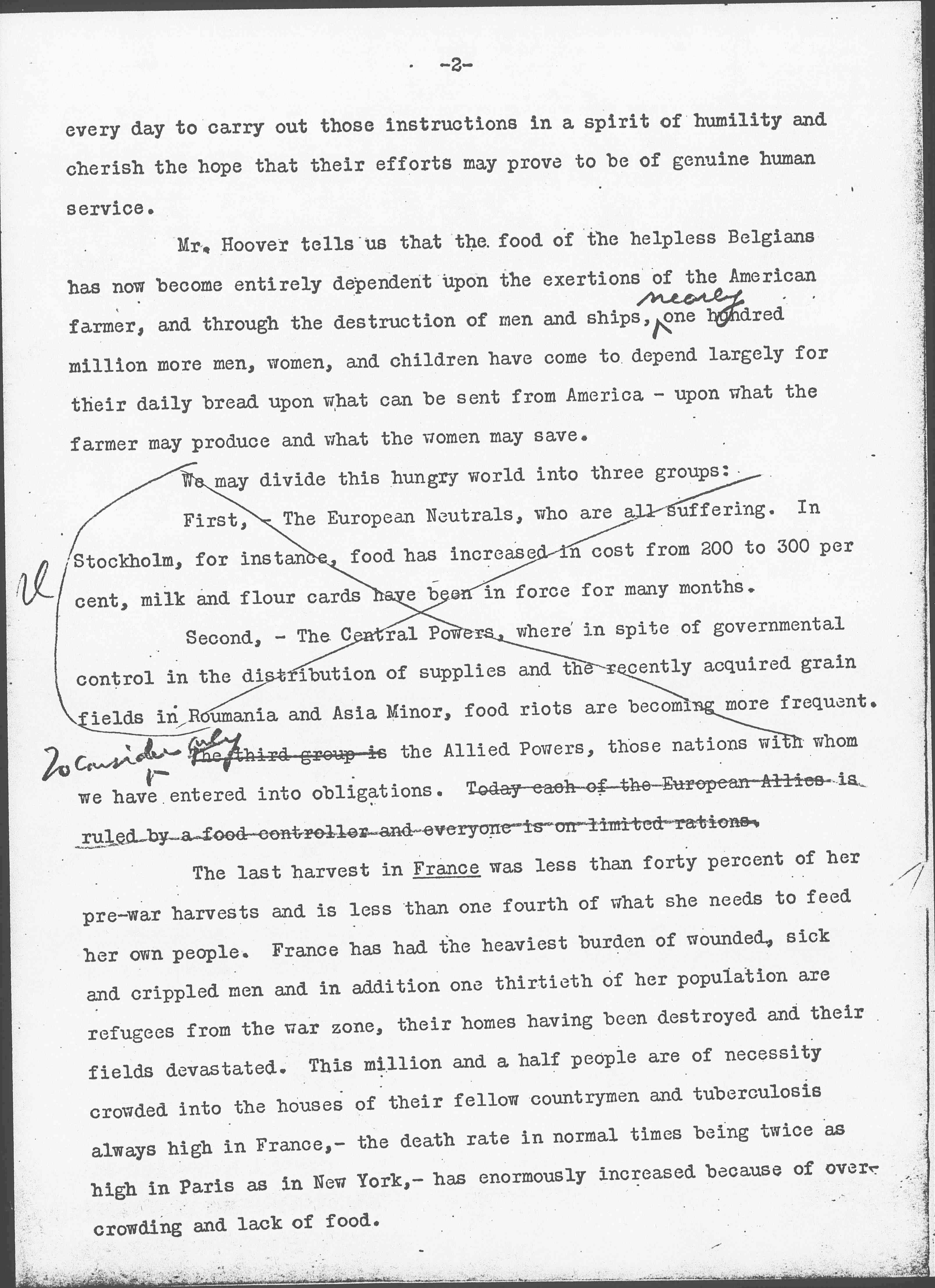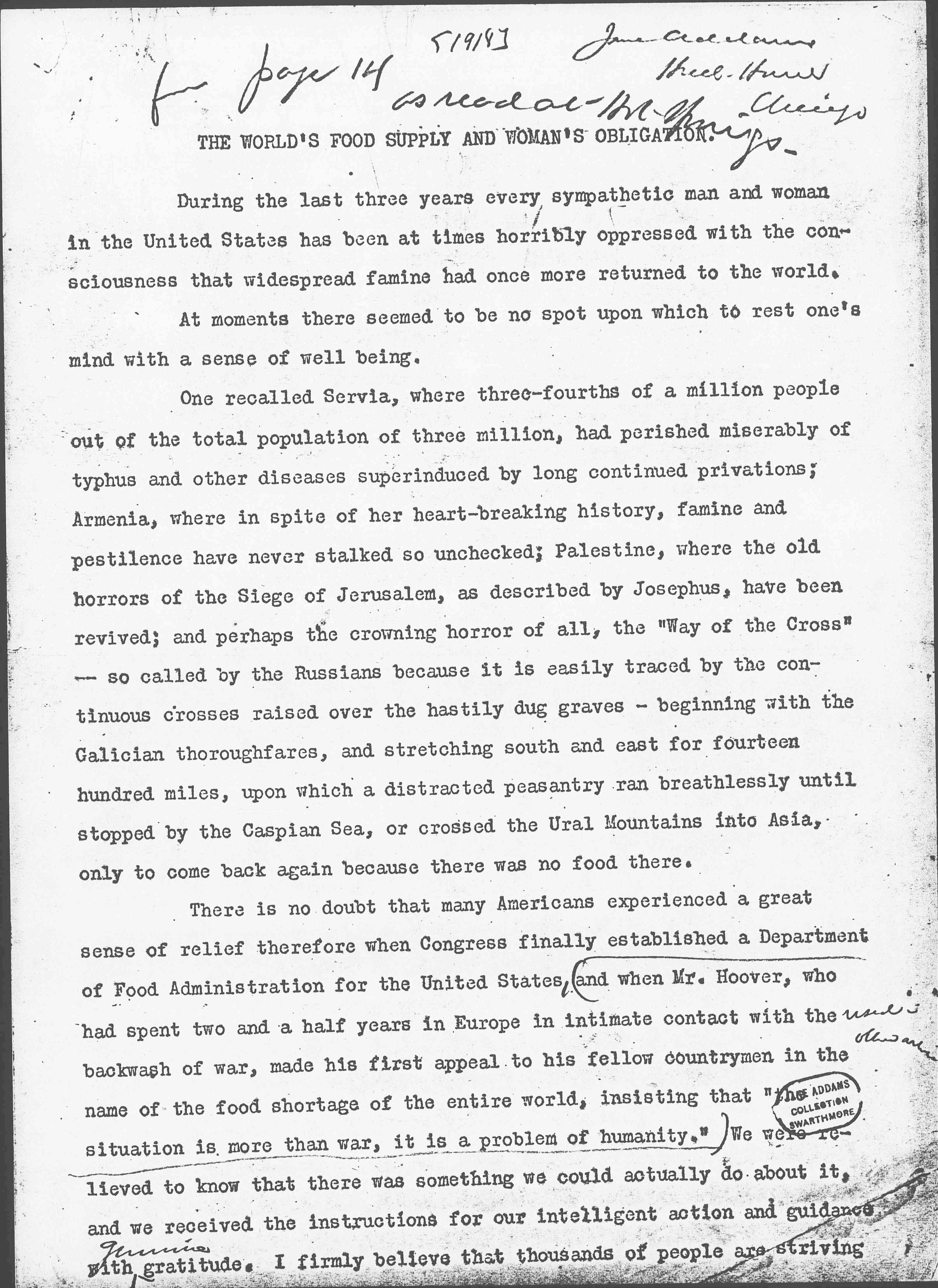 There is no doubt that many Americans experienced a great sense of relief therefore when Congress finally established a Department of Food Administration for the United States, ↑(↓and when Mr. Hoover, who had spent two and a half years in Europe in intimate contact with the backwash of war, made his first appeal to his fellow countrymen in the name of the food shortage of the entire world, insisting that "the situation is more than war, it is a problem of humanity."↑)↑ [written in right margin to identify parenthetical] ↑used in other address↓. We were relieved to know that there was something we could actually do about it, and we received the instructions for our intelligent action and guidance with ↑genuine↓ gratitude. I firmly believe that thousands of people are striving [page 2] every day to carry out those instructions in a spirit of humility and cherish the hope that their efforts may prove to be of genuine human service.