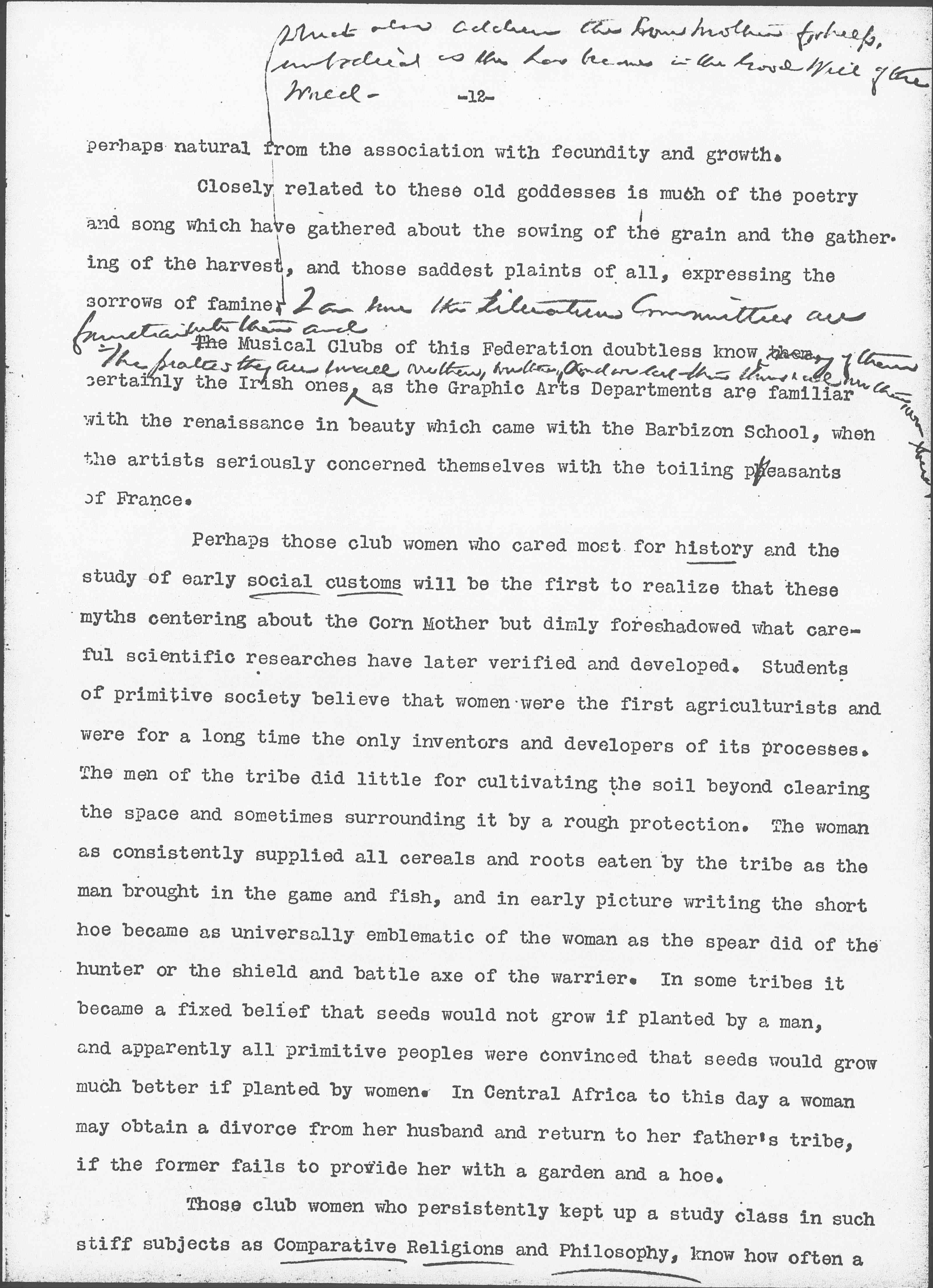 Closely related to these old goddesses is much of the poetry and song which have gathered about the sowing of the grain and the gathering of the harvest, and those saddest plaints of all, expressing the sorrows of famine. ↑Which also address the Corn Mother for help, embodied as she has become in the broad will of the world.↓ ↑I am sure the Literature Committees are familiar with them and↓ The Musical Clubs of this Federation doubtless know them ↑many of them↓ certainly the Irish ones. ↑The [illegible] they are small [illegible words], and we [cast them] & our [children spread them]↓ as the Graphic Arts Departments are familiar with the renaissance in beauty which came with the Barbizon School, when the artists seriously concerned themselves with the toiling peasants of France.