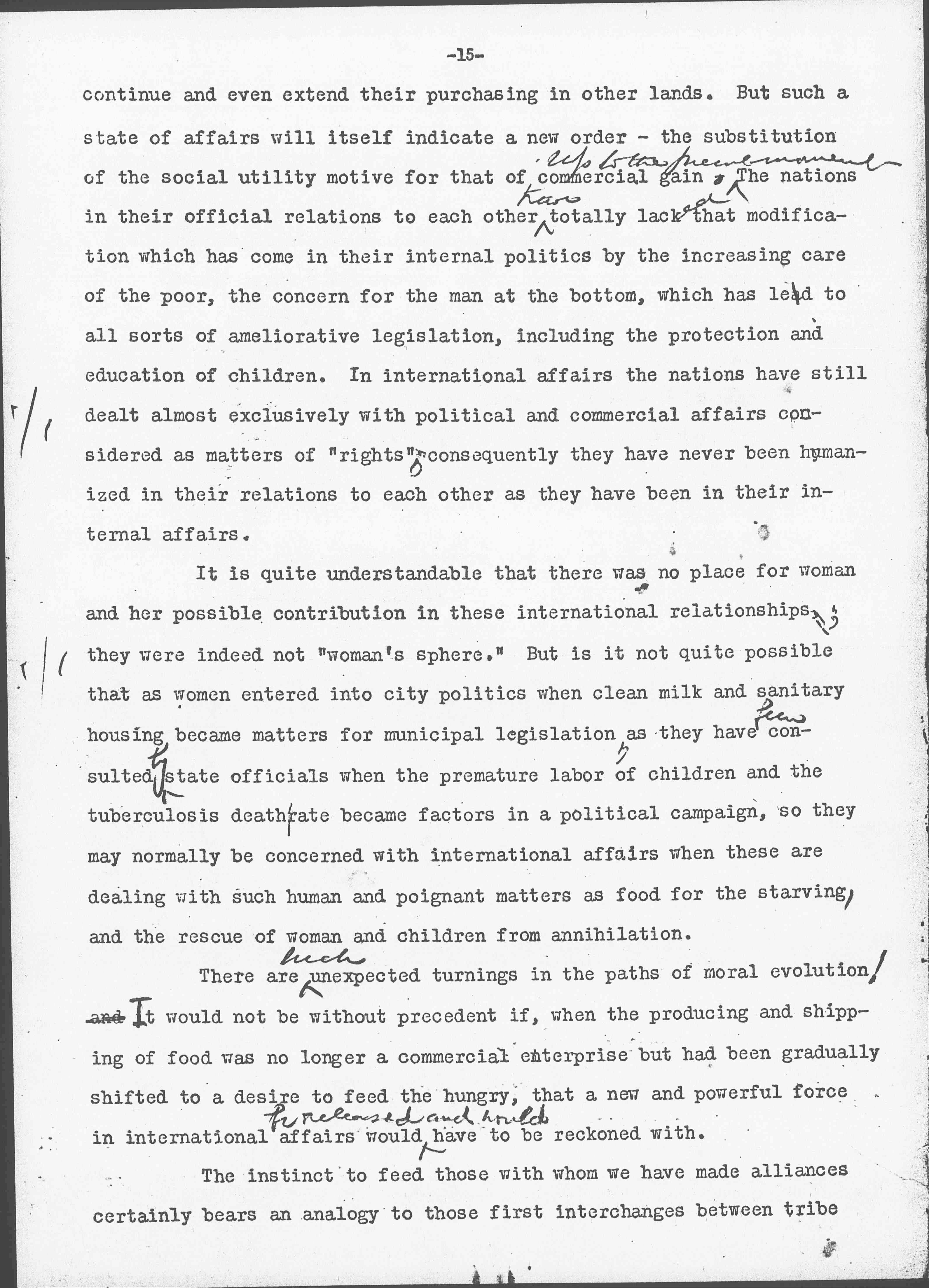 In these dark years, so destructive of the old codes, the nations forced back to their tribal function of producing and conserving food, are developing a new concern for the feeding of their peoples. All food supplies have long been collected and distributed through the utilization of the commercial motive. When it was commercially valuable to a man, to a firm or a nation, food was shipped; when it was not commercially valuable, food was upheld or even destroyed. At the present moment, however, just as the British government has undertaken the responsibility of providing the British Isles with imported food, so other belligerent and neutral nations have been obliged to pursue the same course in order to avert starvation. Commercial competition has been suppressed, not in response to any theory, but because it could not be trusted to feed the feeble and helpless. There is no doubt that even after Peace is declared the results of starvation arising from the world's shortage of food, will compel these governments to [page 15] continue and even extend their purchasing in other lands. But such a state of affairs will itself indicate a new order -- the substitution of the social utility motive for that of commercial gain ↑up to the present moment.↓ The nations in their official relations to each other ↑have↓ totally lacked that modification which has come in their internal politics by the increasing care of the poor, the concern for the man at the bottom, which has led to all sorts of ameliorative legislation, including the protection and education of children. In international affairs the nations have still dealt almost exclusively with political and commercial affairs considered as matters of "rights" consequently they have never been humanized in their relations to each other as they have been in their internal affairs.