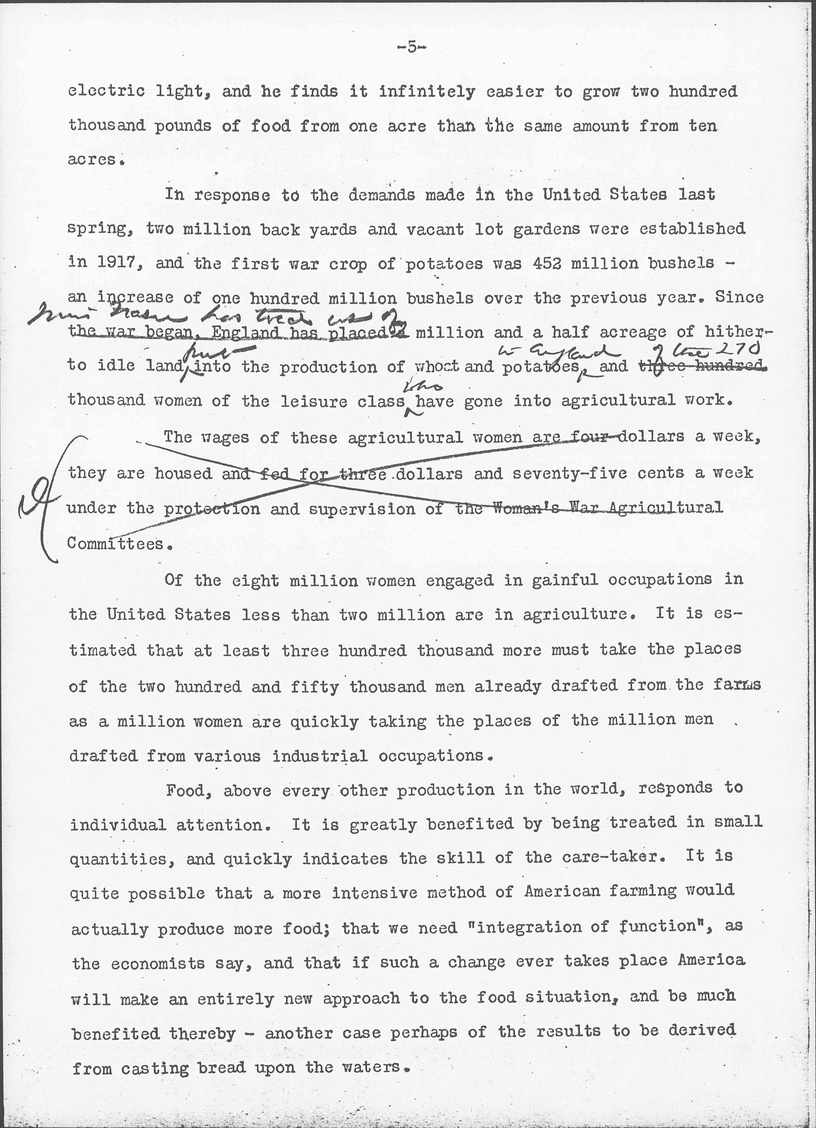 In response to the demands made in the United States last spring, two million back yards and vacant lot gardens were established in 1917, and the first war crop of potatoes was 452 million bushels -- an increase of one hundred million bushels over the previous year. Since the war began, England has placed ↑[Miss Frazer?] has told us of↓ a million and a half acreage of hitherto idle land ↑put↓ into the production of wheat and potatoes ↑in England↓, and three hundred ↑of the 270↓ thousand women of the leisure class ↑who↓ have gone into agricultural work.