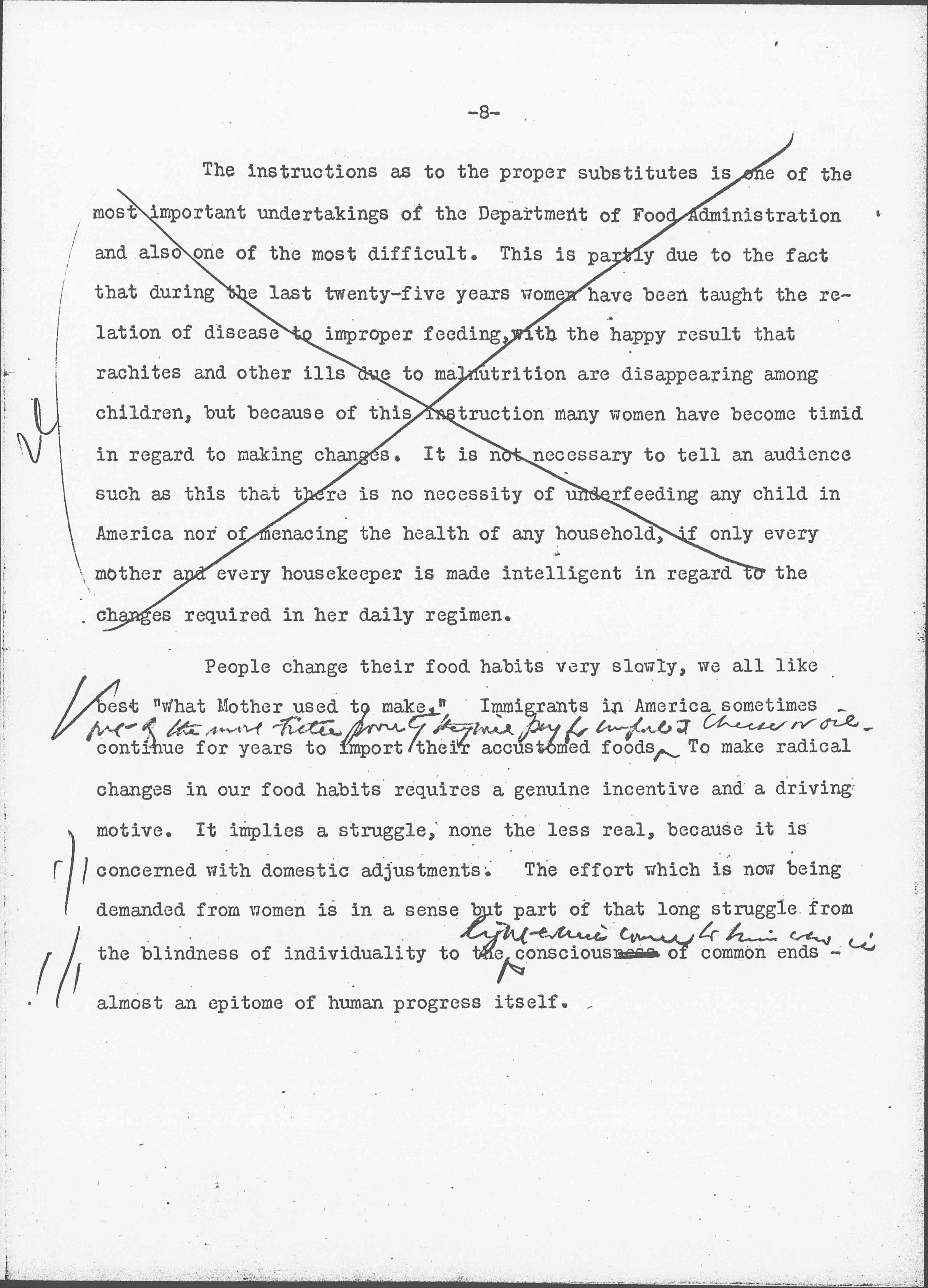 The instructions as to the proper substitutes is one of the most important undertakings of the Department of Food Administration and also one of the most difficult. This is partly due to the fact that during the last twenty-five years women have been taught the relation of disease to improper feeding, with the happy result that [rickets] and other ills due to malnutrition are disappearing among children, but because of this instruction many women have become more timid in regard to making changes. It is not necessary to tell an audience such as this that there is no necessity of underfeeding any child in America nor of menacing the health of any household, if only every mother and every housekeeper is made intelligent in regard to the changes required in her daily regimen.