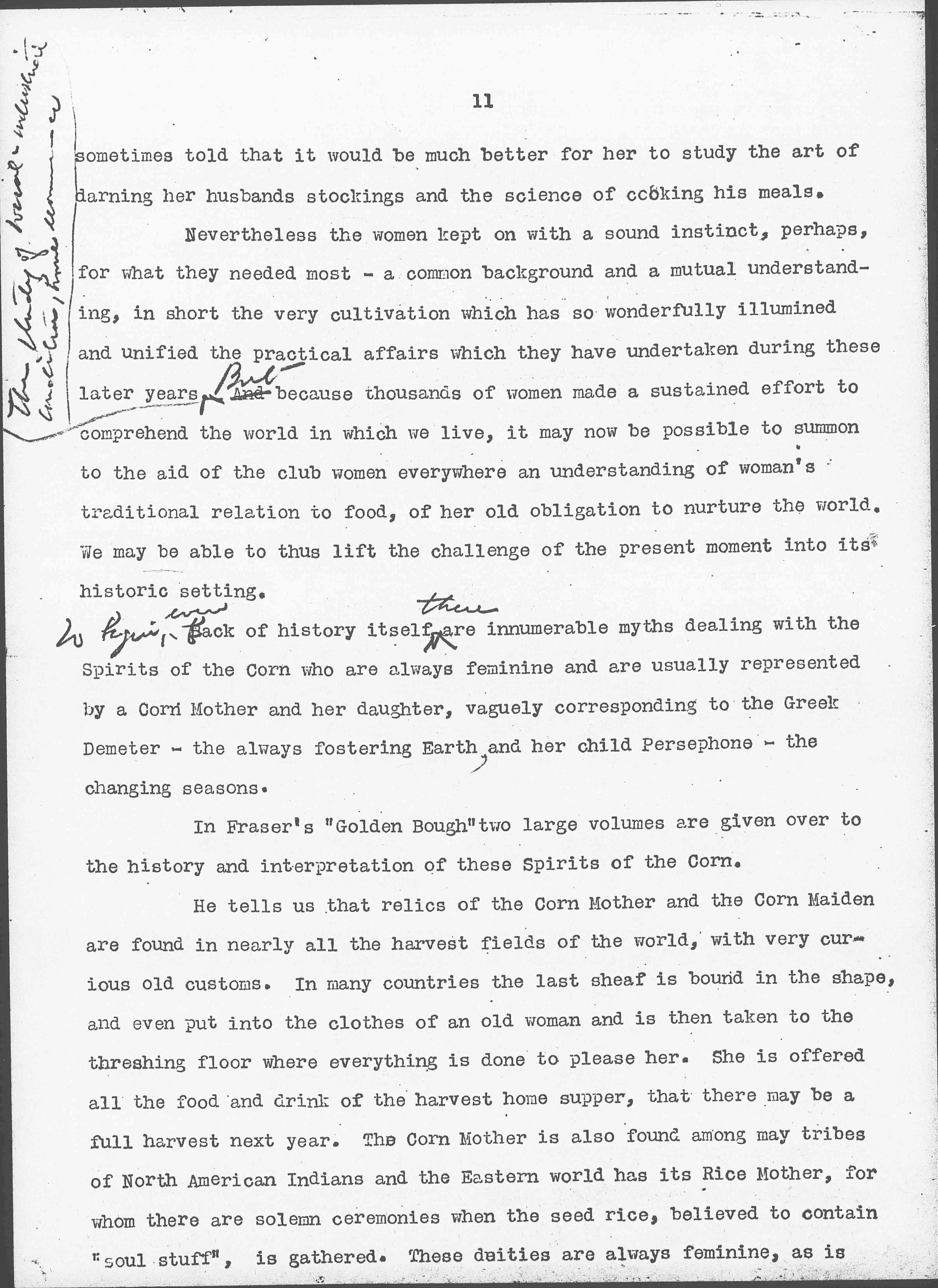 ↑To begin even↓ back of history itself ↑there↓ are innumerable myths dealing with the Spirits of the Corn who are always feminine and are usually represented by a Corn Mother and her daughter, vaguely corresponding to the Greek Demeter -- the always fostering Earth, and her child Persephone -- the changing seasons.
