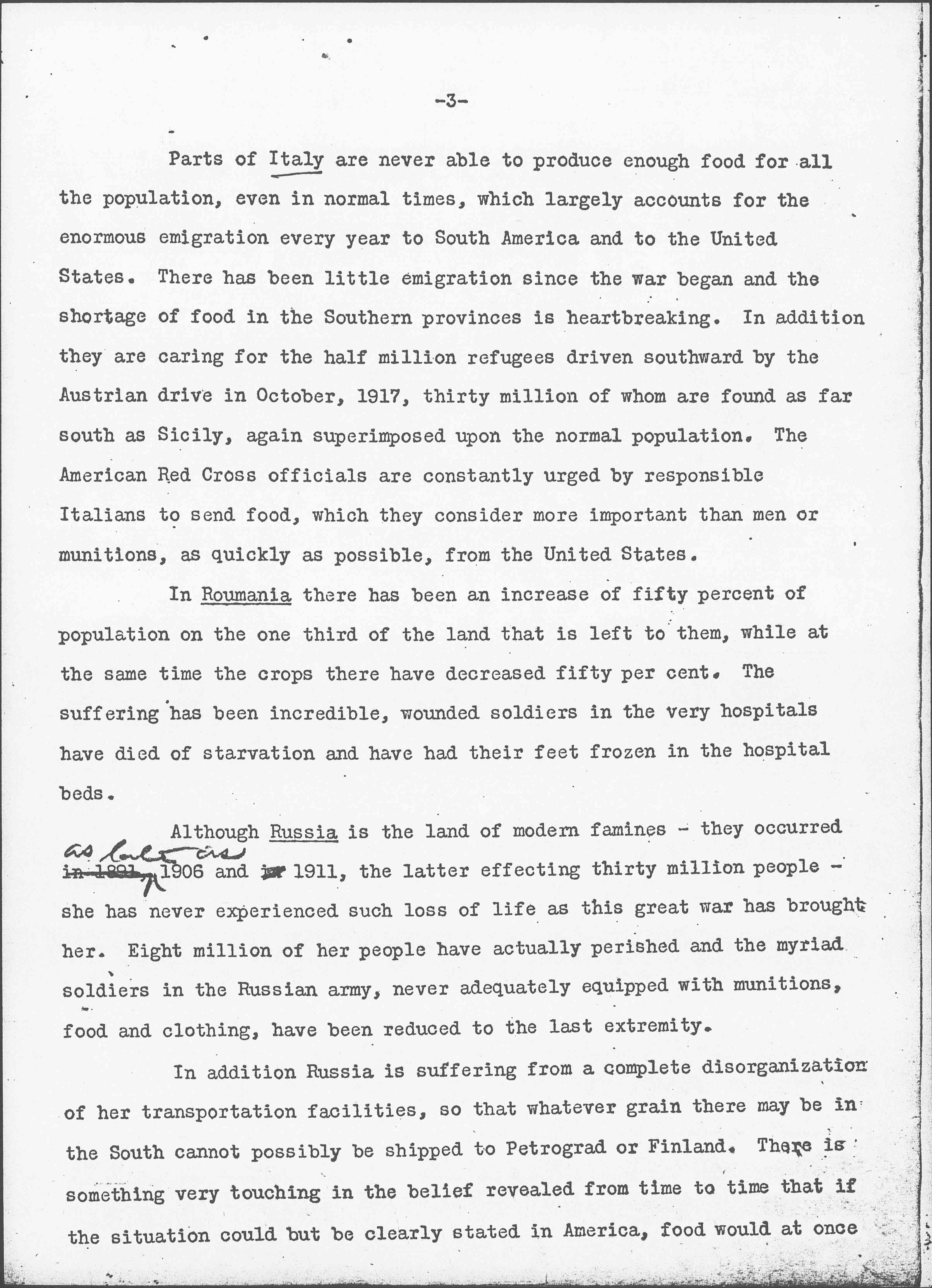 Although Russia is the land of modern famines -- they occurred in 1891, ↑as late as↓ 1906 and in 1911, the latter effecting thirty million people -- she has never experienced such loss of life as this great war has brought her. Eight million of her people have actually perished and the myriad soldiers in the Russian army, never adequately equipped with munitions, food and clothing, have been reduced to the last extremity.