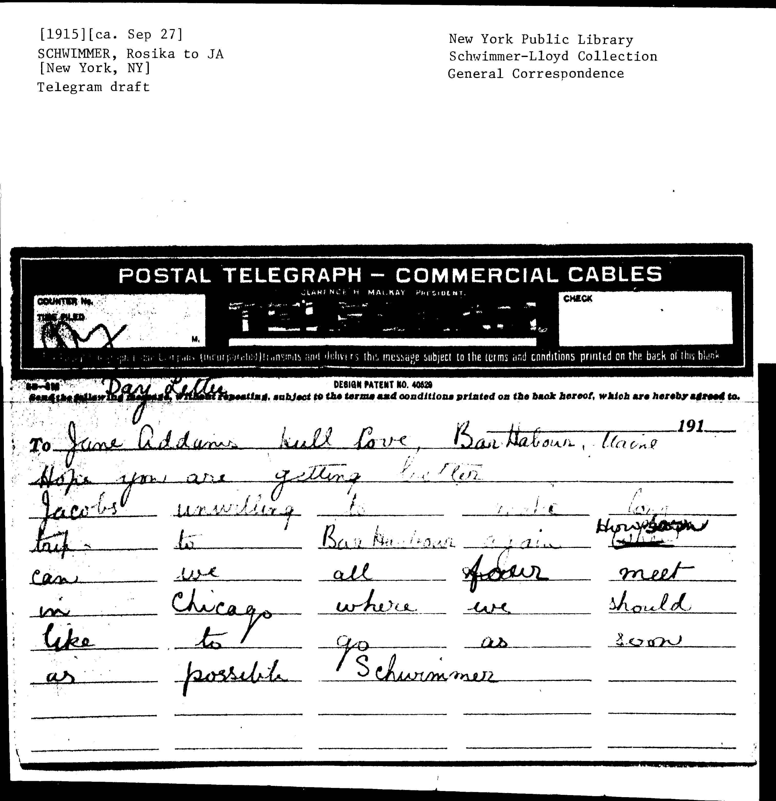 Jacobs unwilling to make long trip to Bar [Harbor] again [when] <How soon> can we all four meet in Chicago where we should like to go as soon as possible Schwimmer