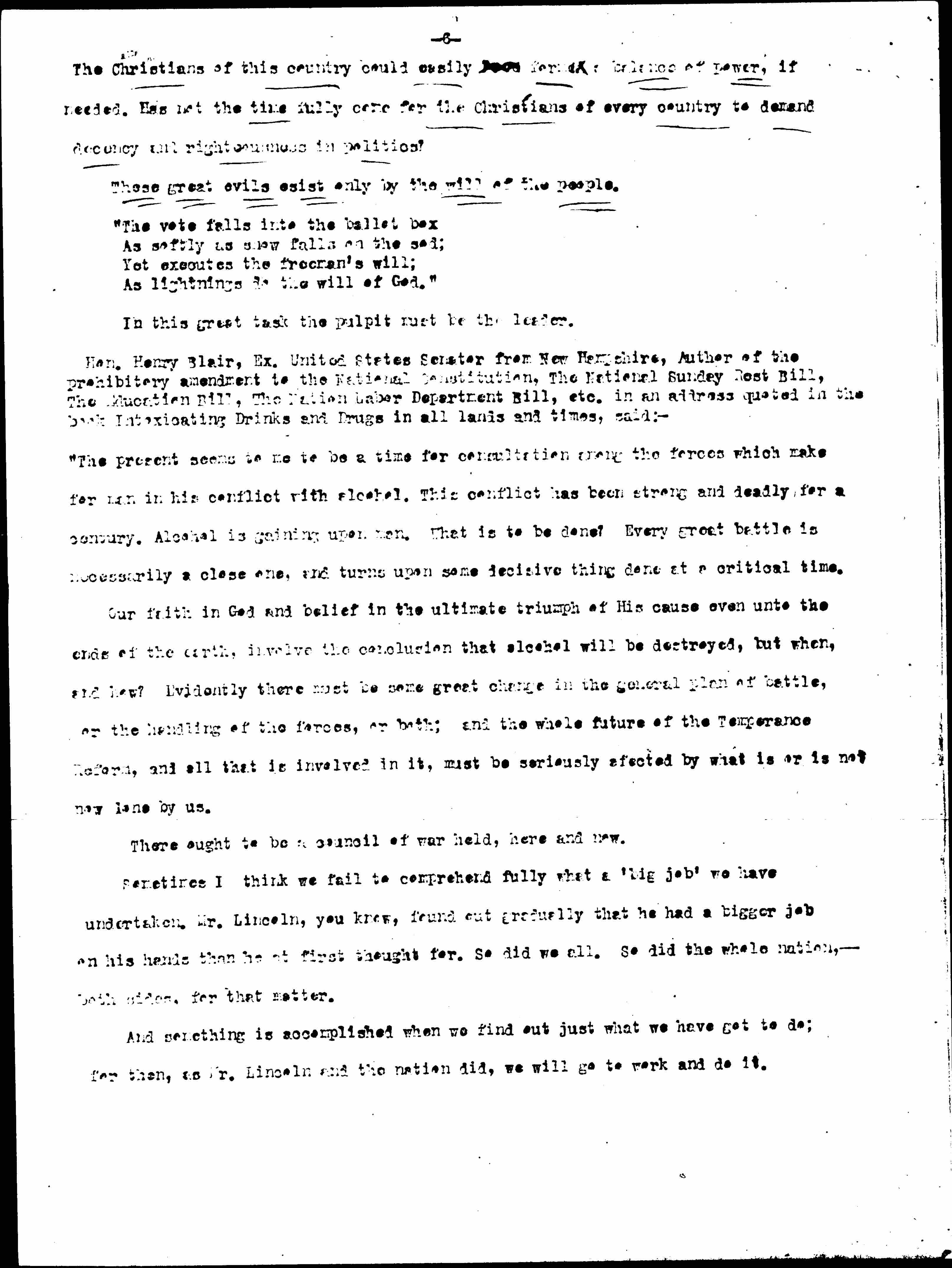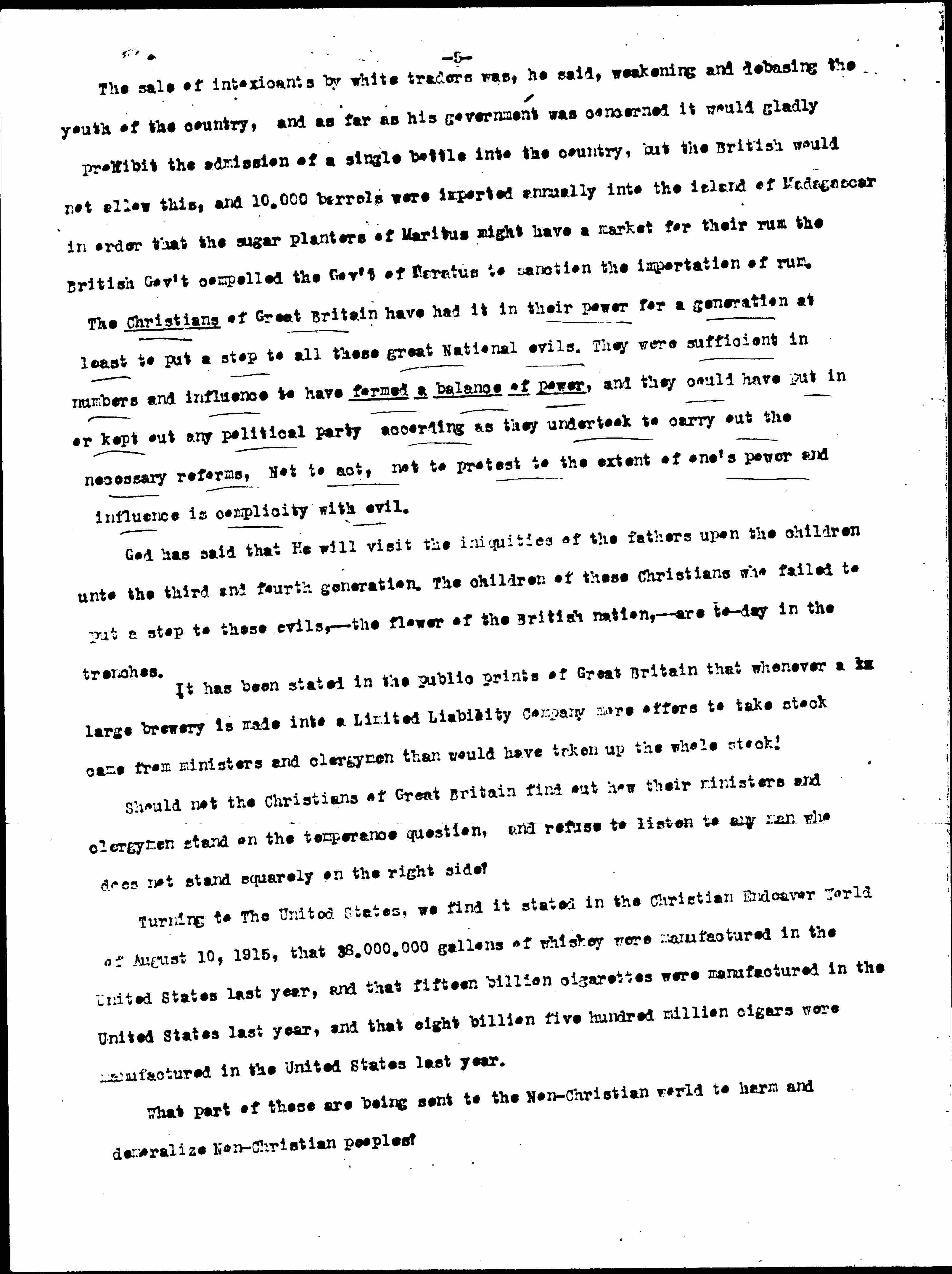 What part of these are being sent to the Non-Christian world to harm and demoralize Non-Christian peoples? [page 6] The Christians of this country could easily [illegible] [force the] balance of power, if needed. Has not the time fully come for the Christians of every country to demand decency and righteousness in politics?